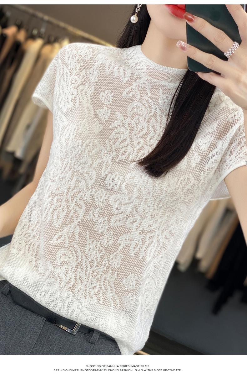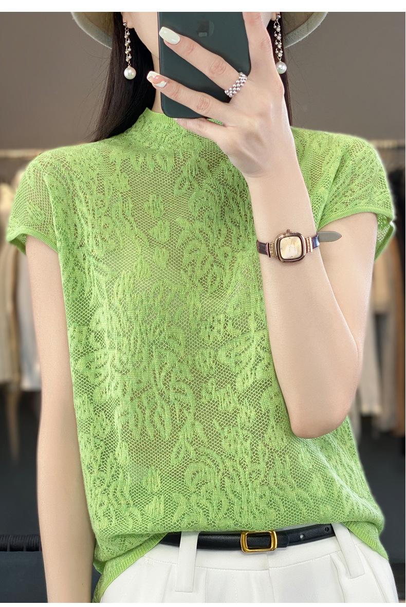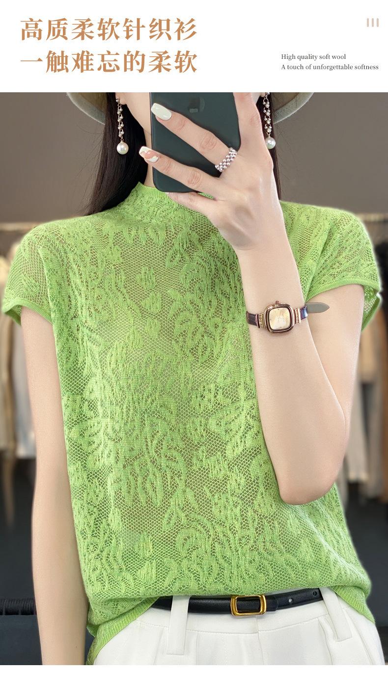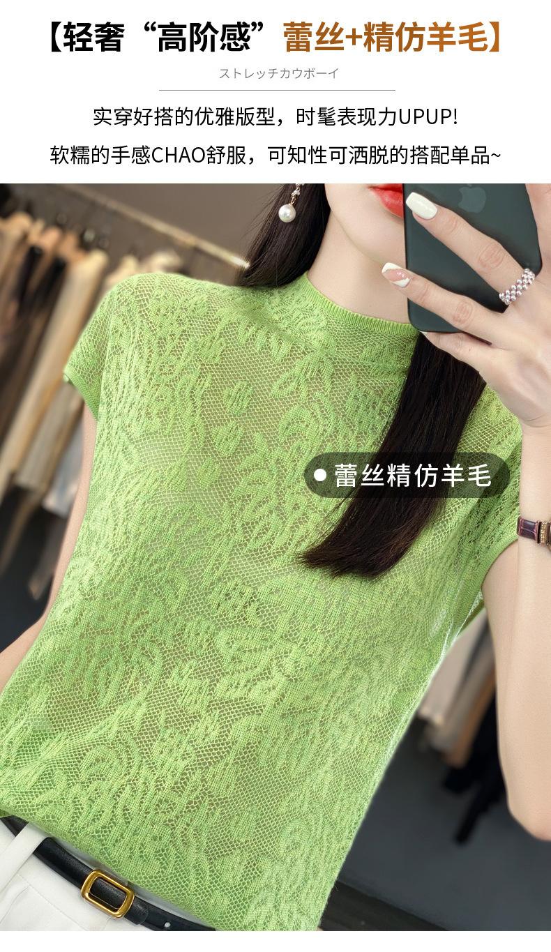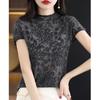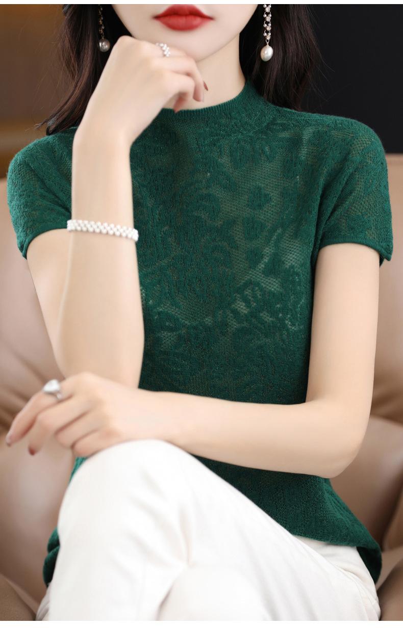 Suéter de lana peinada para mujer, novedad de verano 2023, camiseta de encaje de cuello medio alto y manga corta de estilo dulce