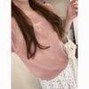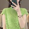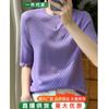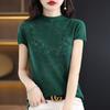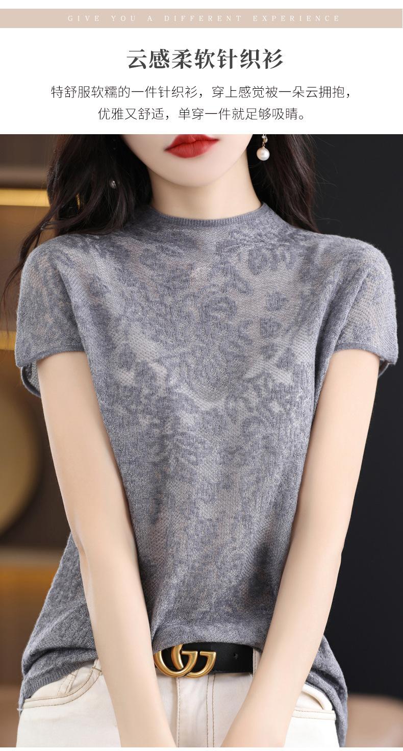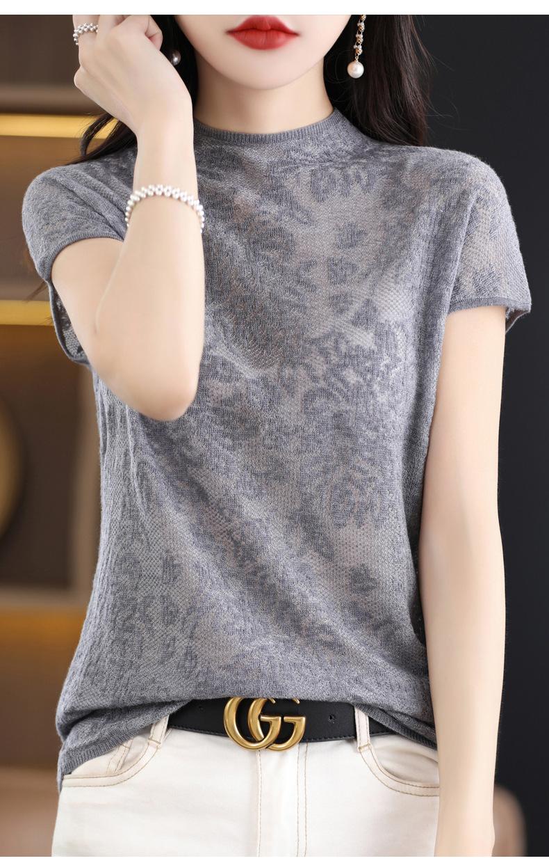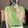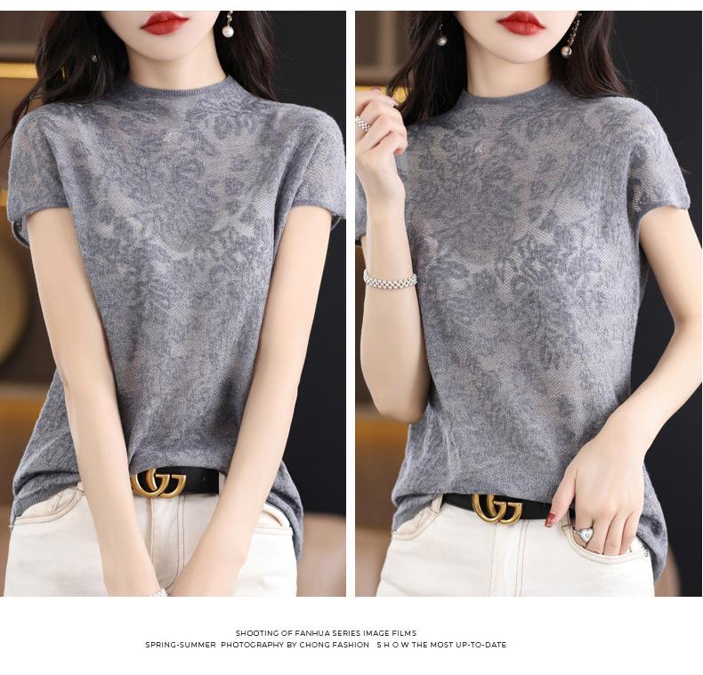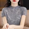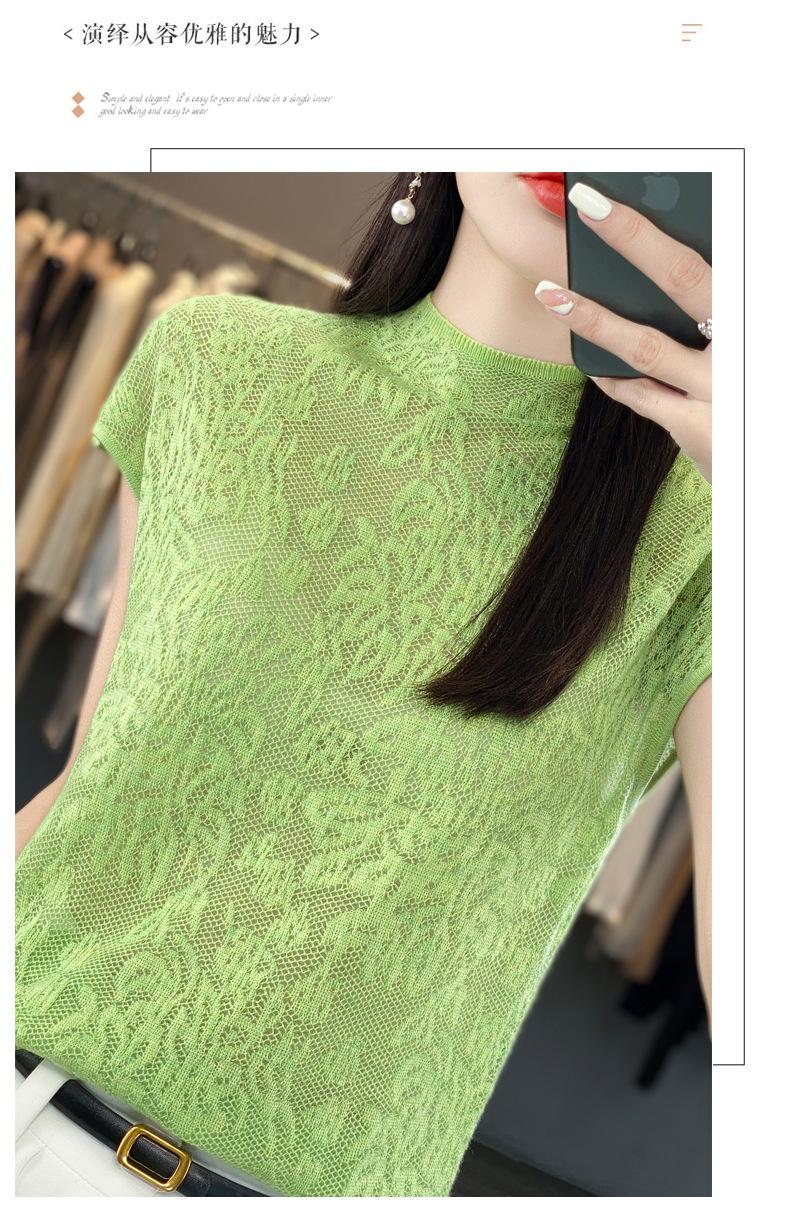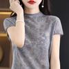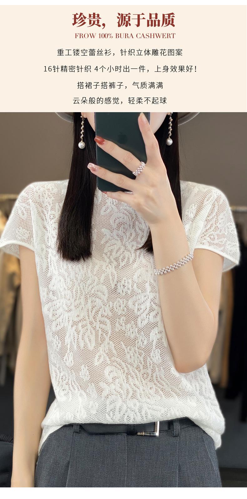 Suéter de lana peinada para mujer, novedad de verano 2023, camiseta de encaje de cuello medio alto y manga corta de estilo dulce