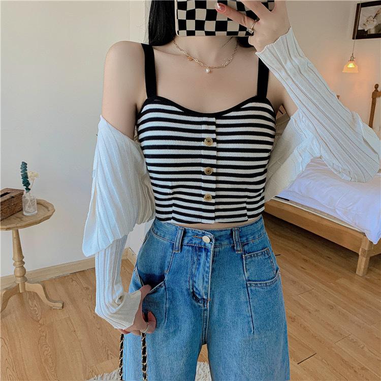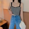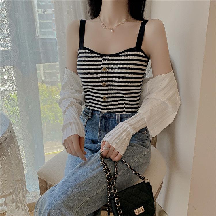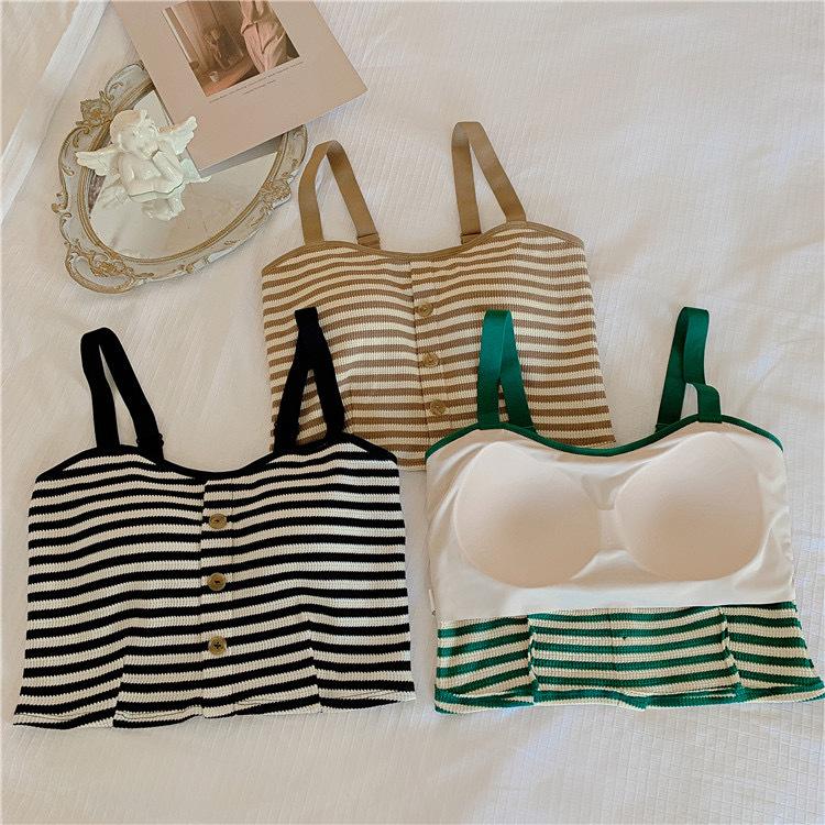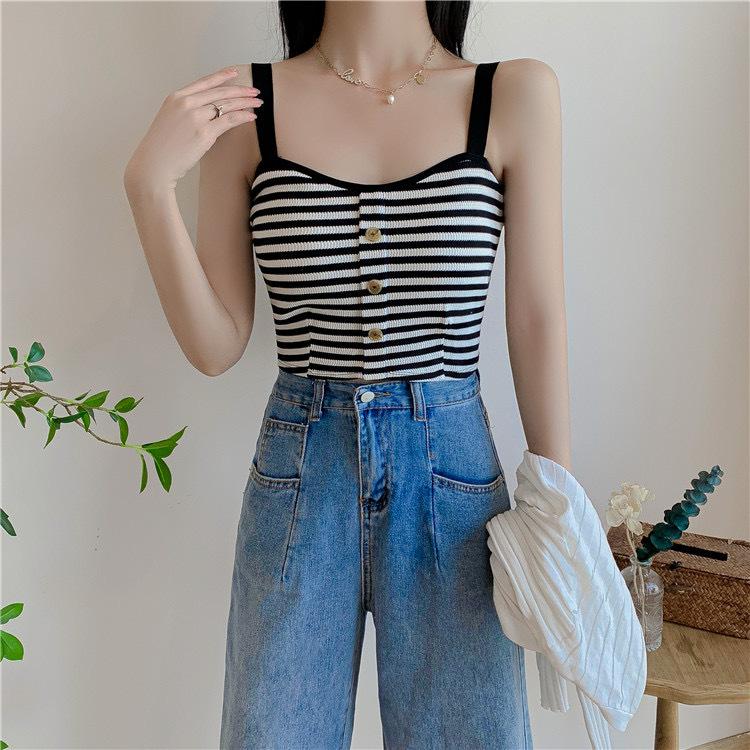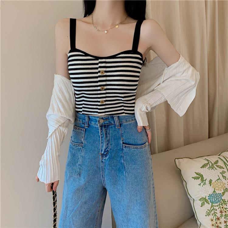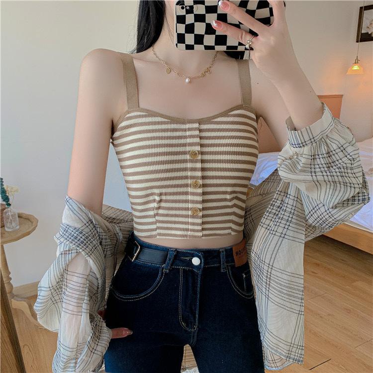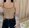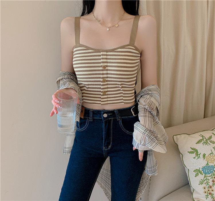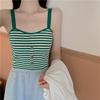 Camisola de otoño con botones a rayas para mujer, prenda exterior, corta, sin mangas, con base interior y almohadilla para el pecho