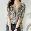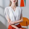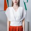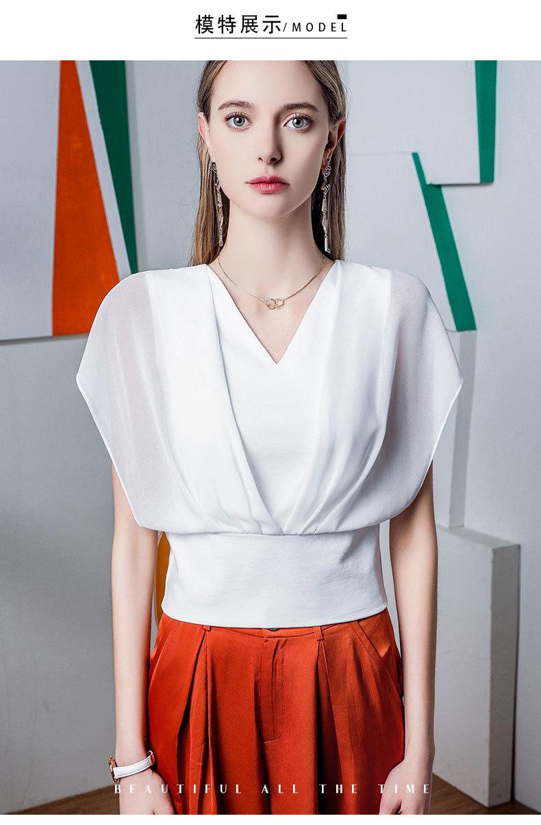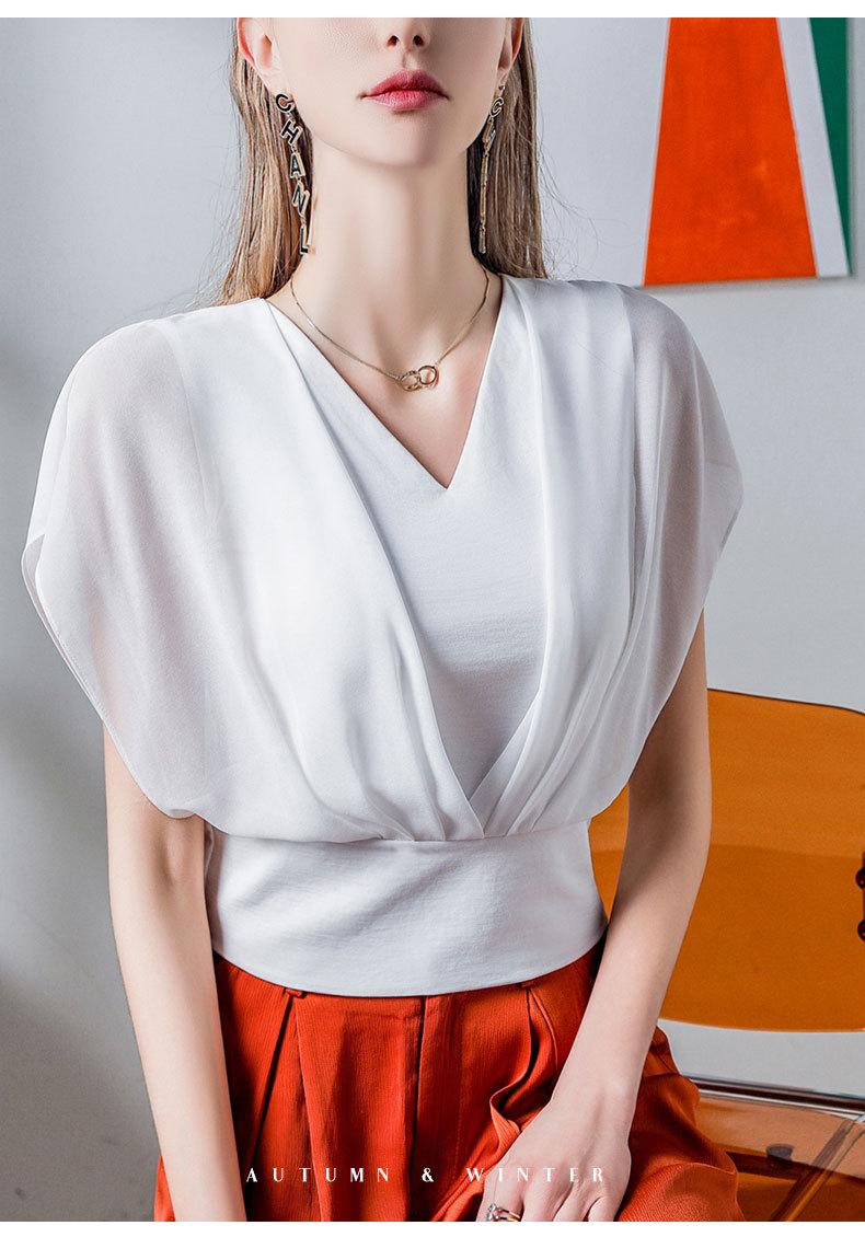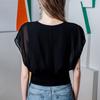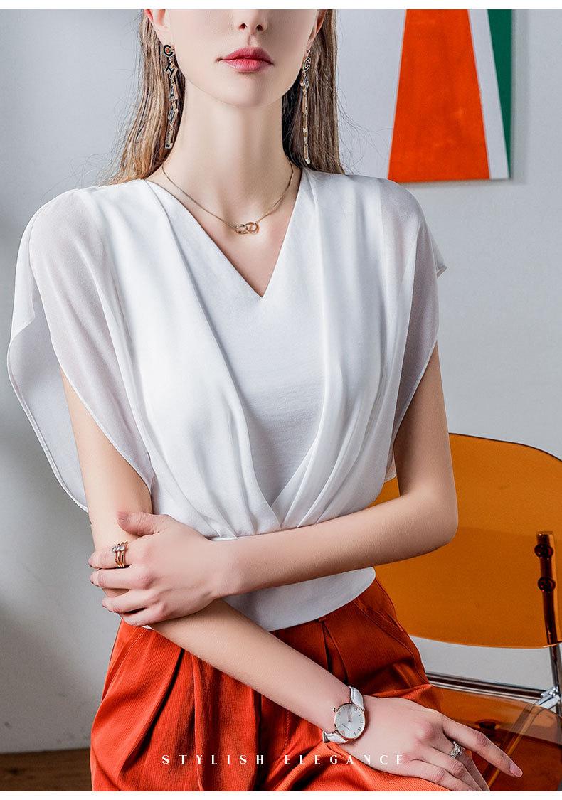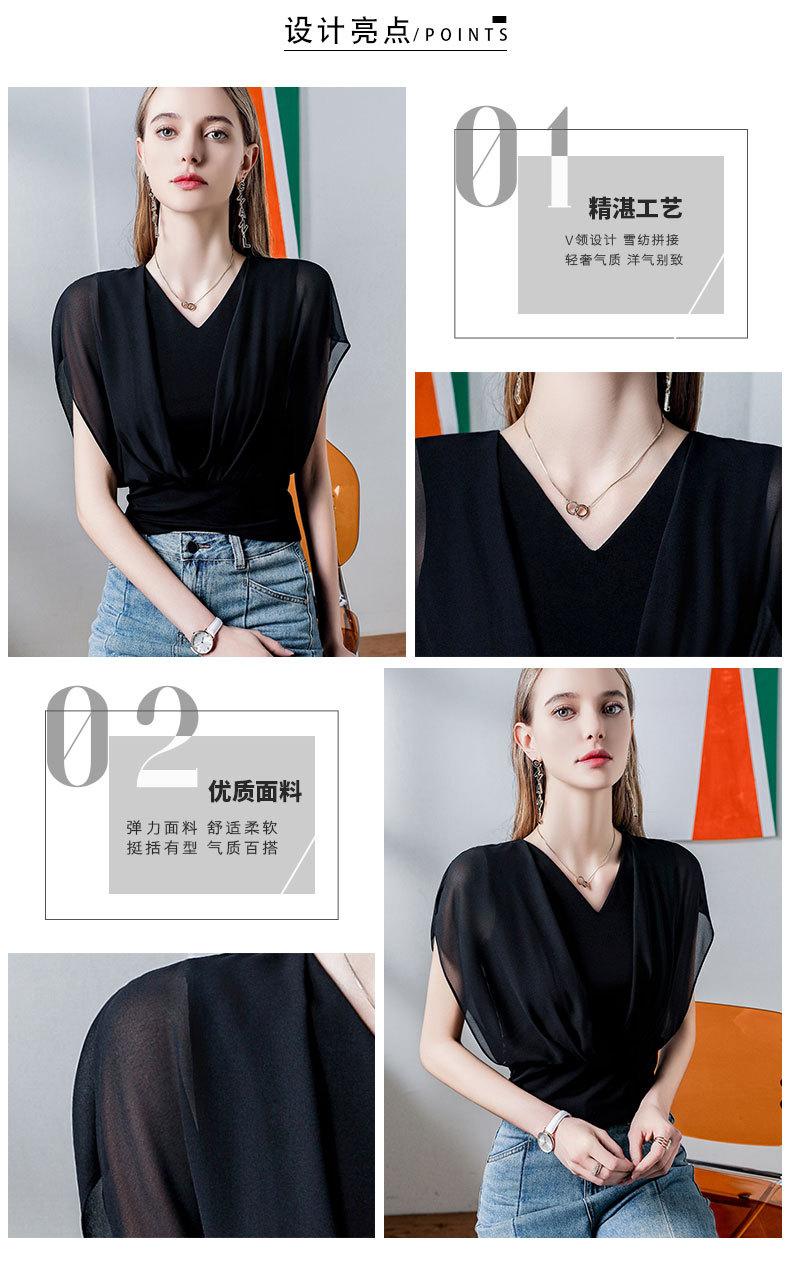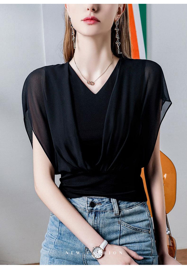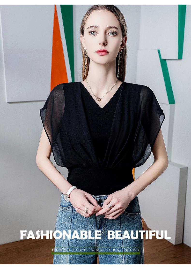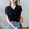 Blusa de gasa con costuras de imitación de dos piezas con cuello en V para mujer, manga murciélago, verano 2024, nueva moda, camiseta de manga corta para mujer