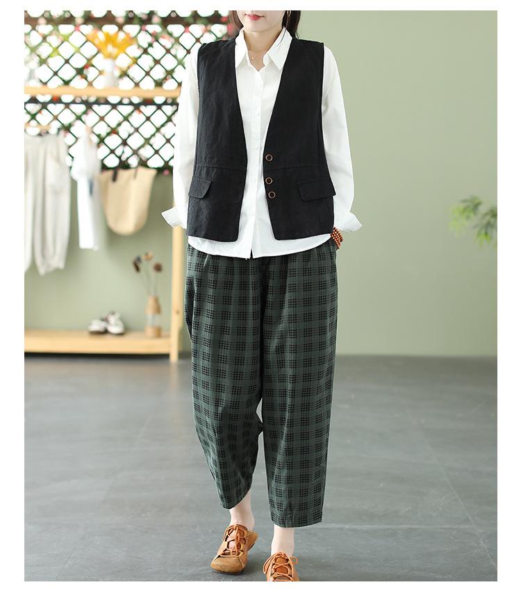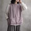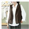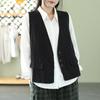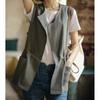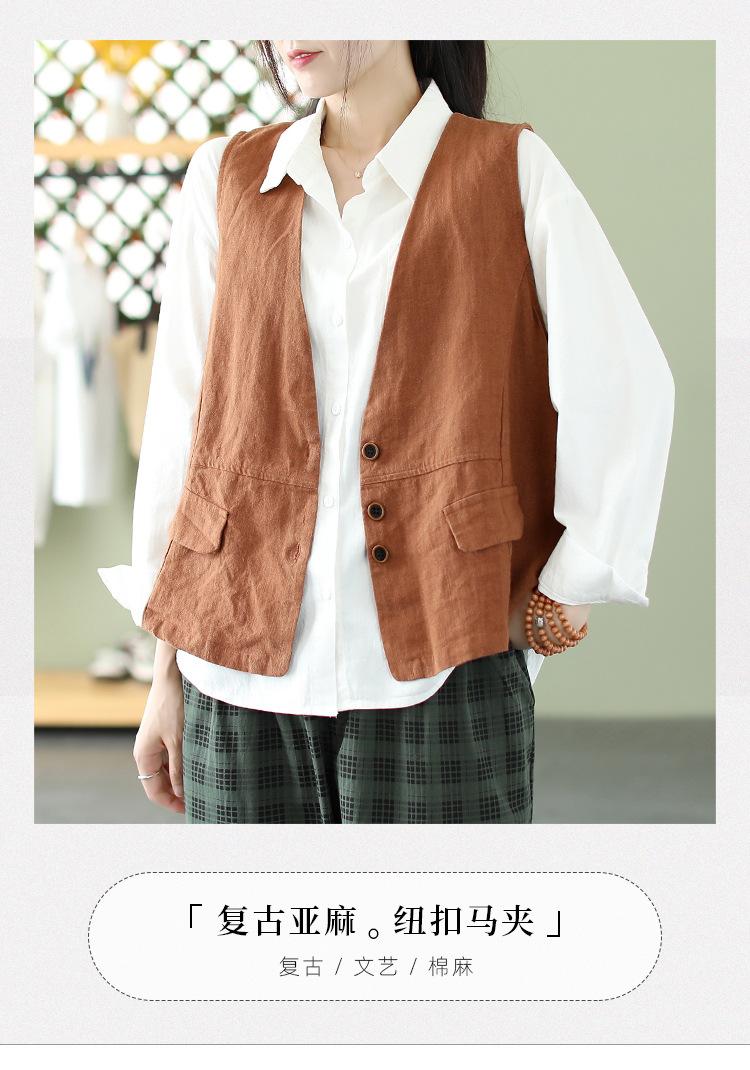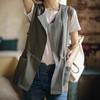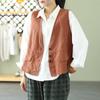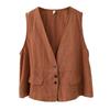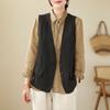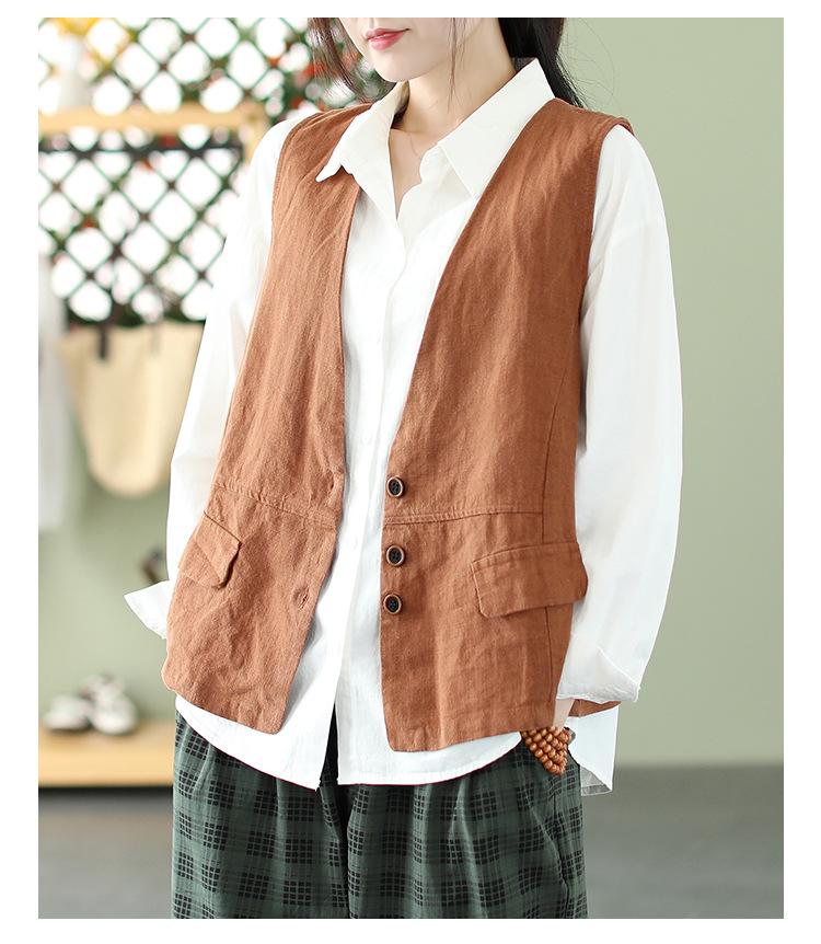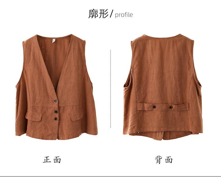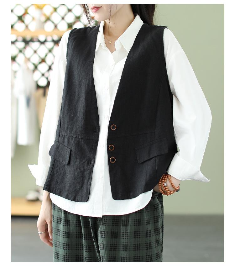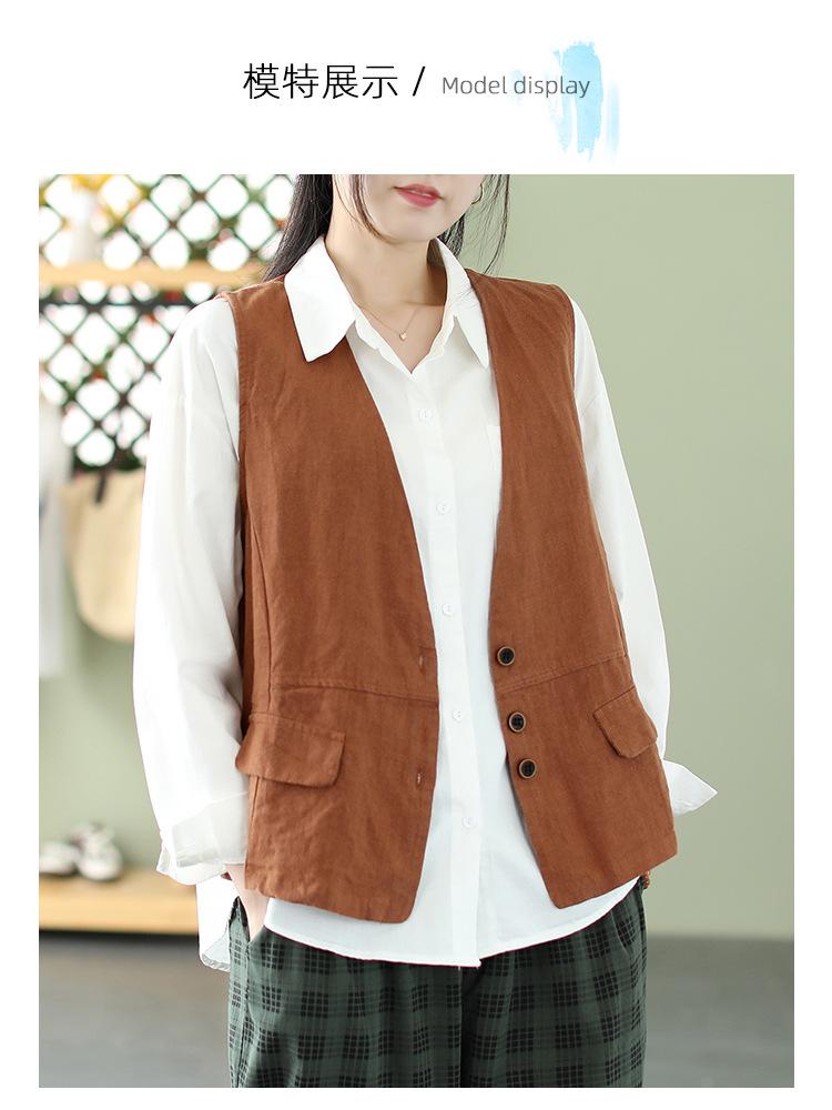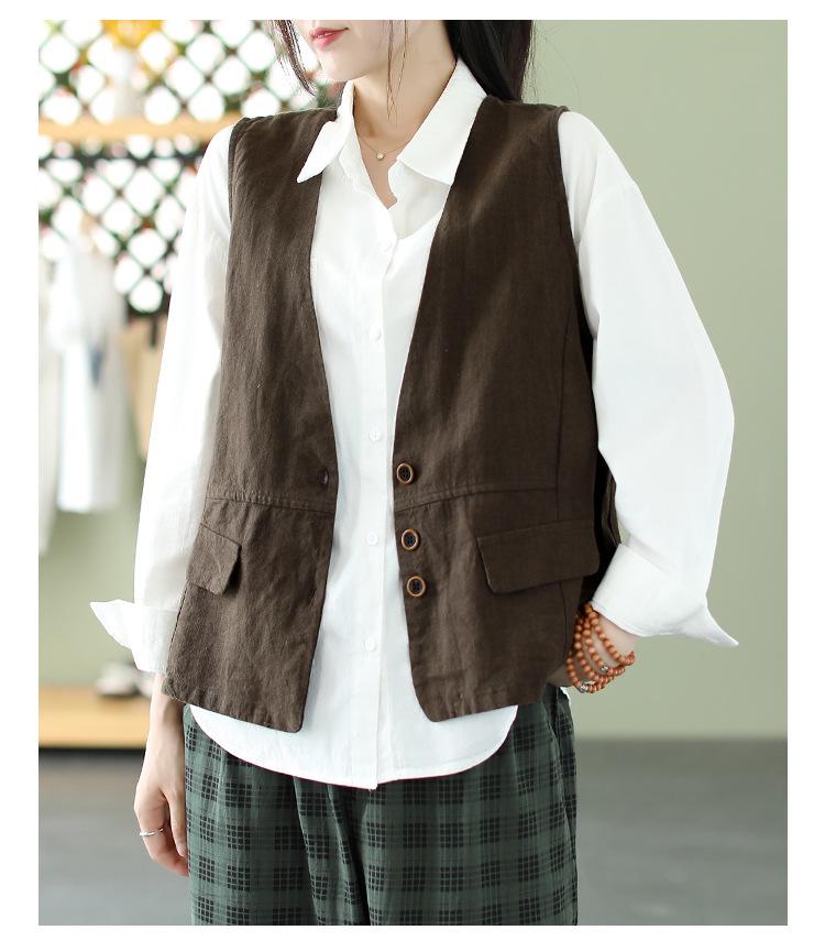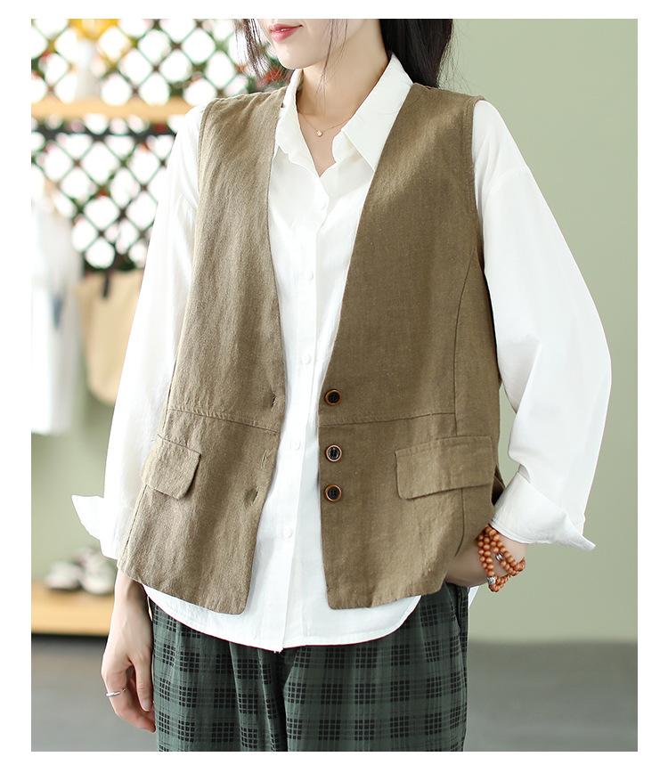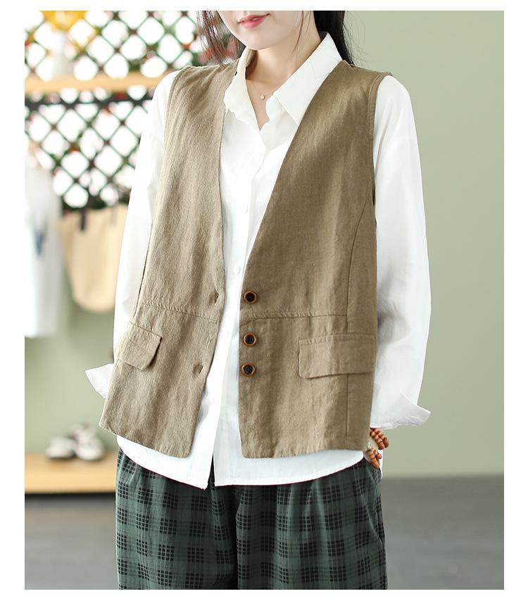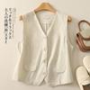 Chaleco Retro Desgastado con Cuello en V y Botones para Primavera y Otoño, Color Sólido, Literario, Corto, de Algodón y Lino, para Exterior de Mujer