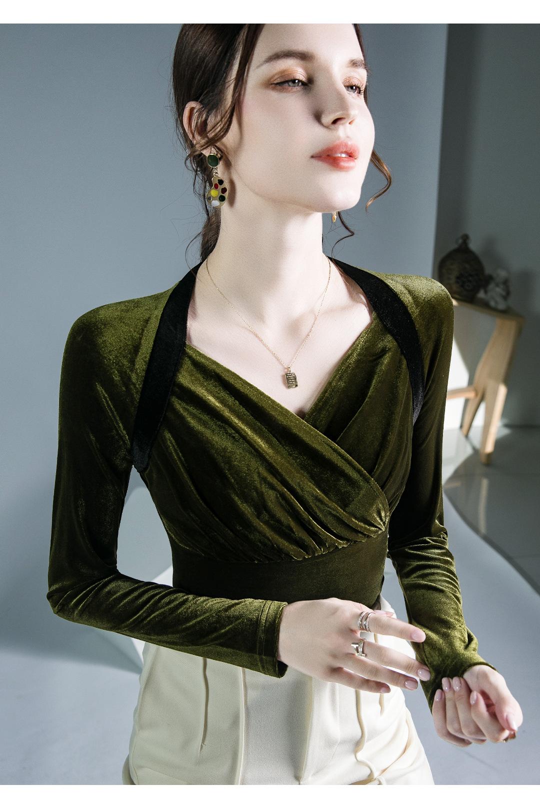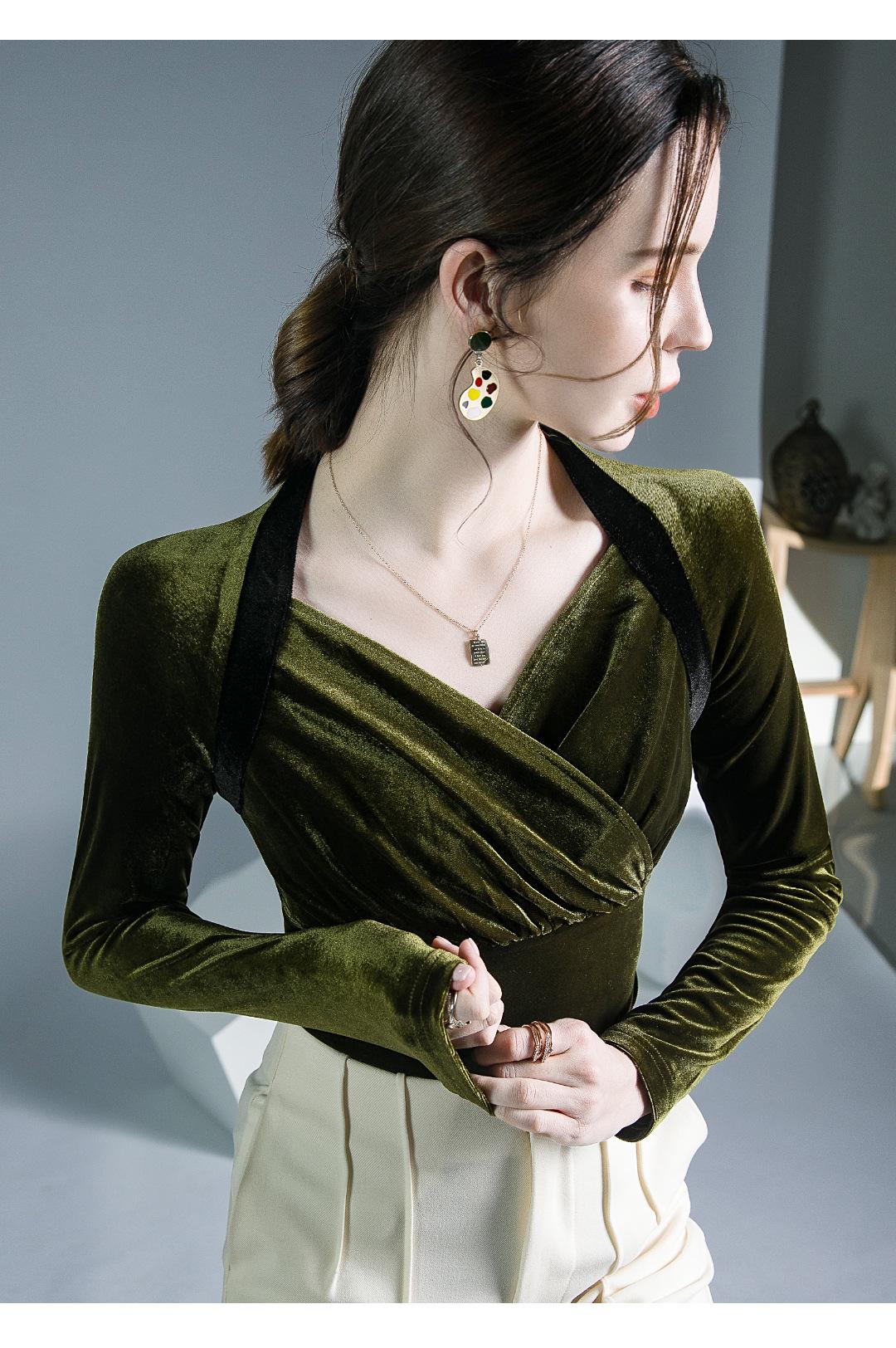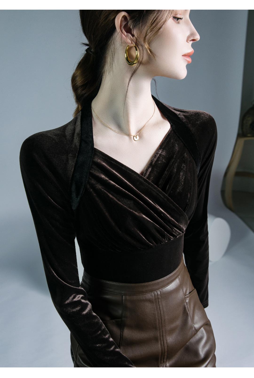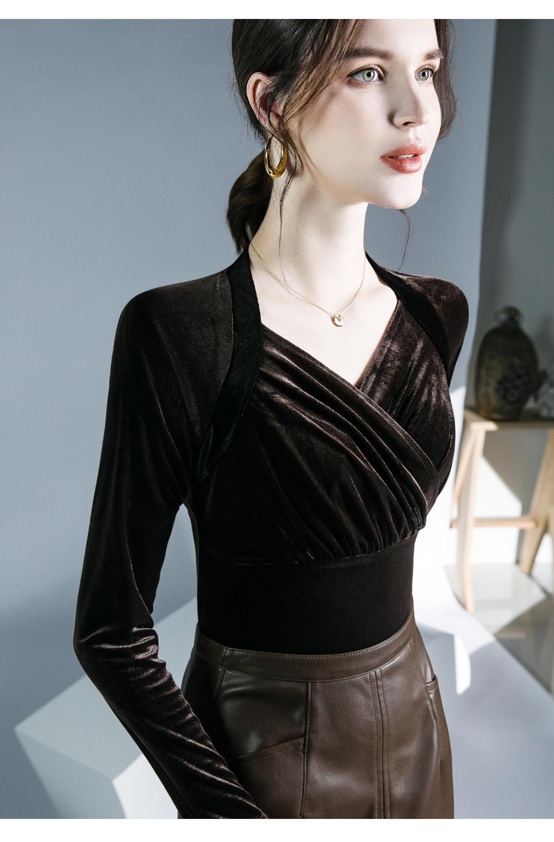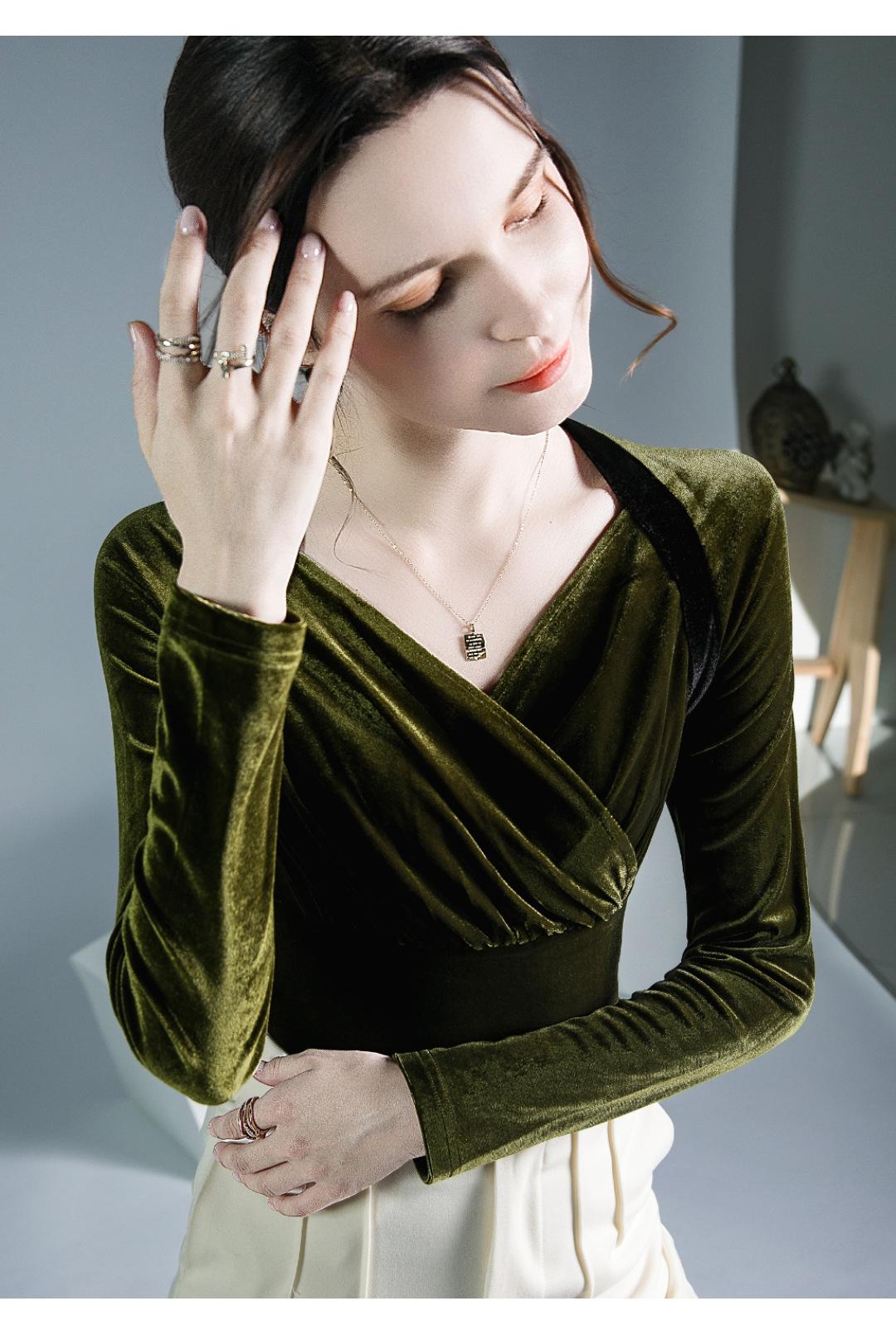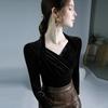 Camiseta interior de manga larga con cuello en V de terciopelo y costuras pequeñas europeas.