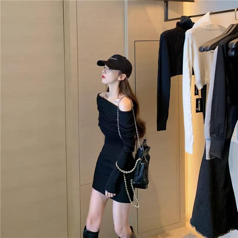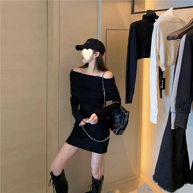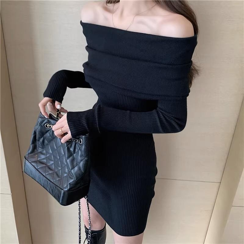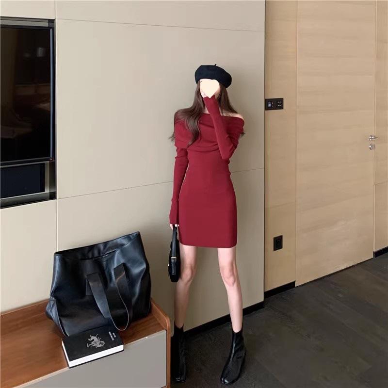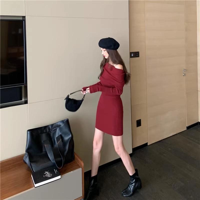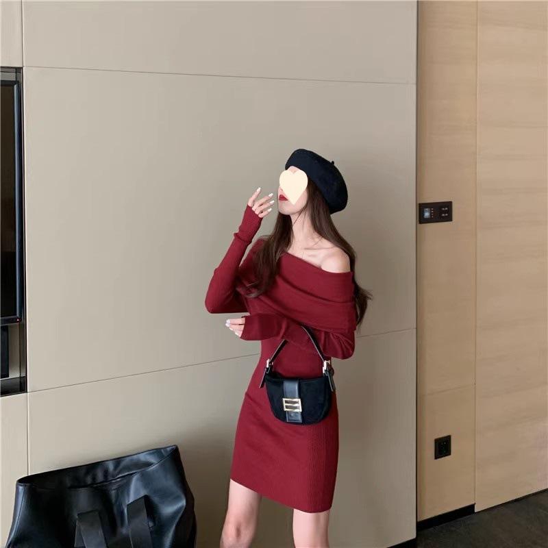 Compra Ropa de Otoño para Mujer 2025 Nuevo Vestido de Punto de Alta Gama de Manga Larga con un Hombro Descubierto Rojo Falda Corta Ajustada a la Cadera para Mujer al por mayor en Joom.pro