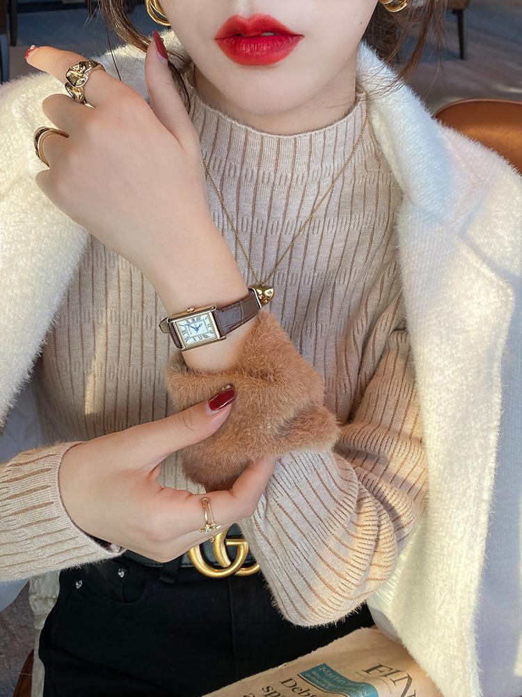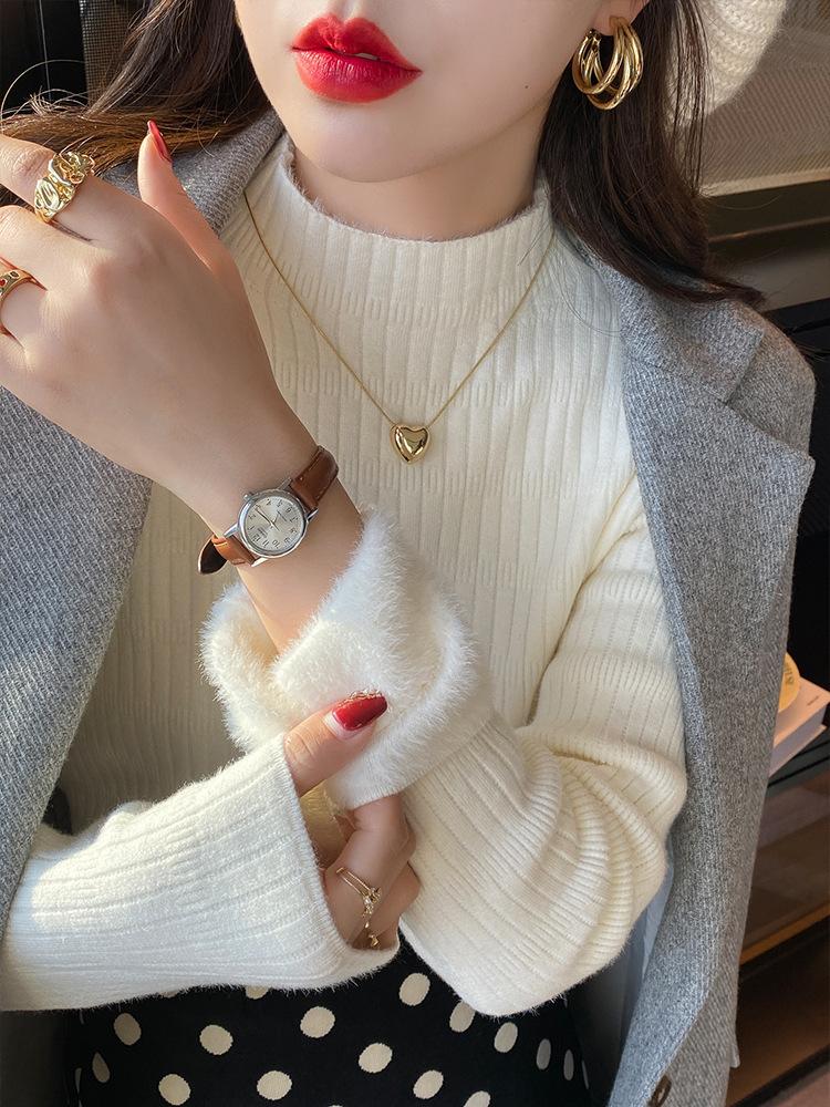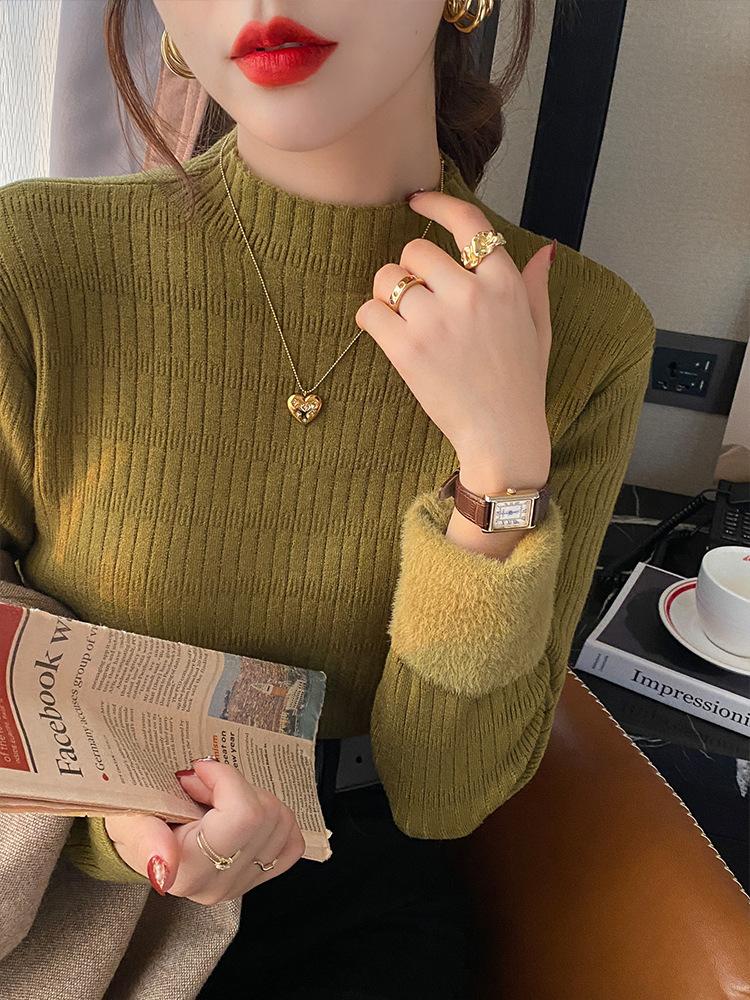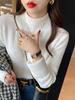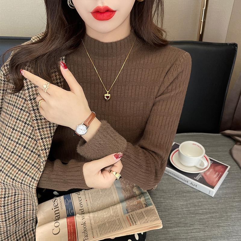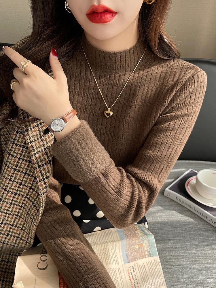 Suéter de Punto de Terciopelo de Una Pieza Interior Grueso y Cálido de Cuello Medio Alto para Mujer Otoño e Invierno Nuevo Versátil de Manga Larga Ajustado para Fondo