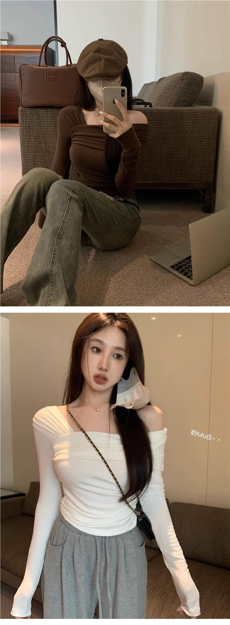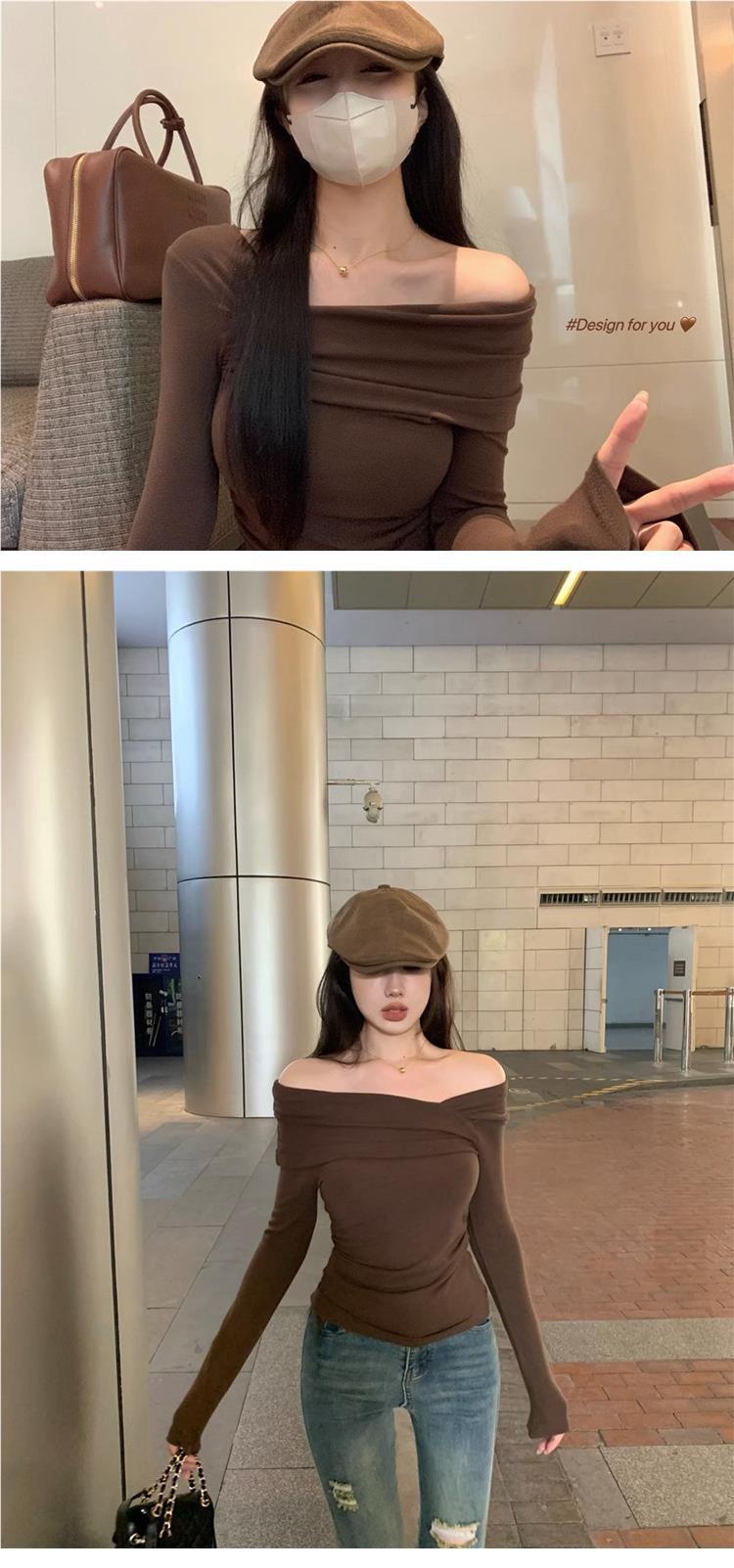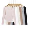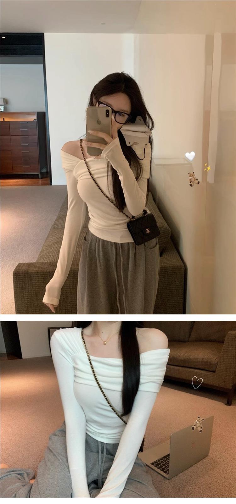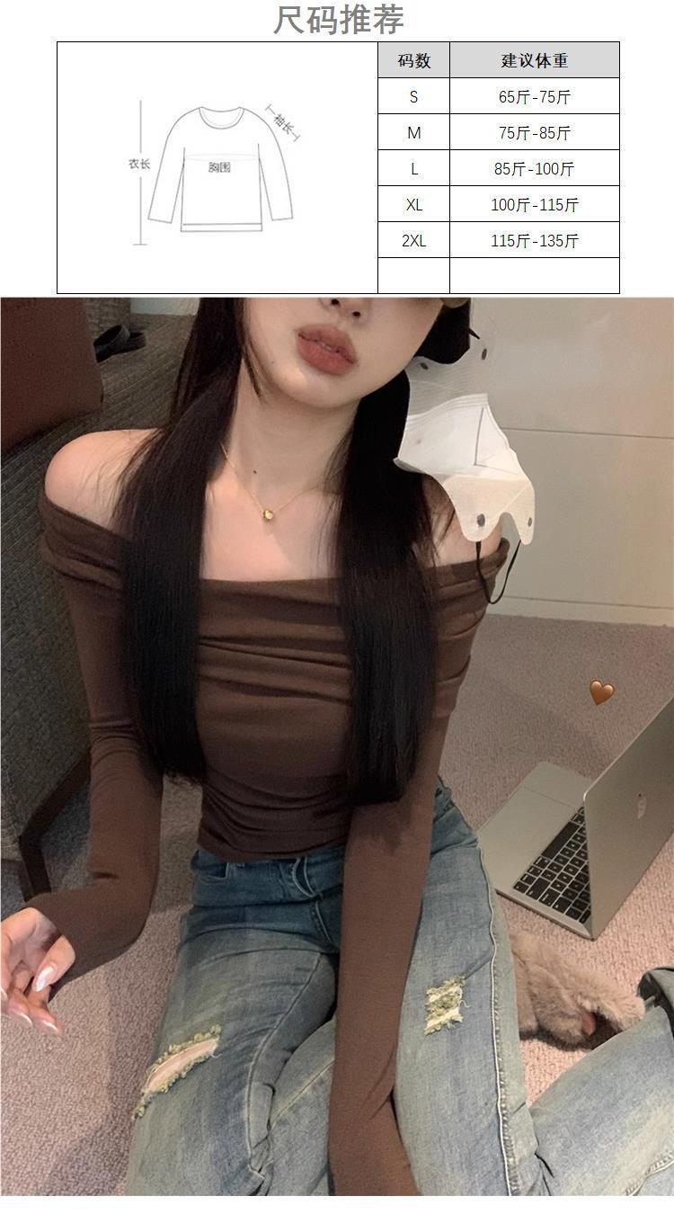 Camiseta de manga larga de polar con hombros descubiertos para mujer, elegante, ajustada, de otoño e invierno, con base interior corta y cálida.