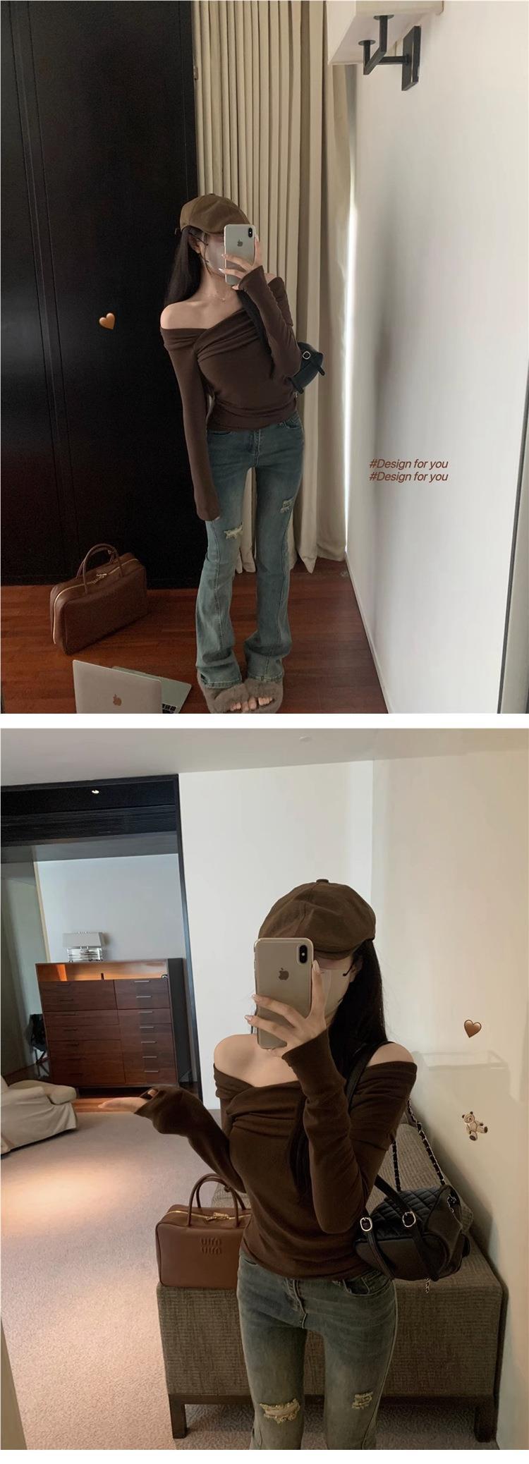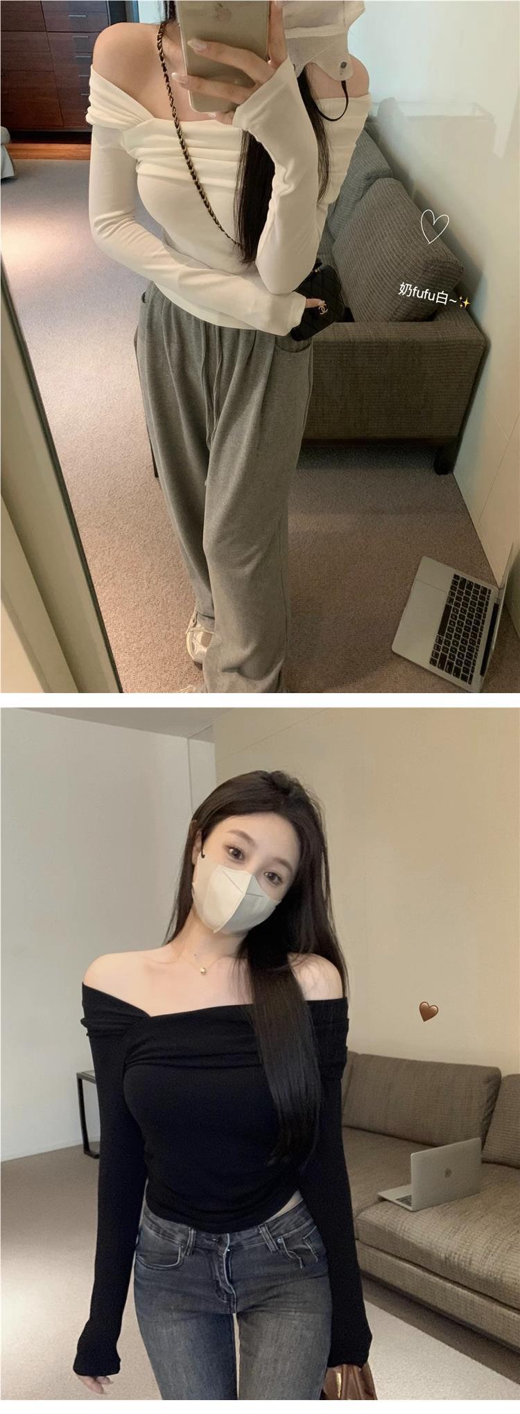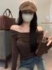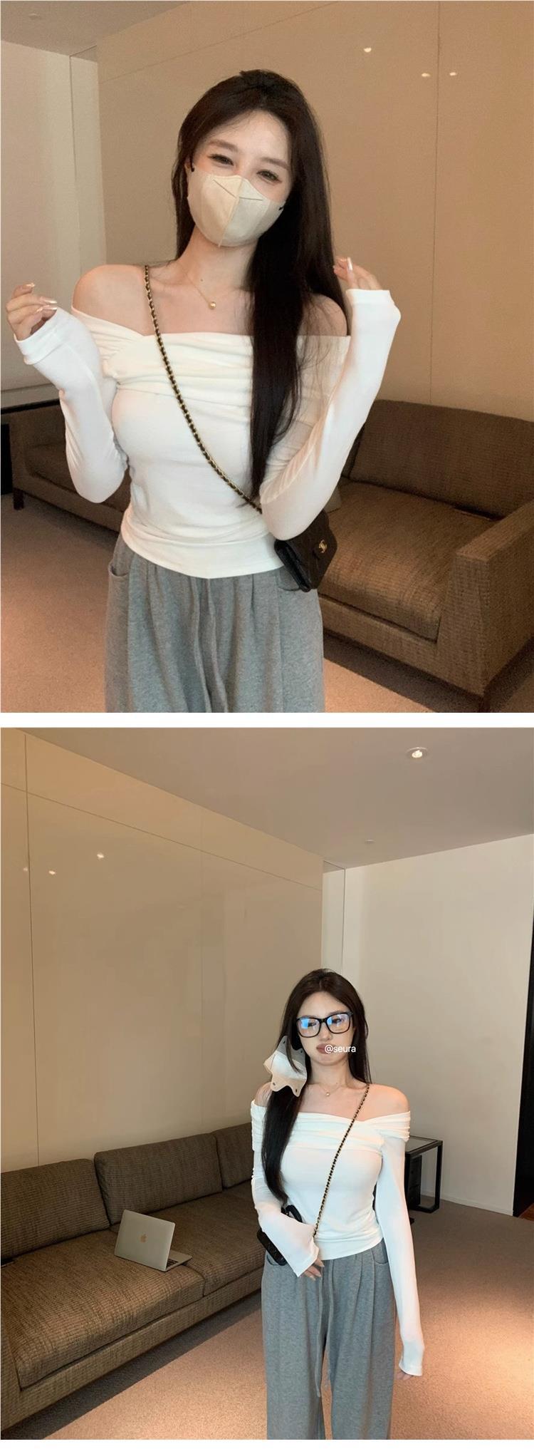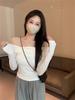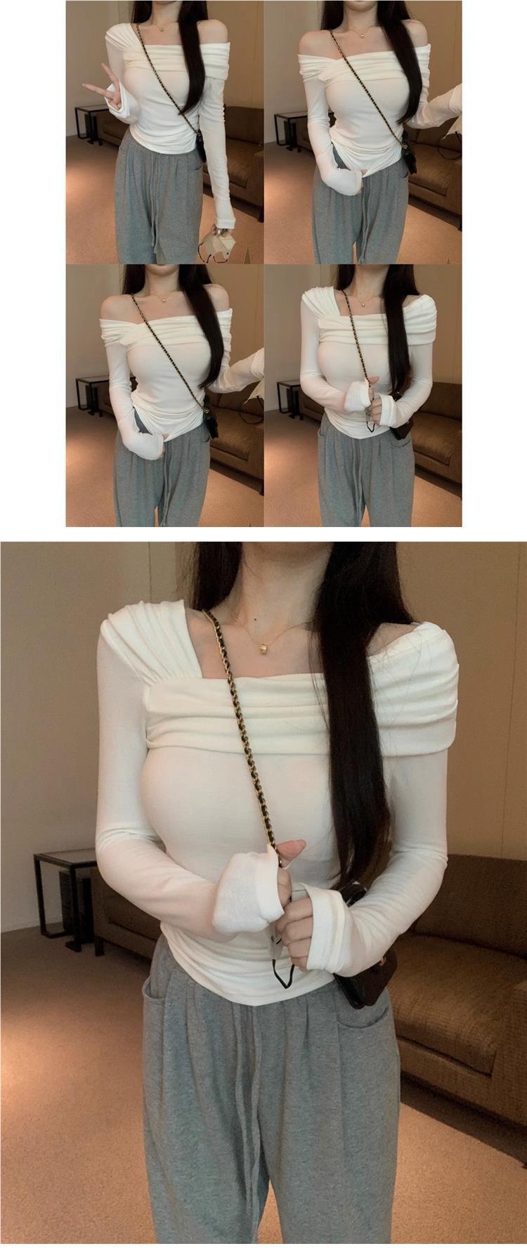 Camiseta de manga larga de polar con hombros descubiertos para mujer, elegante, ajustada, de otoño e invierno, con base interior corta y cálida.