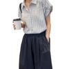 Camisa de Rayas Francesa de Manga Corta para Mujer Verano Sentido del Diseño Nicho Estilo Hong Kong Camisa Cárdigan Top de Hombro con Manga Corta Mariposa