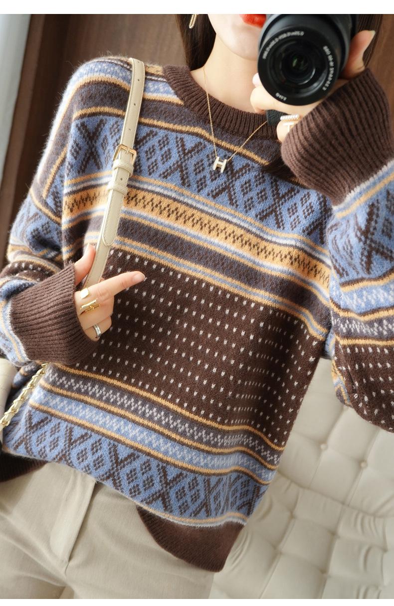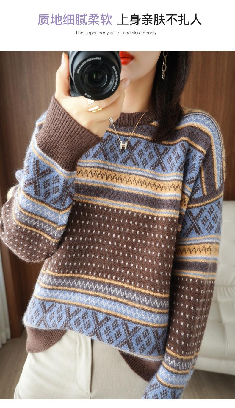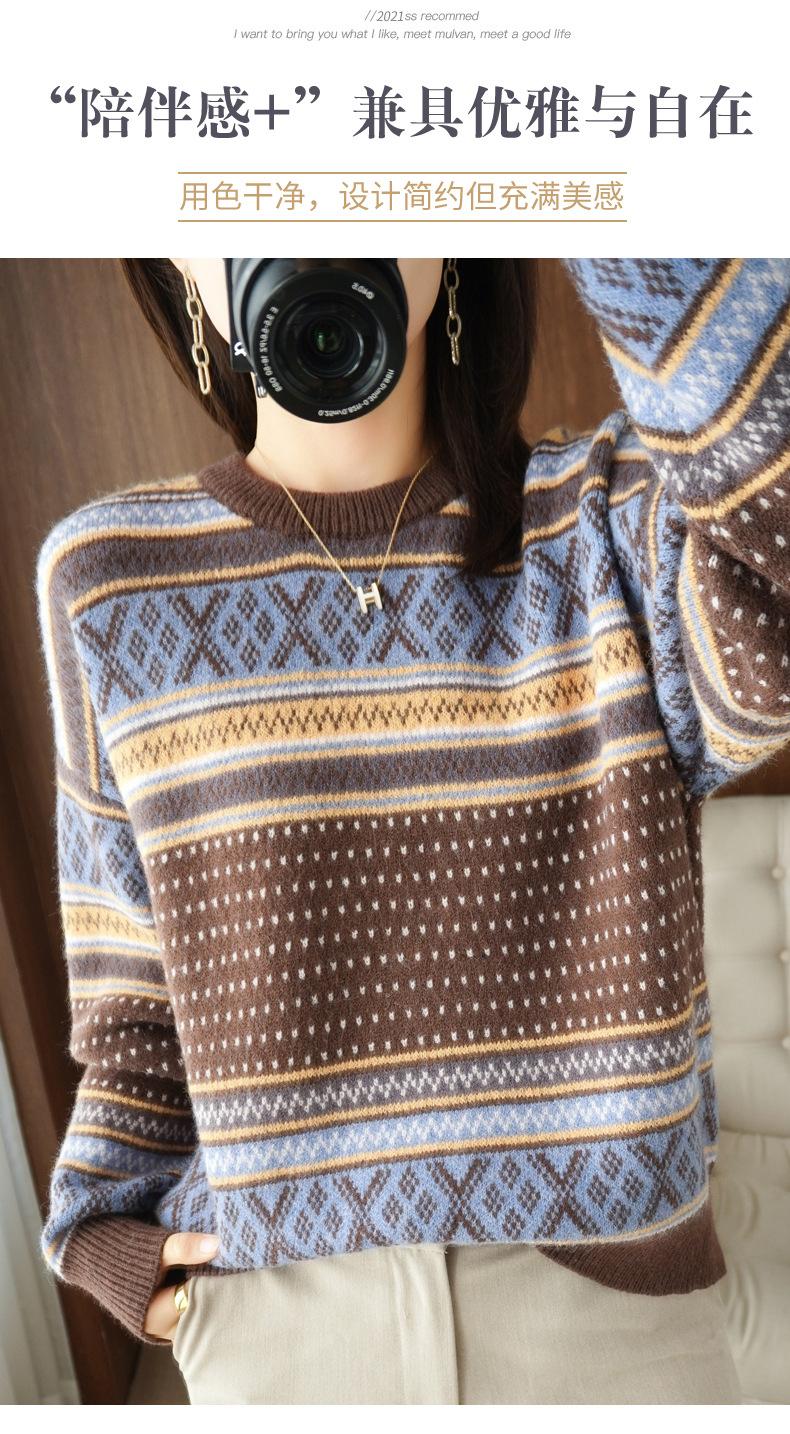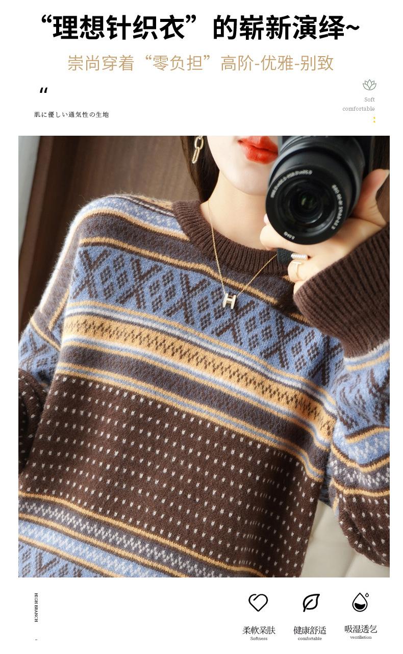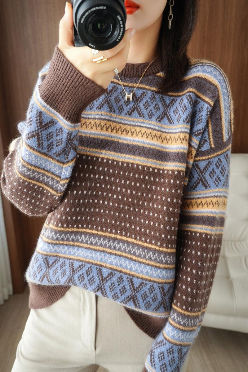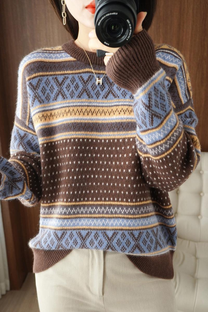 Otoño e invierno Nuevo suéter de punto para mujer cuello redondo holgado jacquard suéter holgado color contrastante camisa de fondo Mujer Europeo y Americano transfronterizo