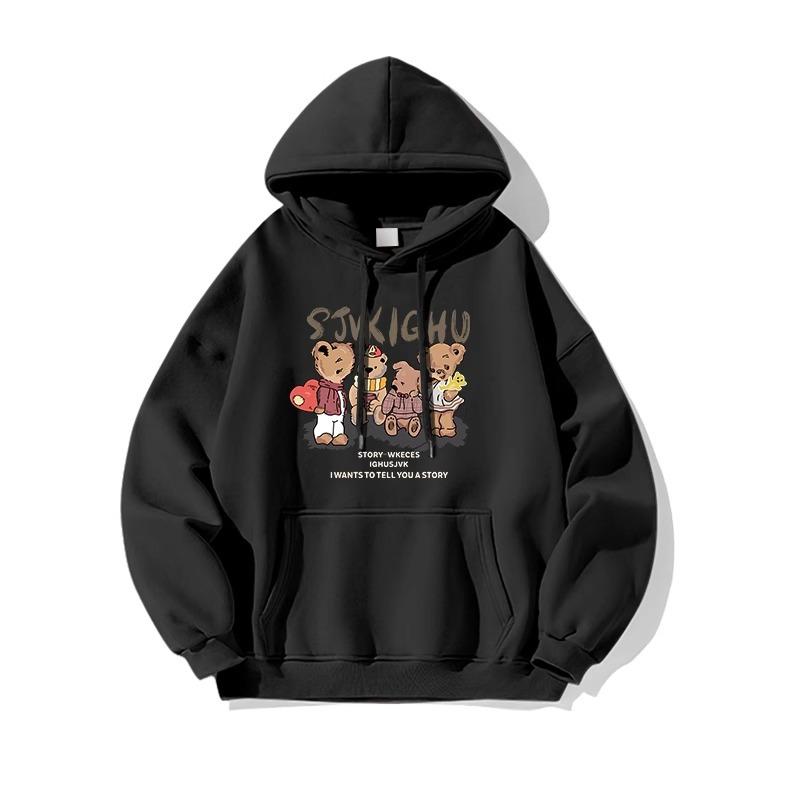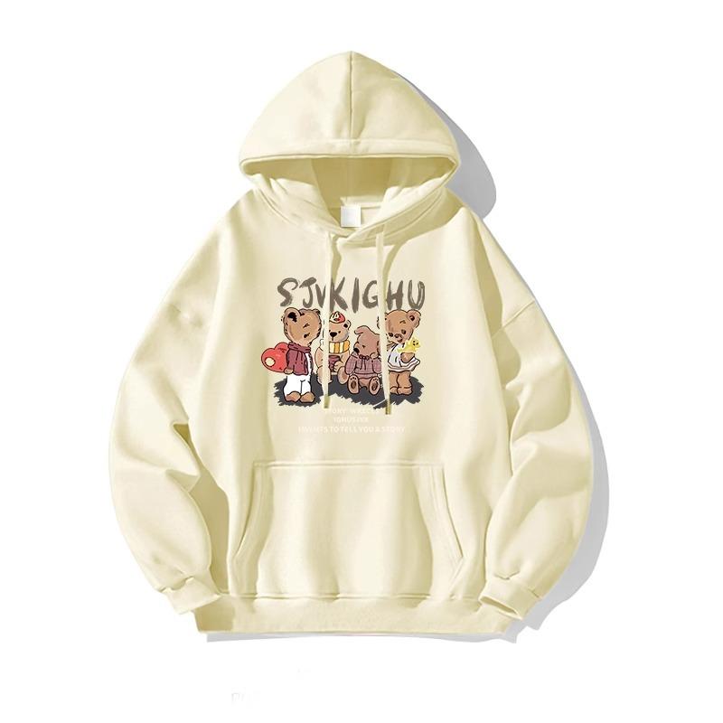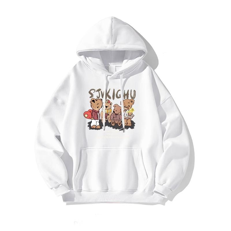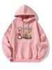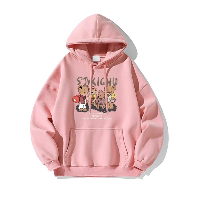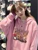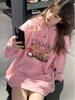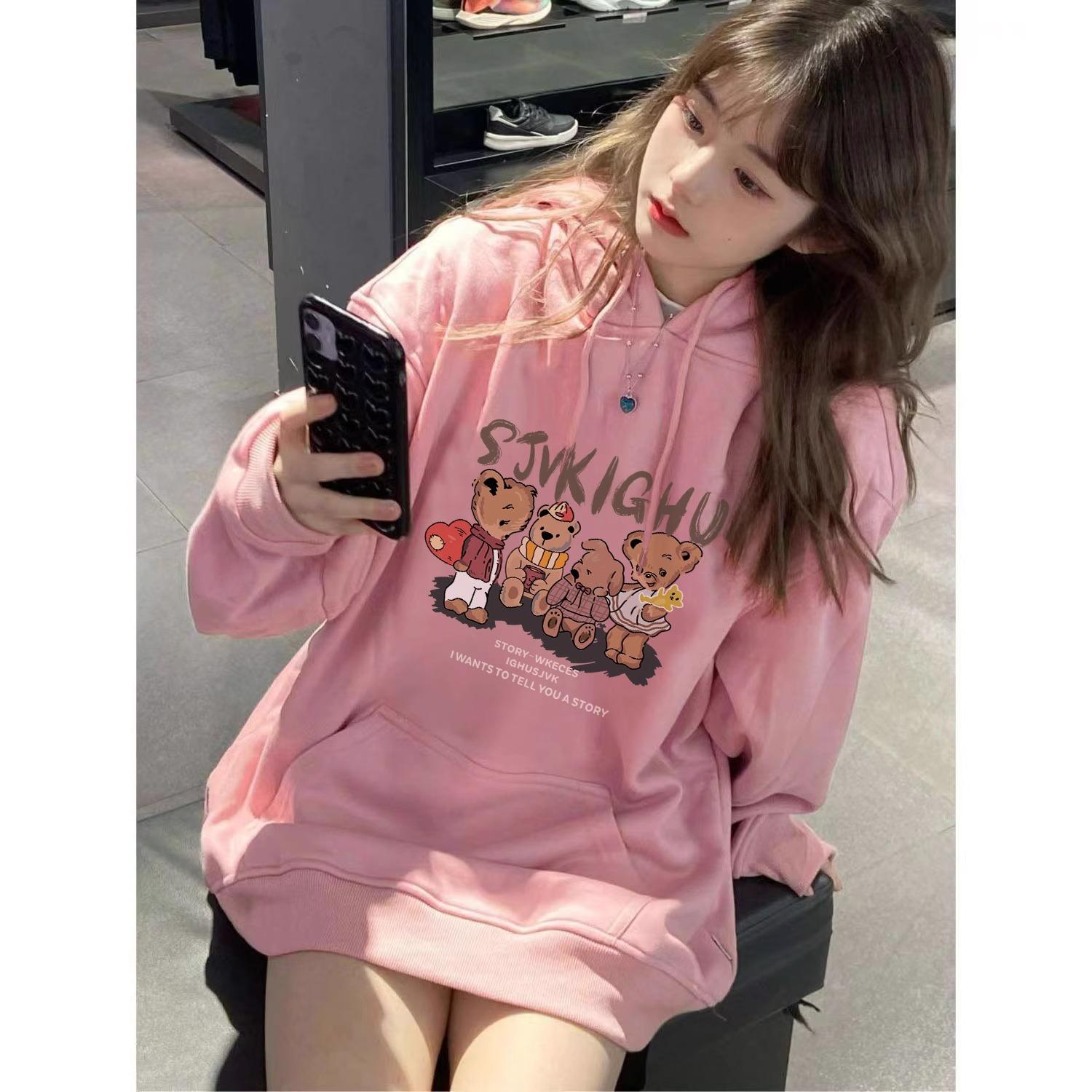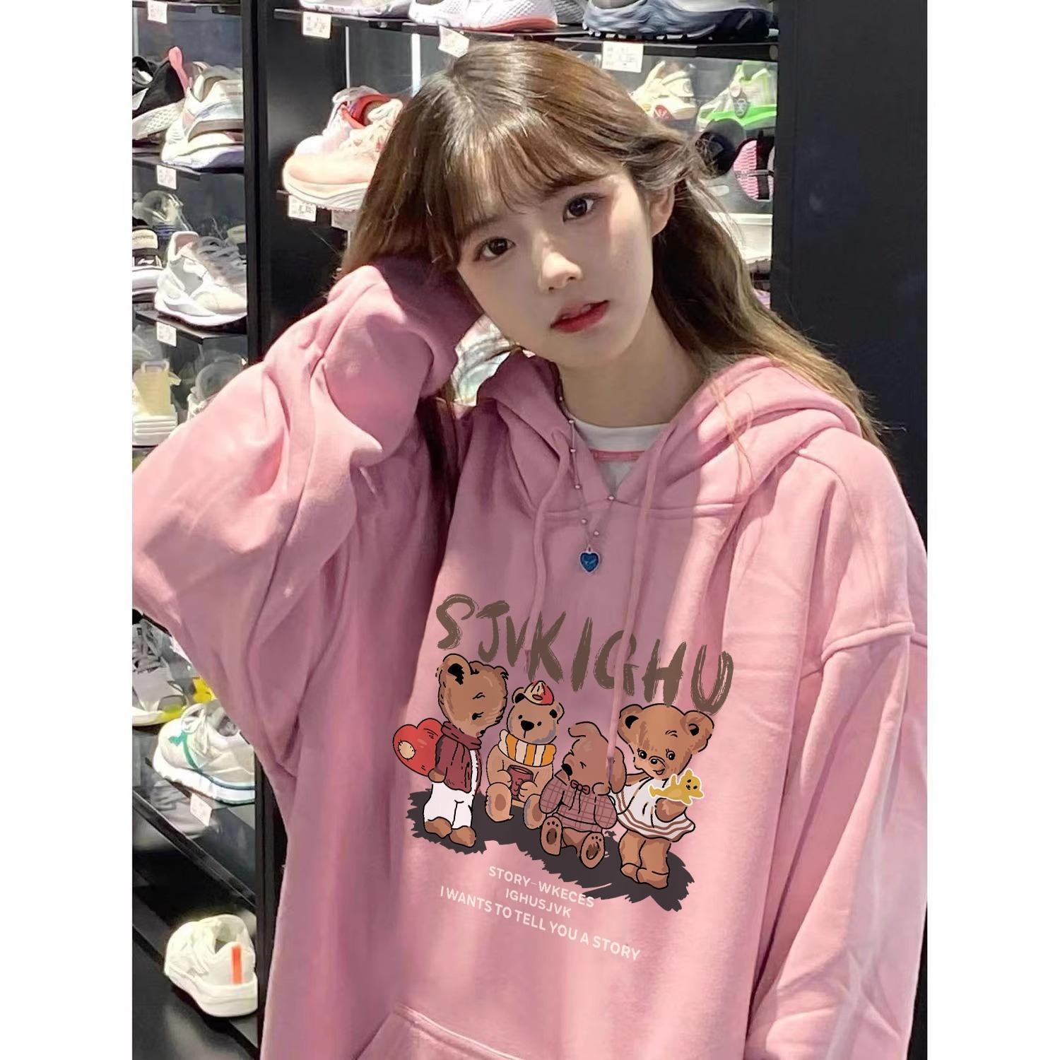 Suéter rosa pesado con capucha y estampado de oso para mujer, abrigo holgado estilo coreano grueso con forro polar para otoño e invierno, estilo perezoso, a juego.