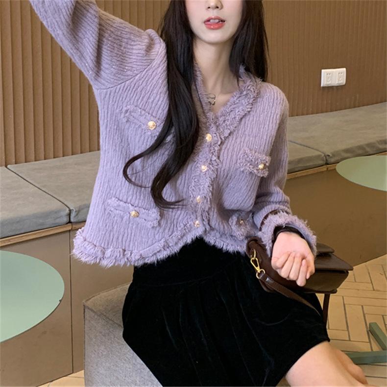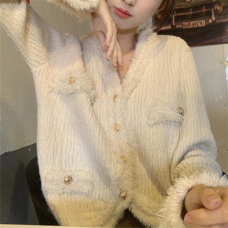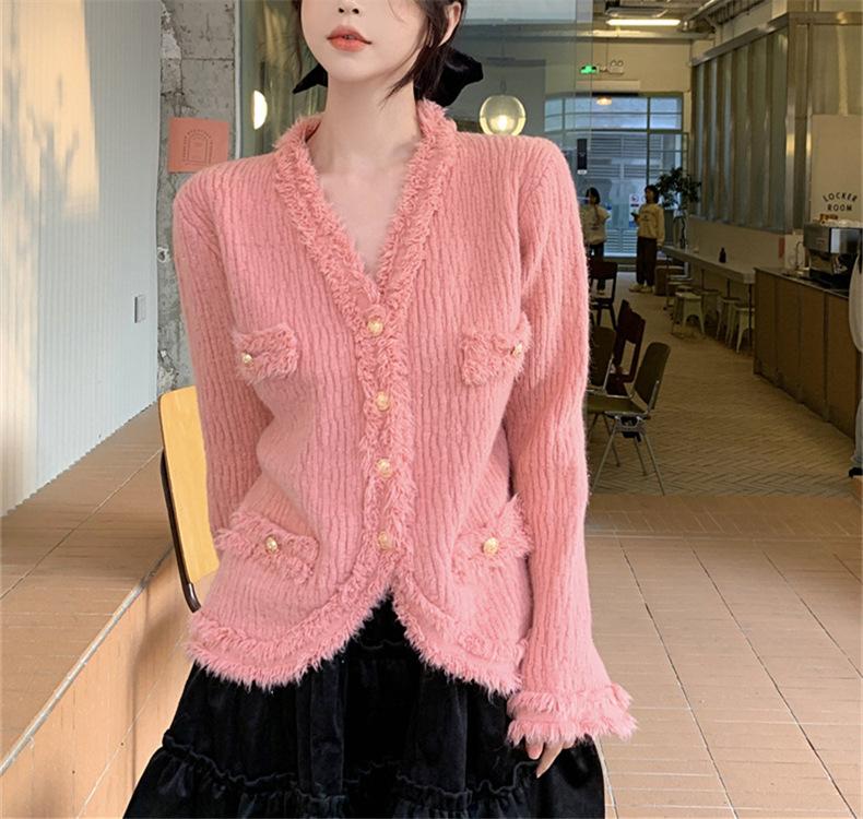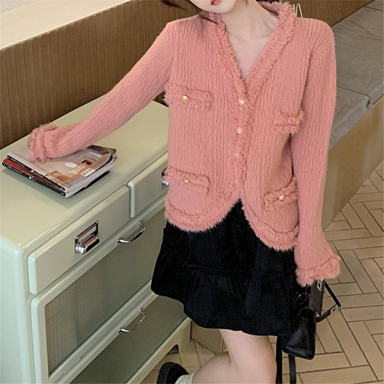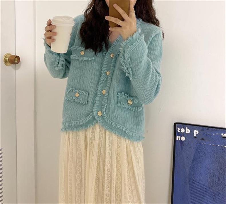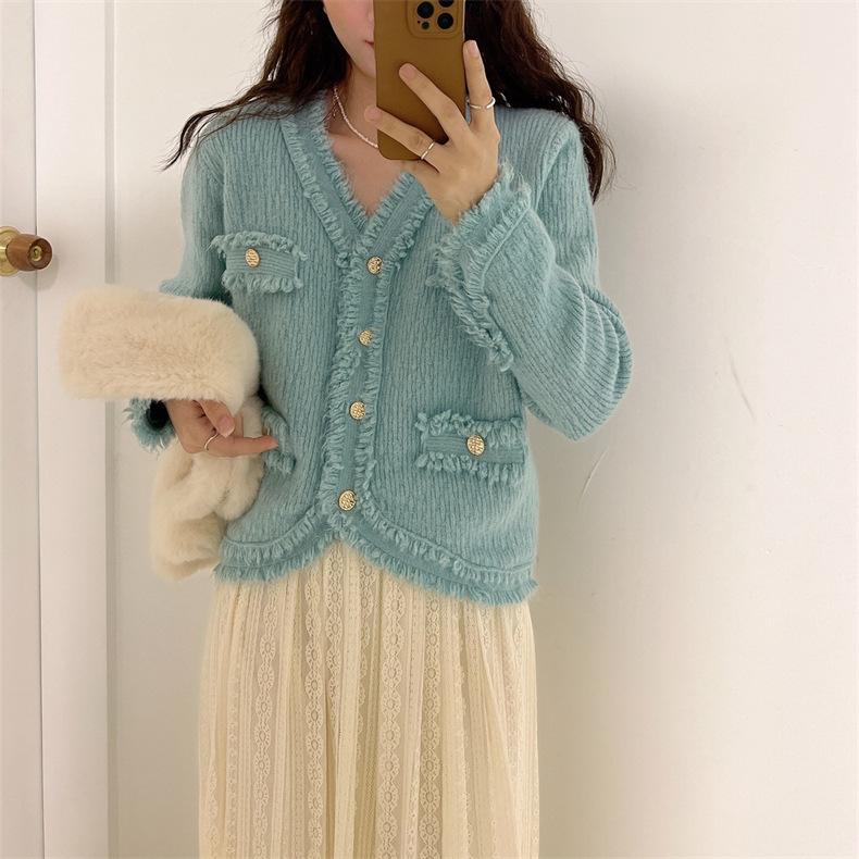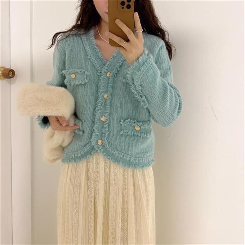 Suéter Dulce Coreano con Borlas de Cuello en V para Mujer Chaqueta Otoño e Invierno Nuevo Suelto Color Puro Manga Larga Cárdigan de Punto Ropa de Mujer