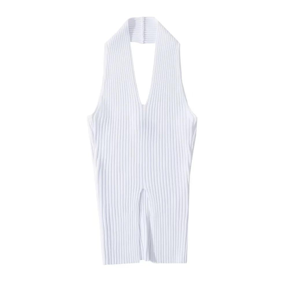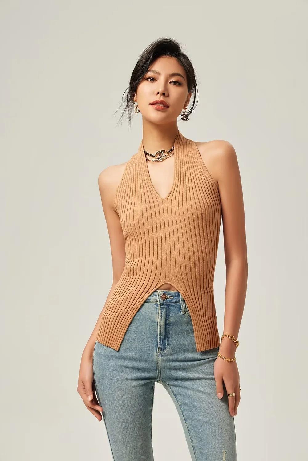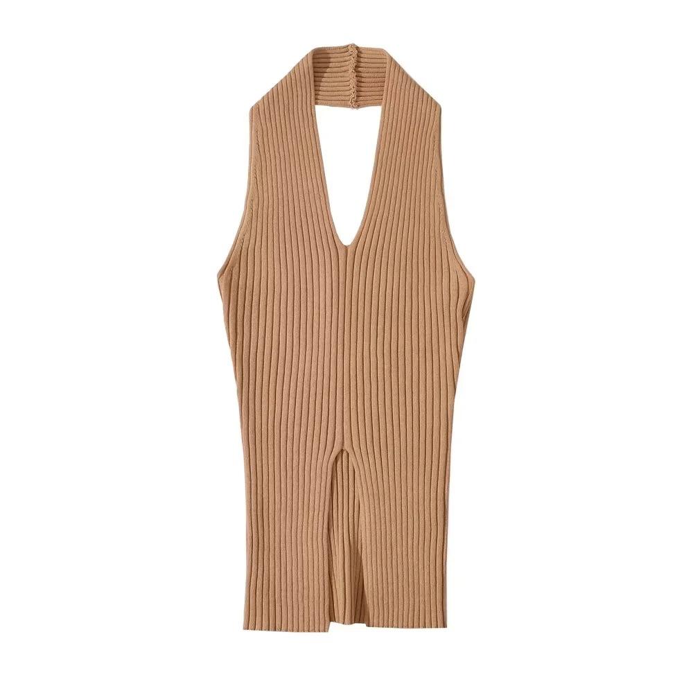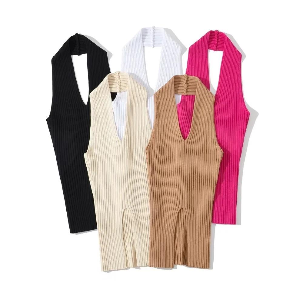 Chaleco de punto ajustado con abertura y espalda descubierta para mujer, estilo americano, sexy, con escote en V y tirantes para el ombligo