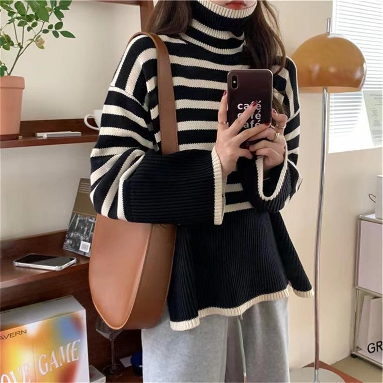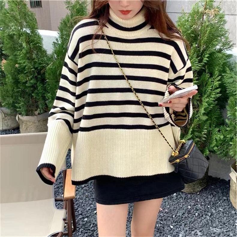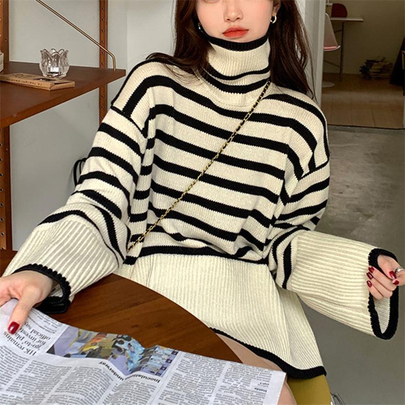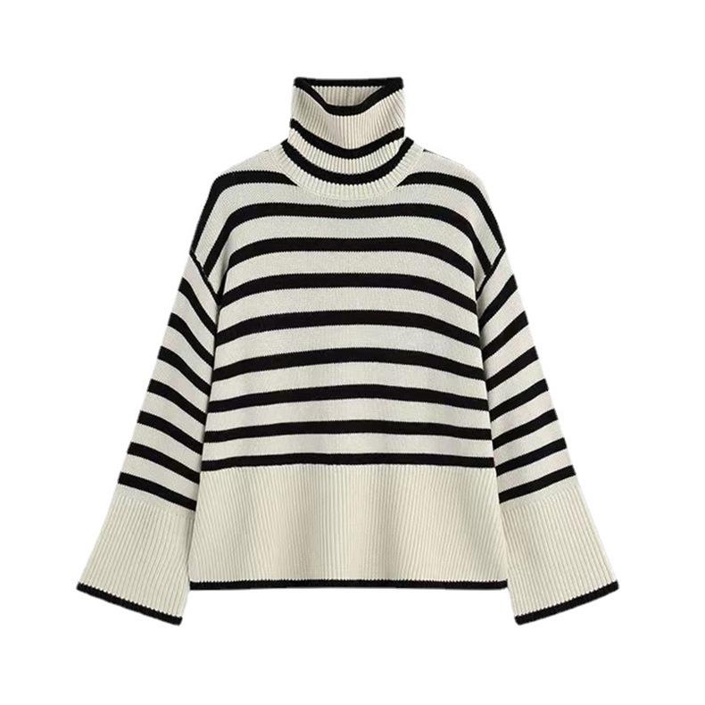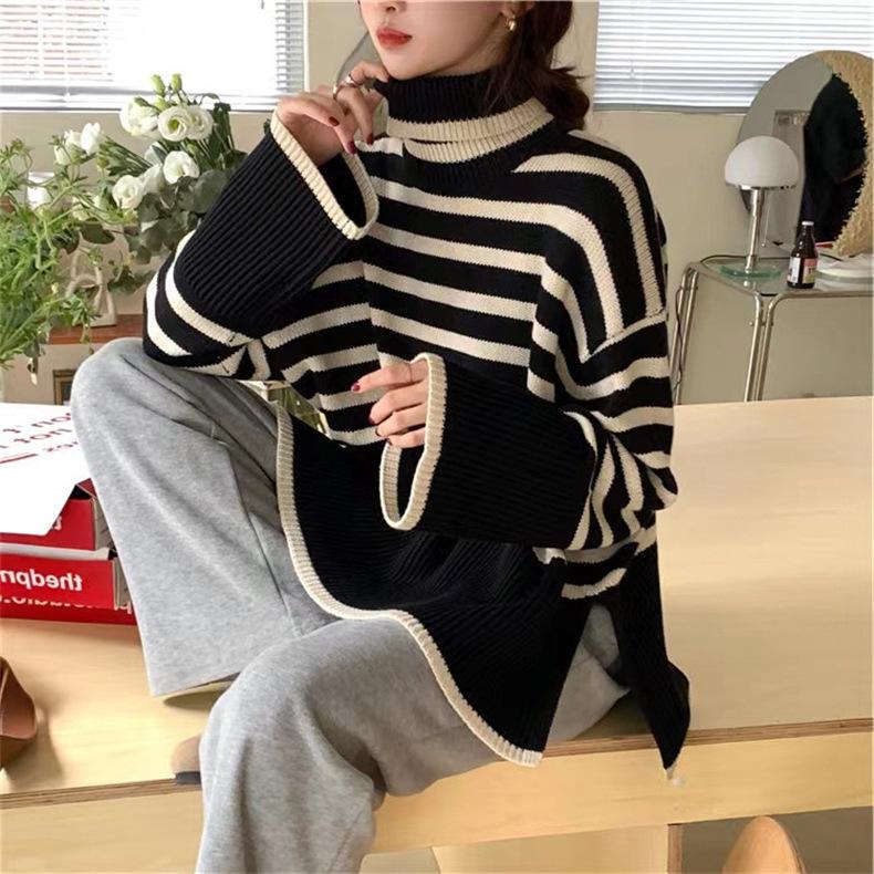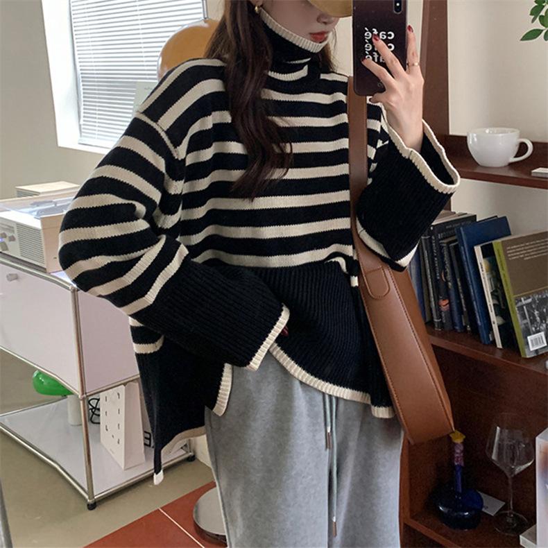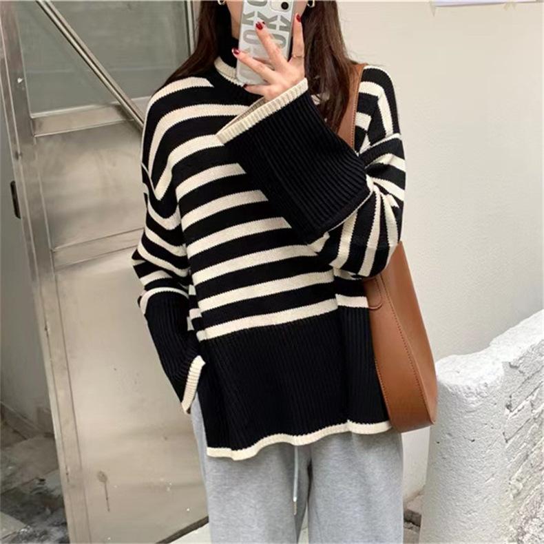 2025 Nuevo Suéter Holgado Estilo Perezoso Rayas Blancas y Negras Top con Abertura Cuello Tortuga Tejido de Punto Básico para Mujer