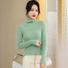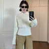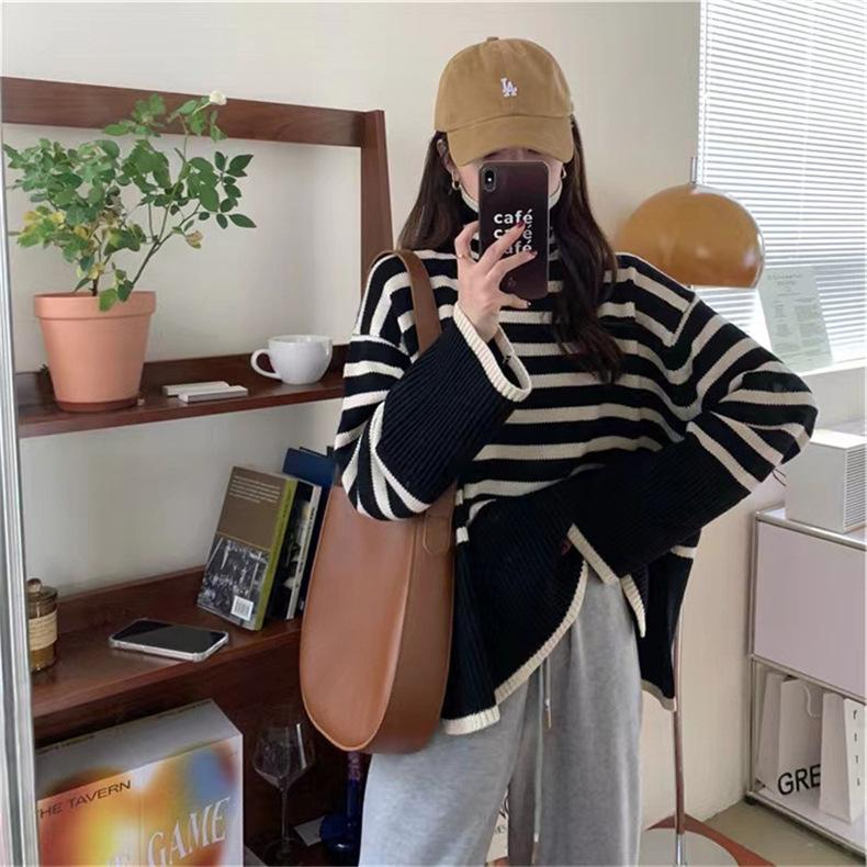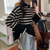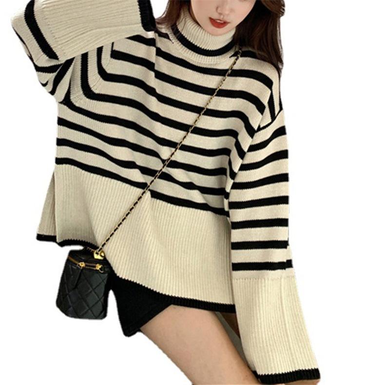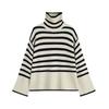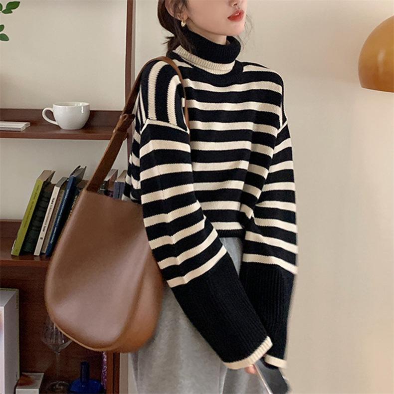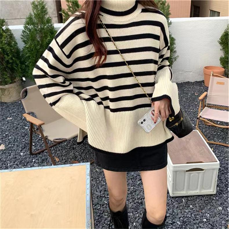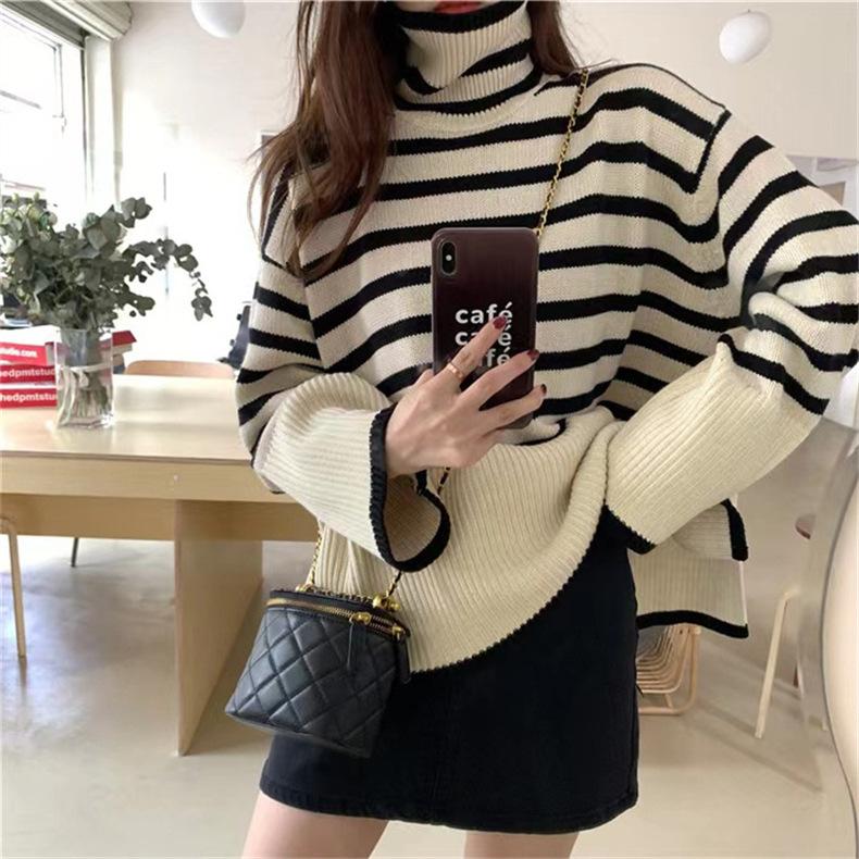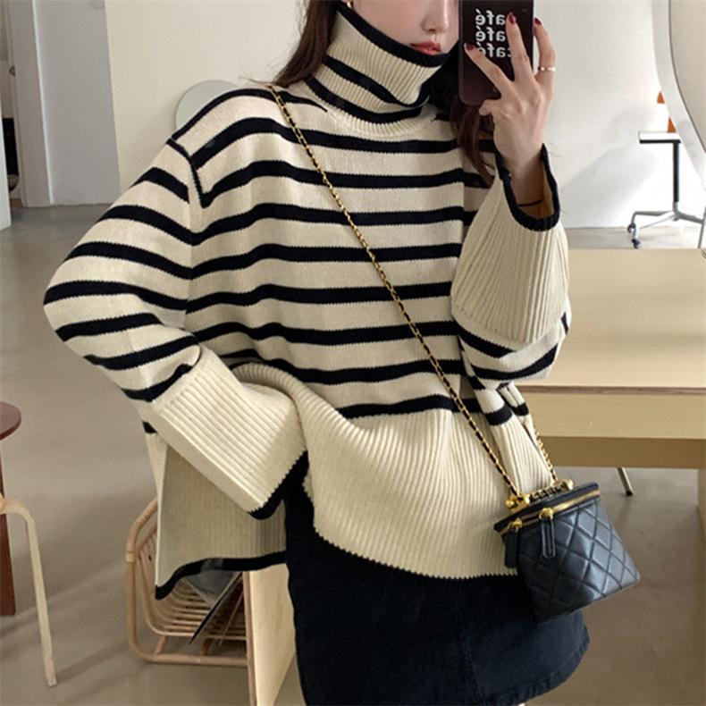 2025 Nuevo Suéter Holgado Estilo Perezoso Rayas Blancas y Negras Top con Abertura Cuello Tortuga Tejido de Punto Básico para Mujer