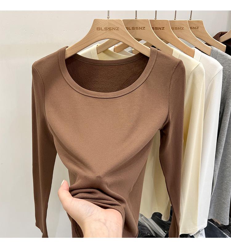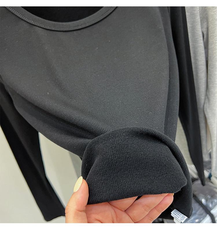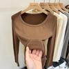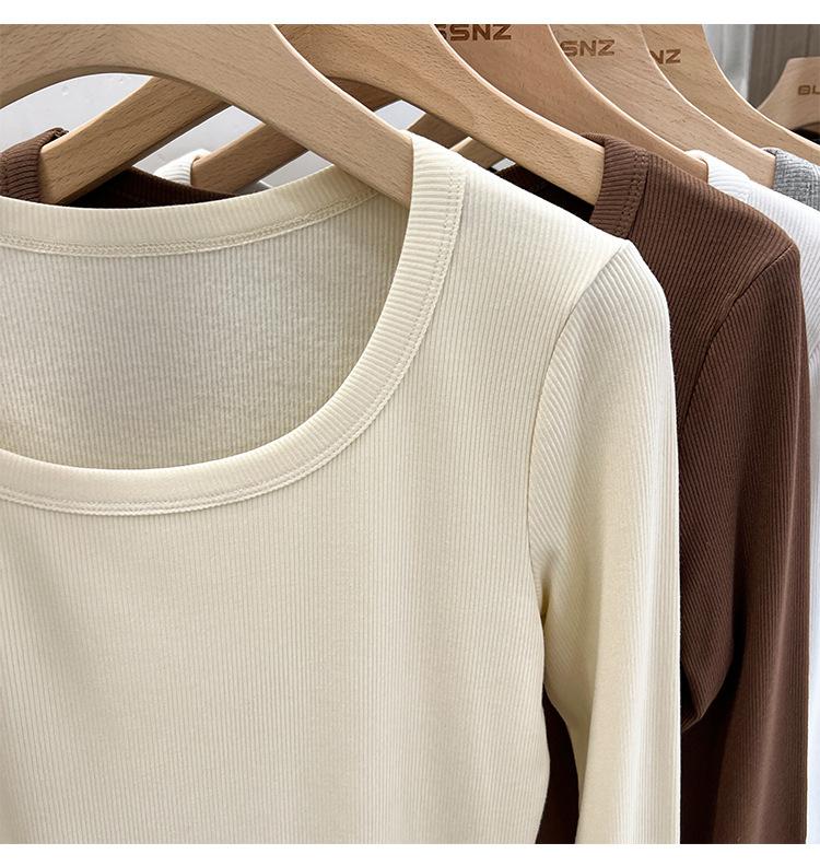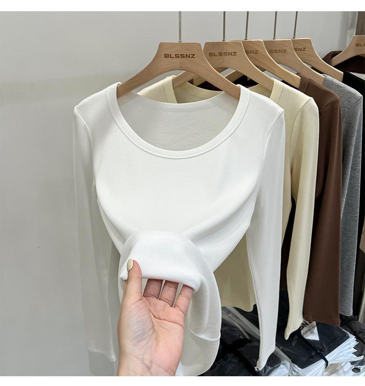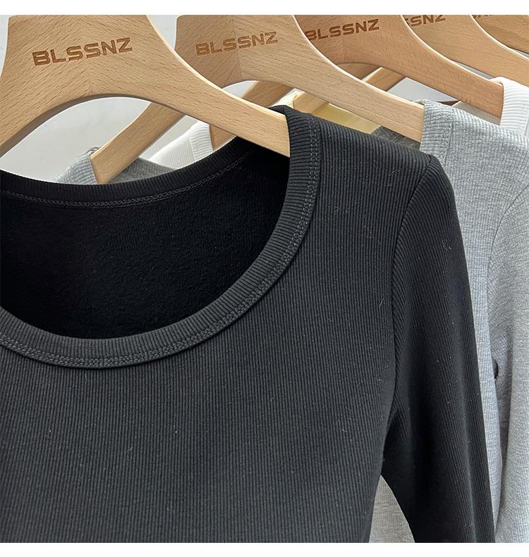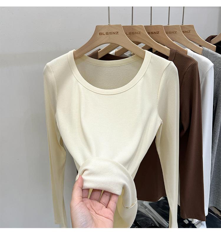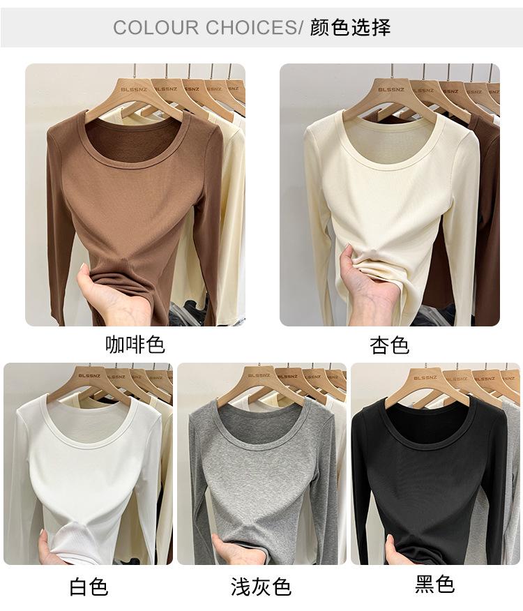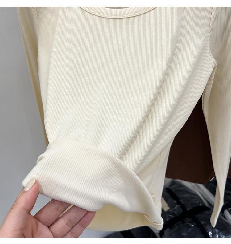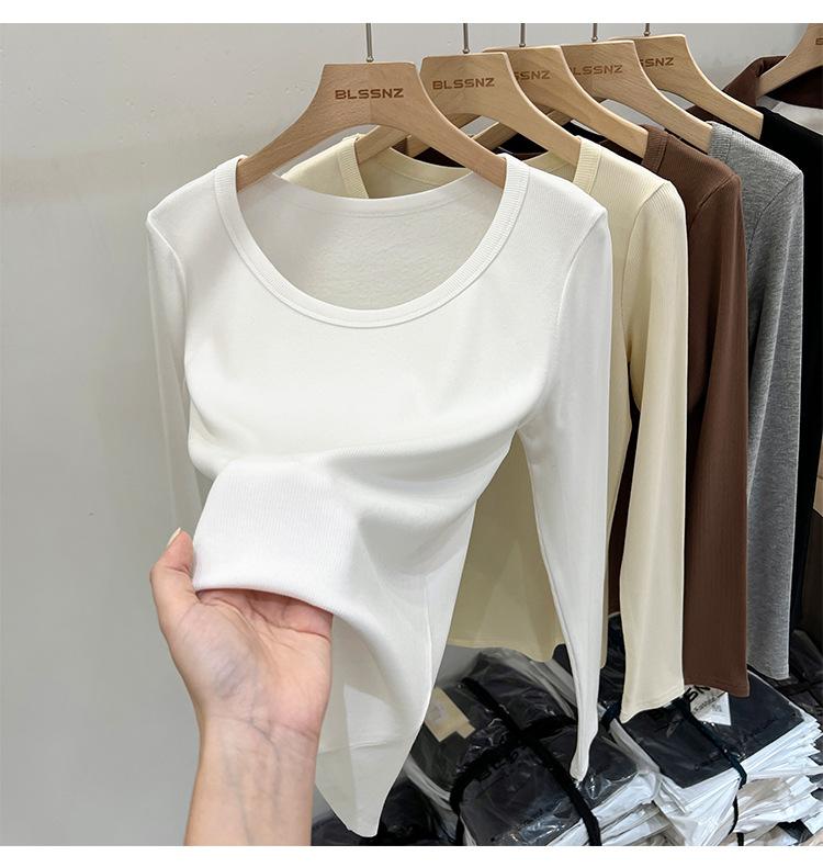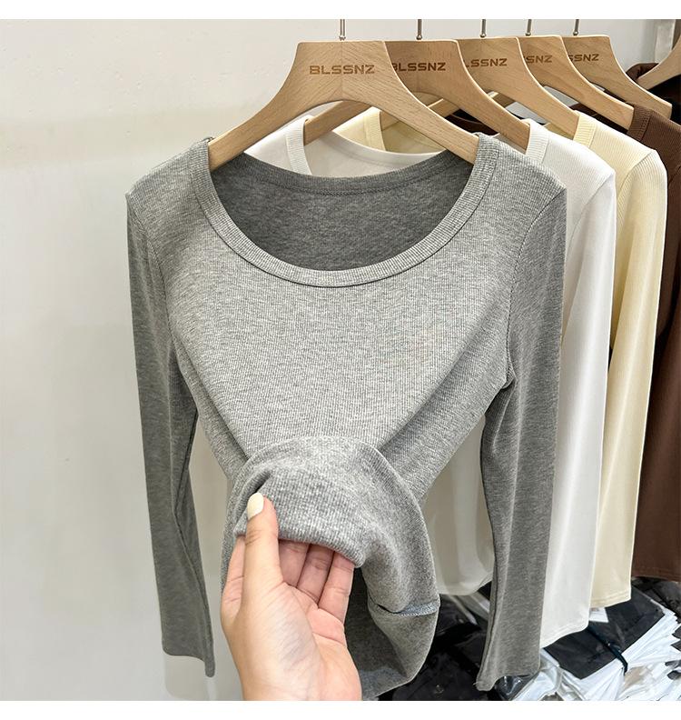 Playera de Manga Larga Cepillada de Estilo Europeo para Mujer, Nueva Primavera Temprana 2023, Top de Color Sólido Ajustado con Forro Polar, Capa Base Moderna para Mujer