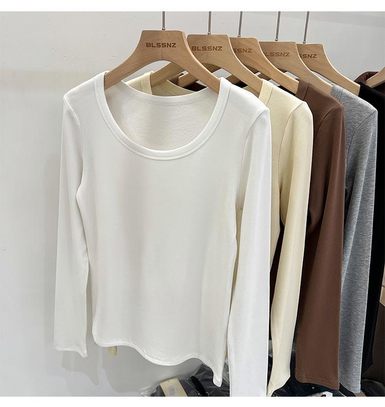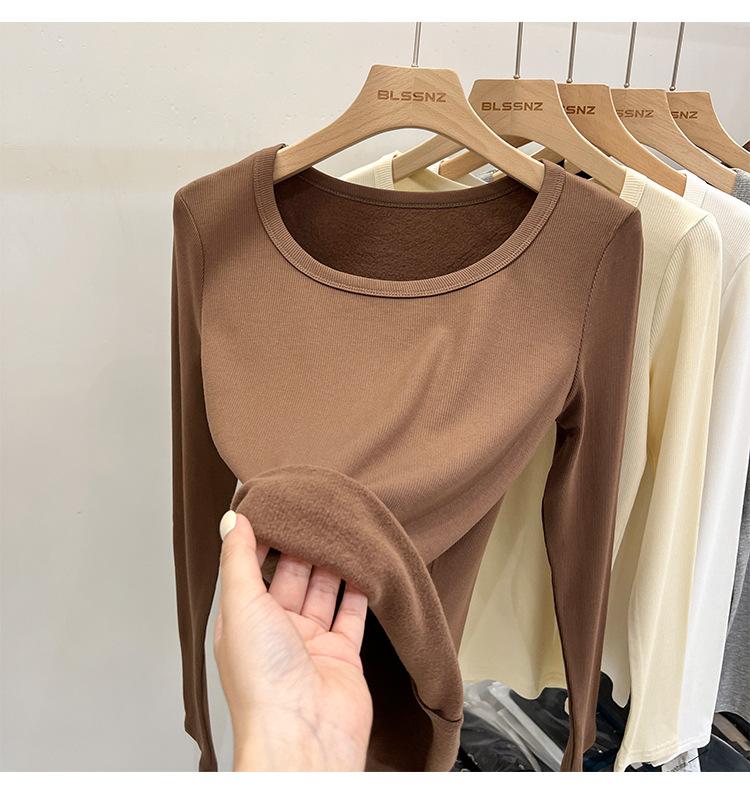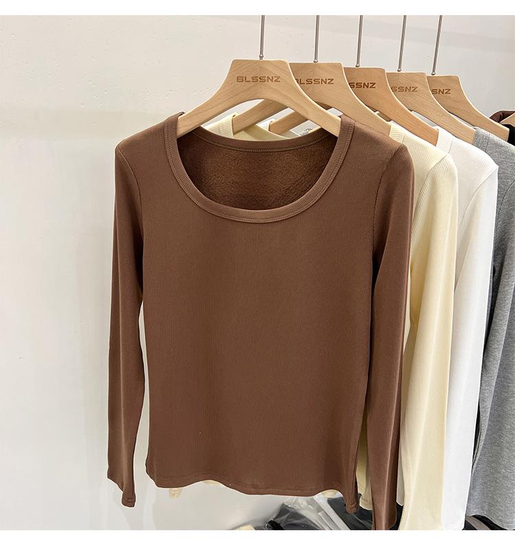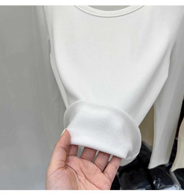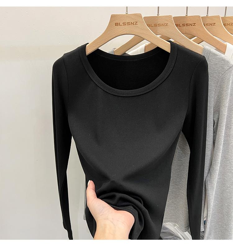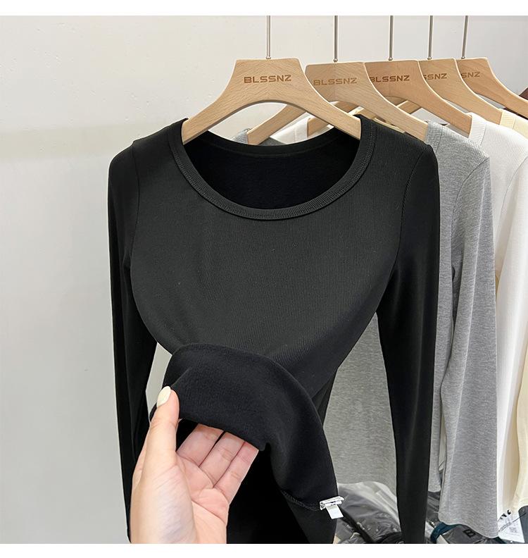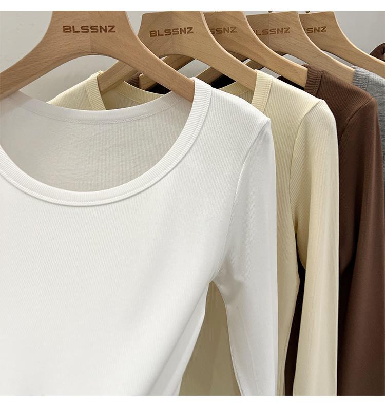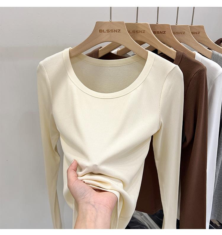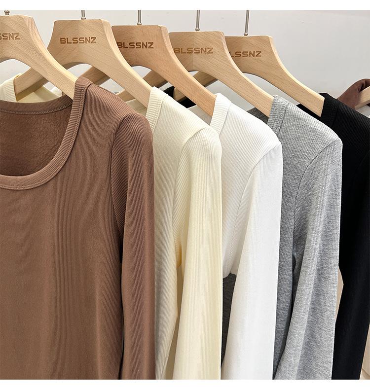 Playera de Manga Larga Cepillada de Estilo Europeo para Mujer, Nueva Primavera Temprana 2023, Top de Color Sólido Ajustado con Forro Polar, Capa Base Moderna para Mujer