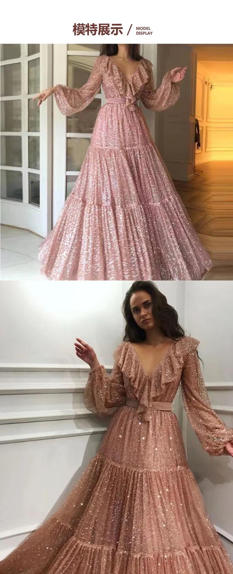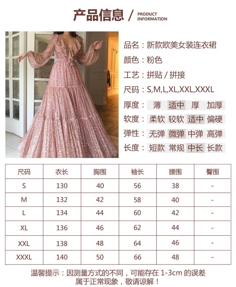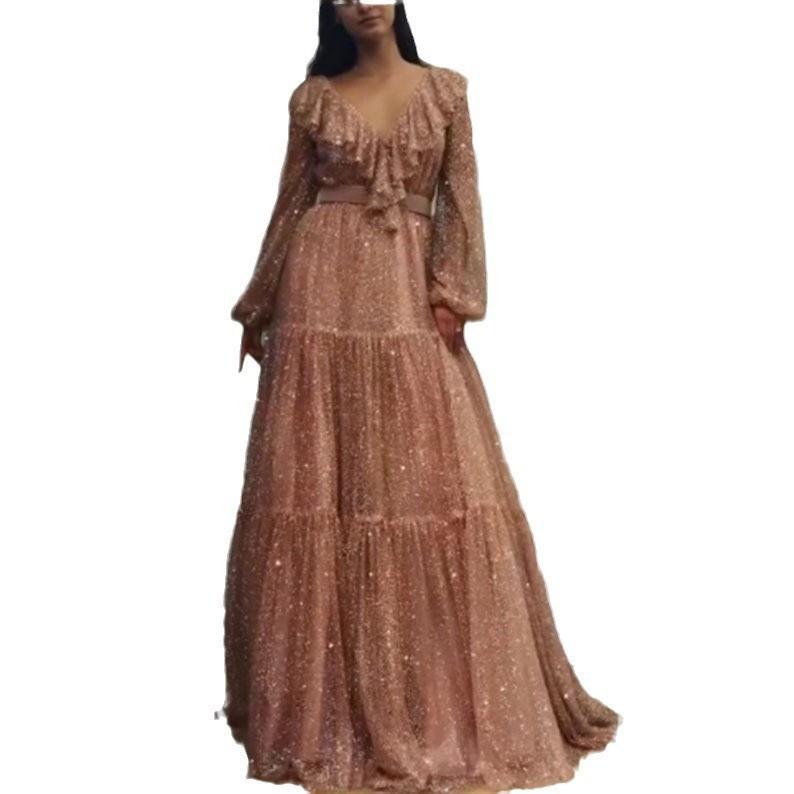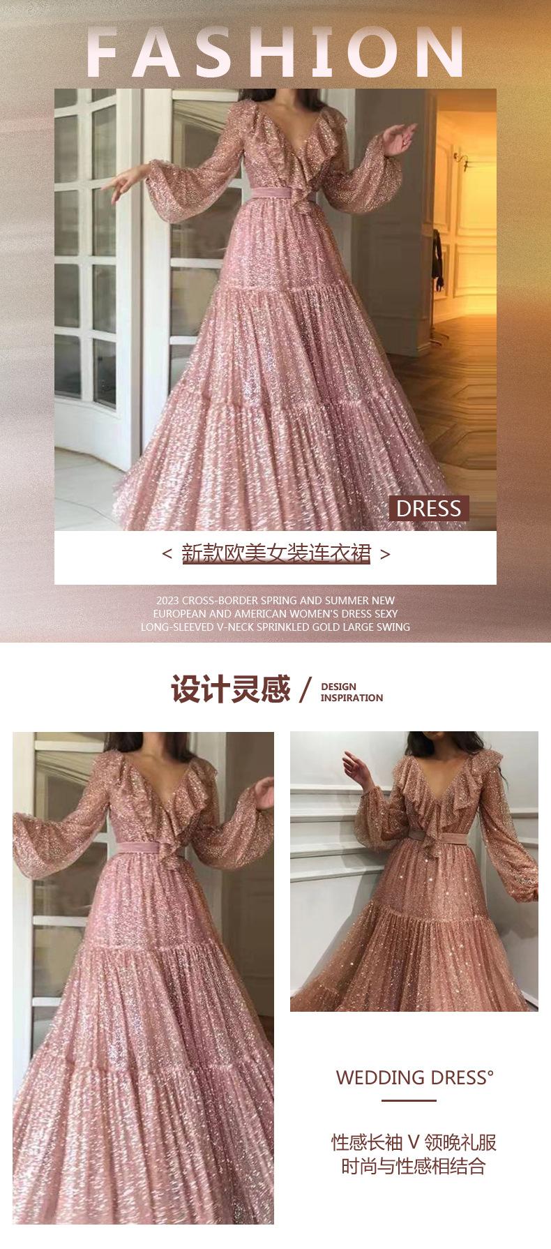Vestido Nuevo Europeo y Americano de Primavera y Verano Transfronterizo 2025 Sexy de Manga Larga con Cuello en V Salpicado de Dorado Vestido de Noche Falda Larga