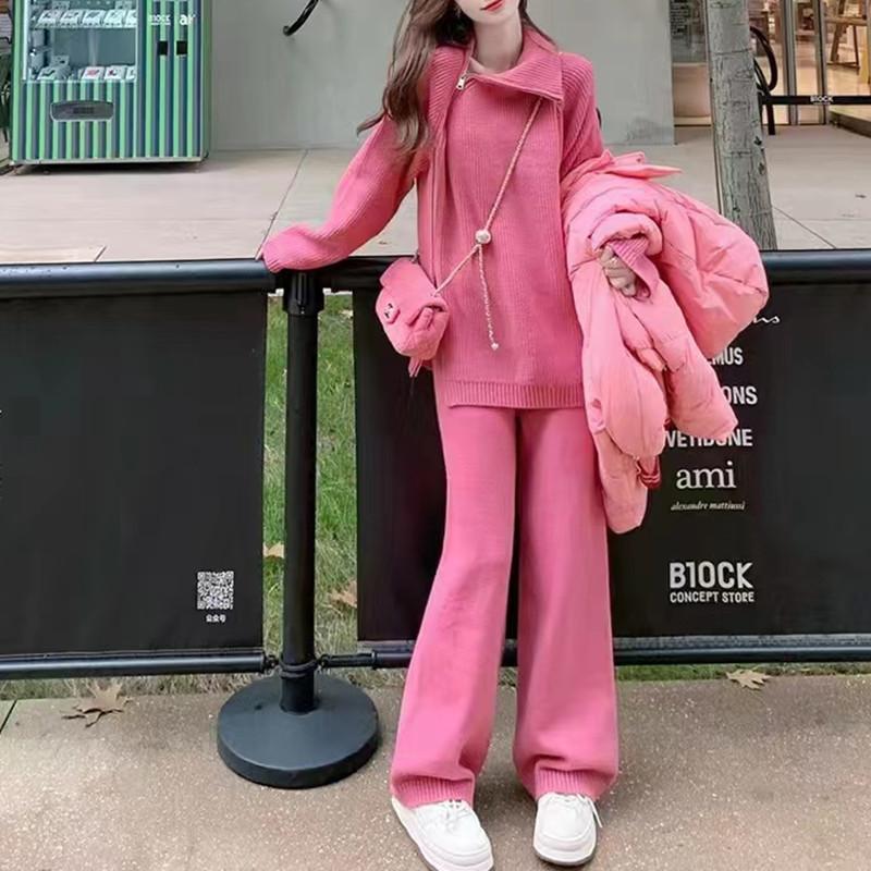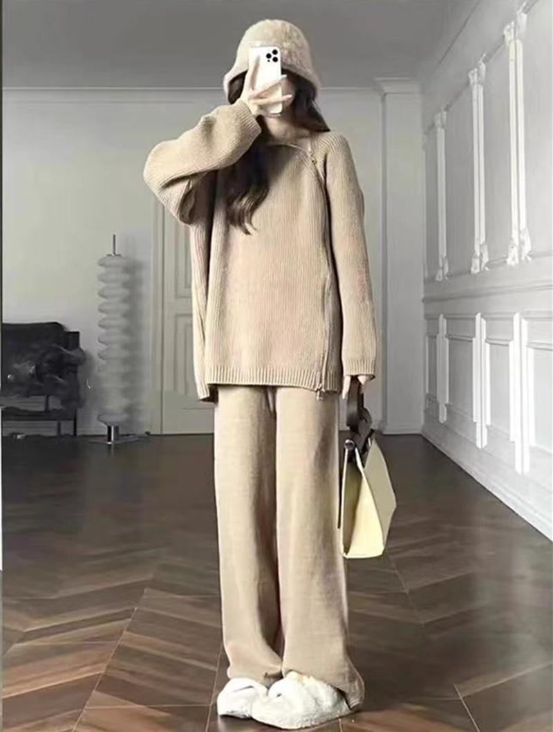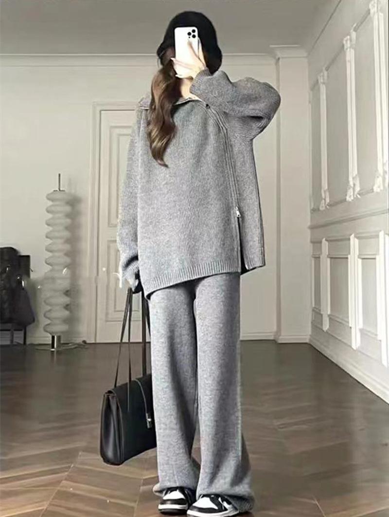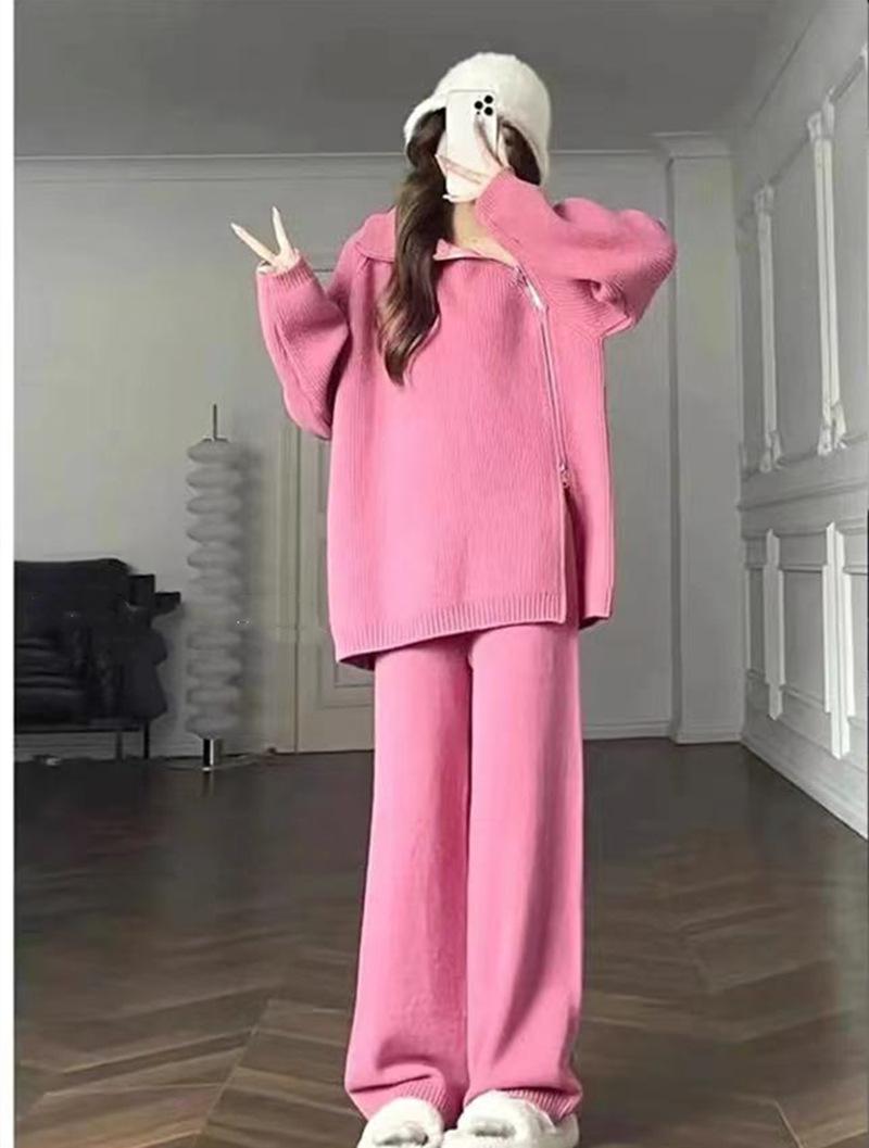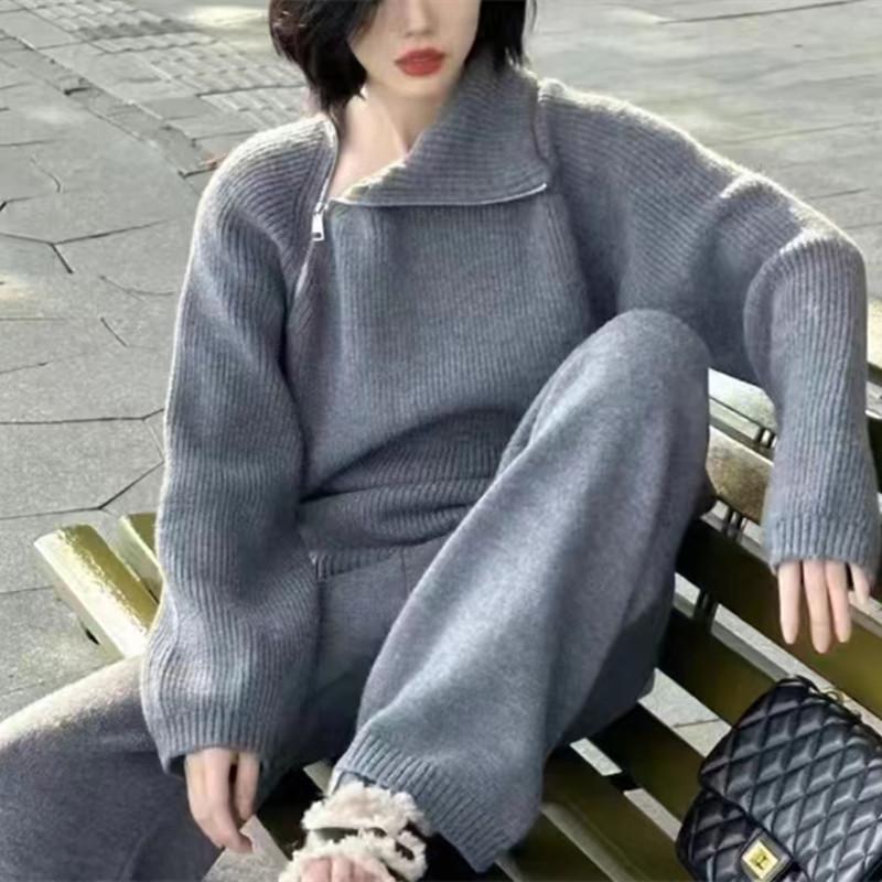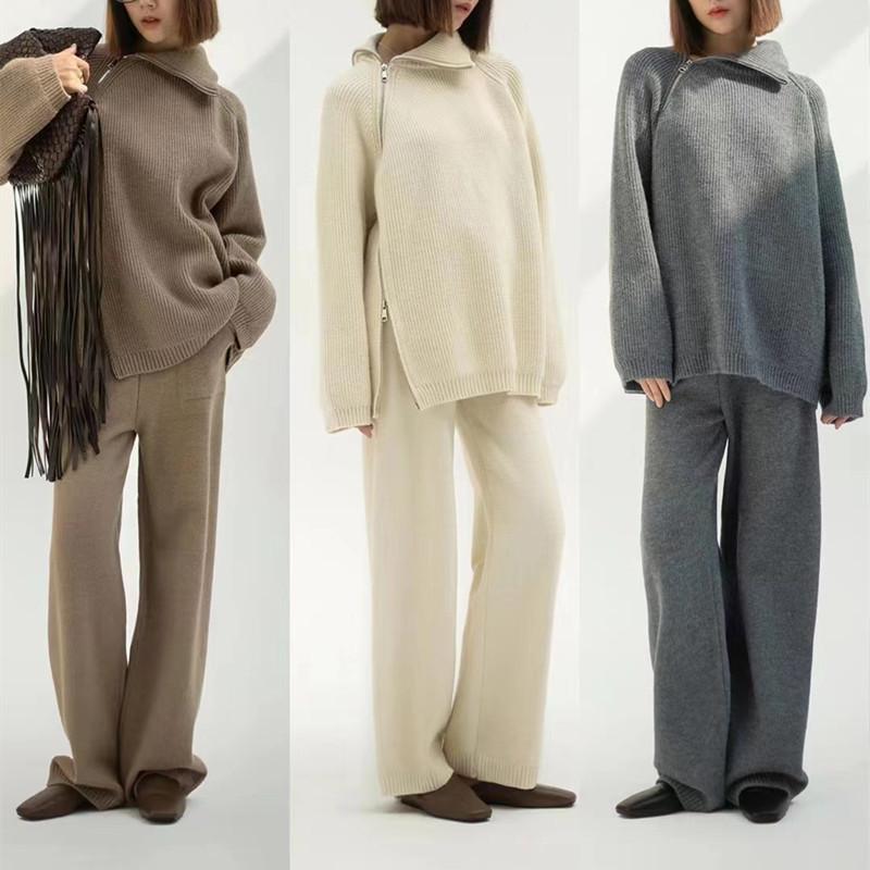 Traje de Punto para Mujer 2024 Estilo Coreano Suelto Nuevo Diseño de Cremallera Lateral Top y Pantalones de Punto Traje de Suéter Moderno