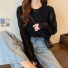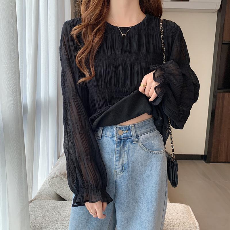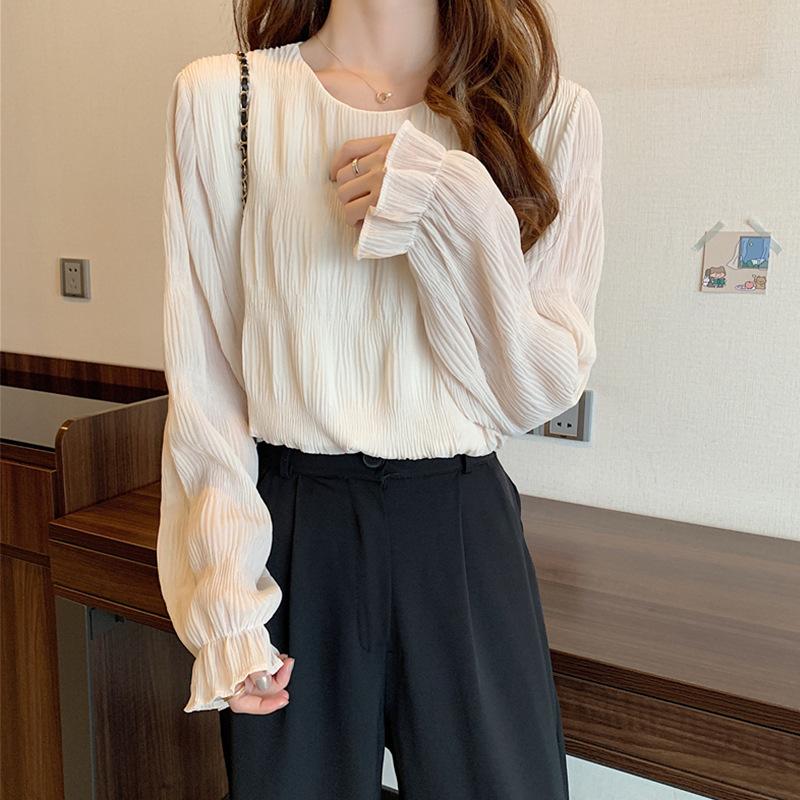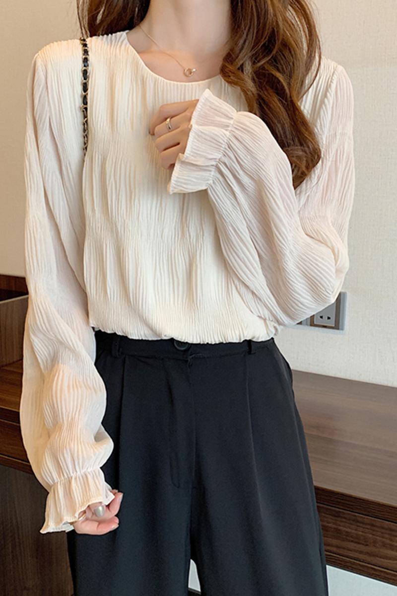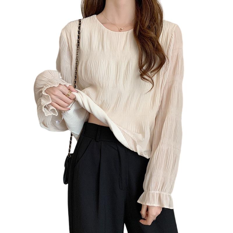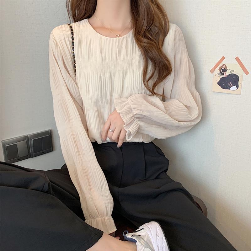 Blusa elegante de gasa para mujer, de primavera y verano, con cuello redondo, sencilla, informal, de color liso, combinable con todo, que cubre el vientre, camisa de corte entallado.