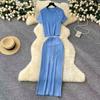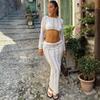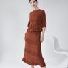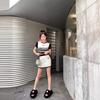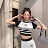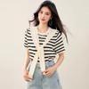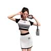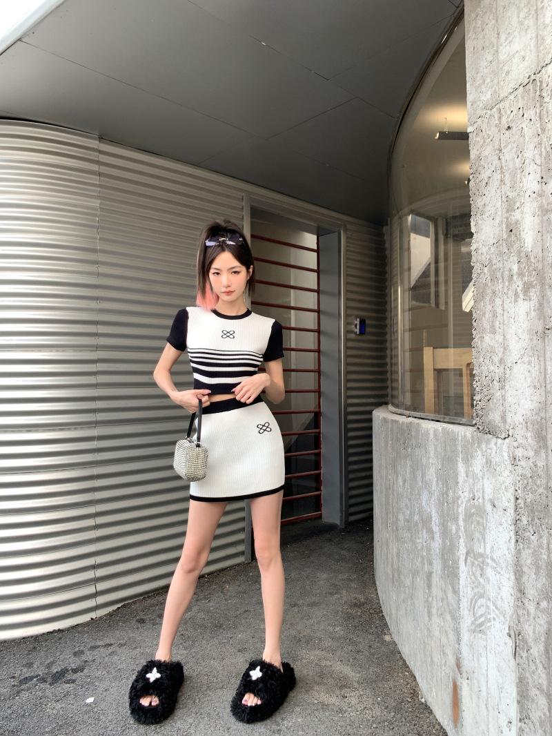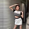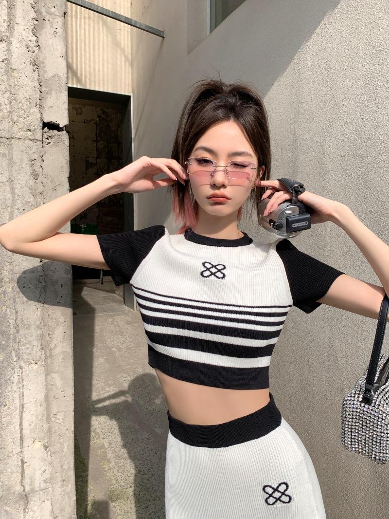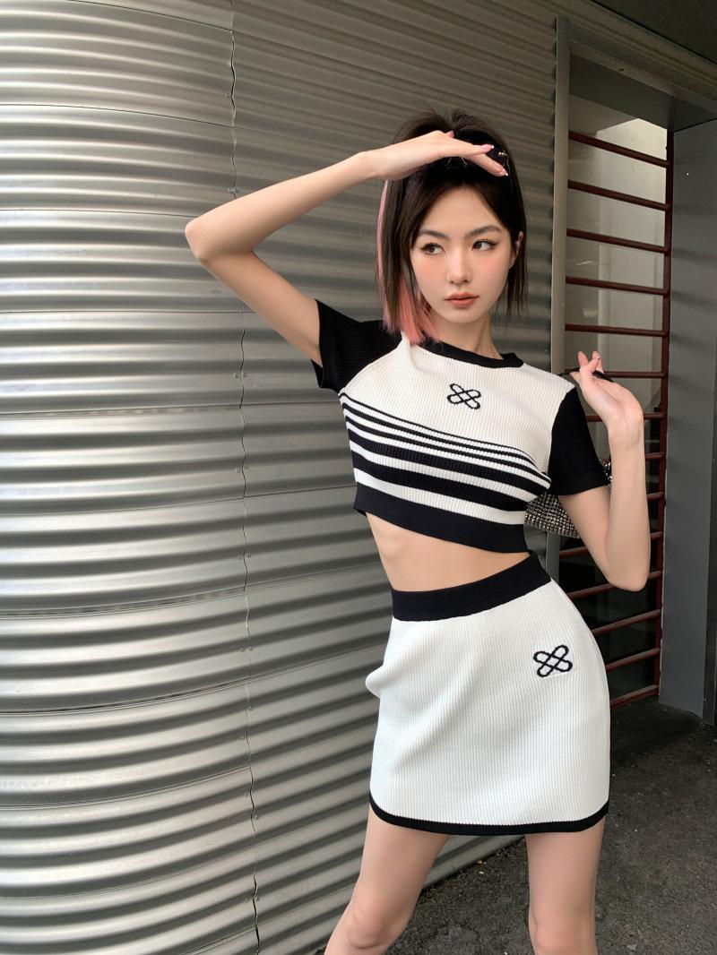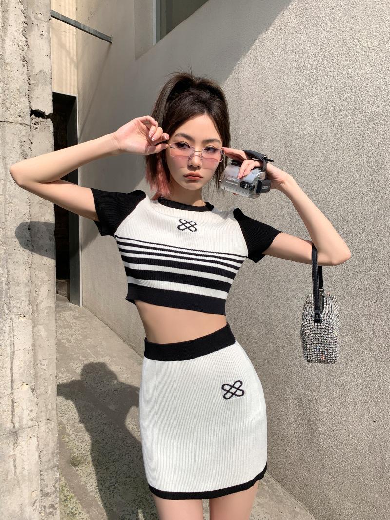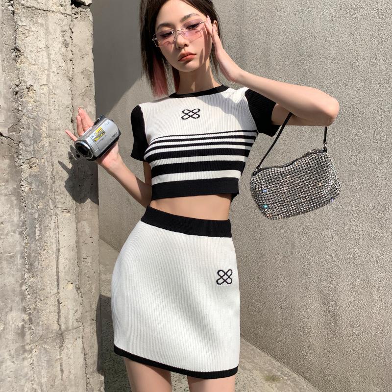 Traje de punto a rayas blanco y negro para mujer, camiseta corta estilo Chanel de cuello redondo, manga corta con camelia + falda midi a la cadera