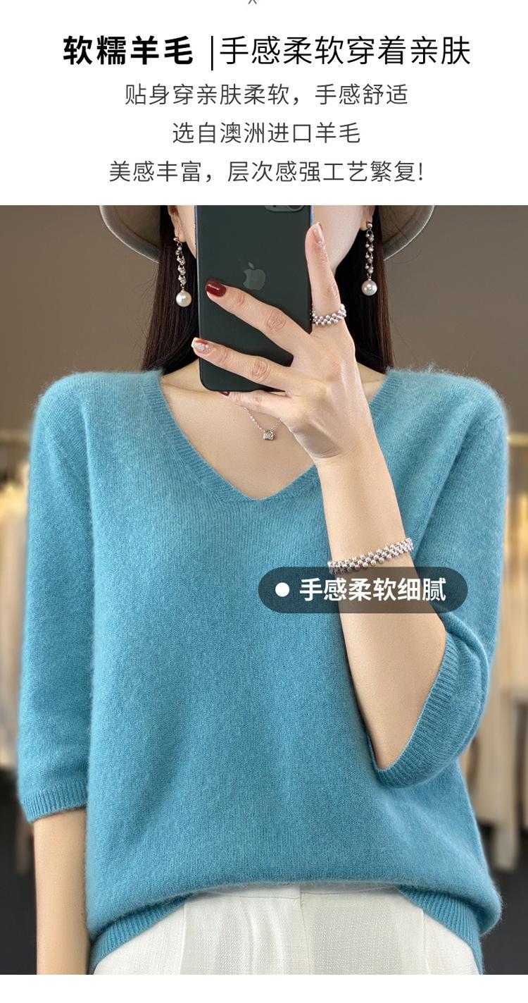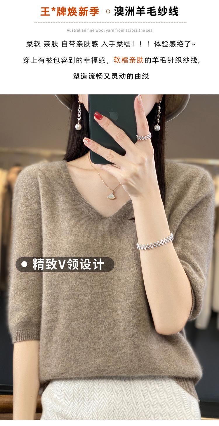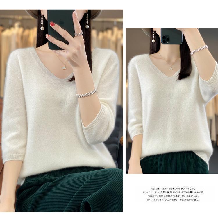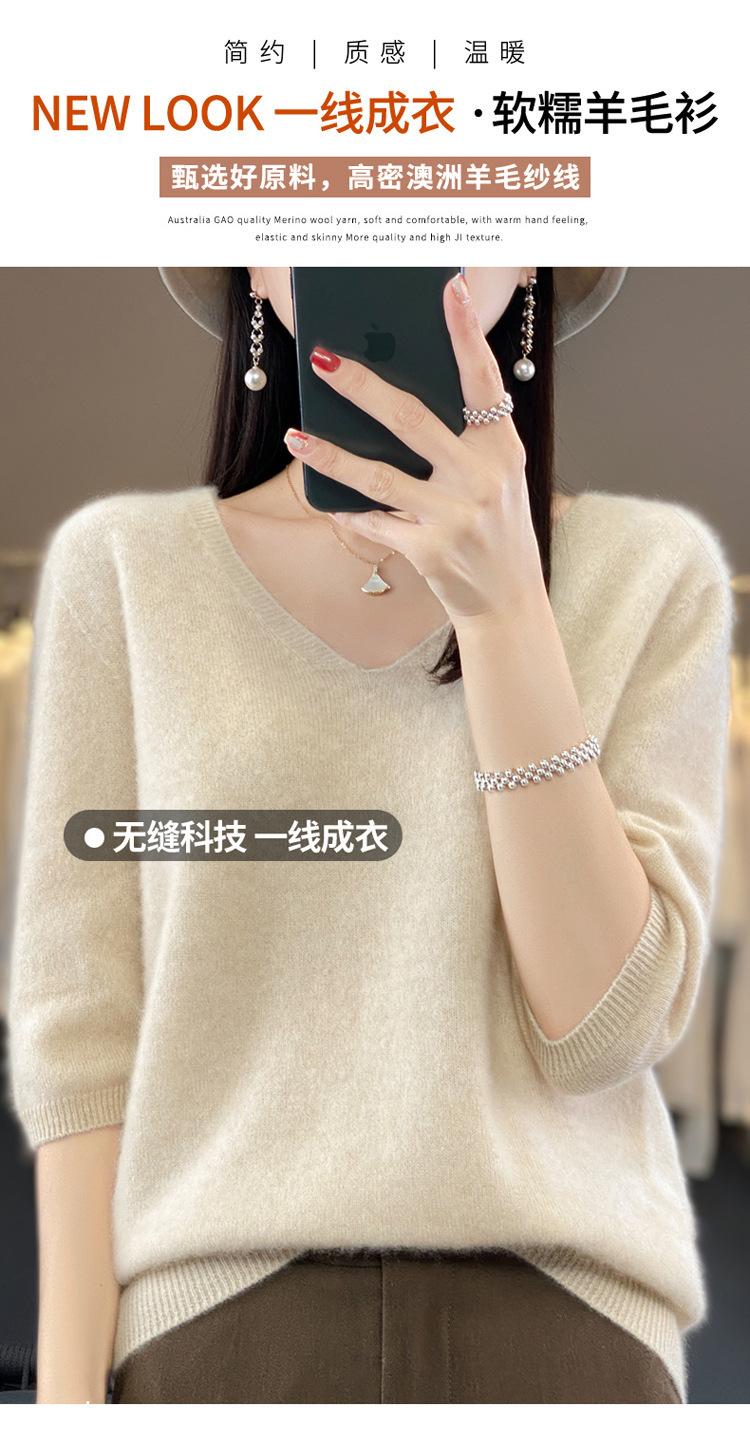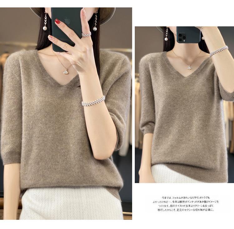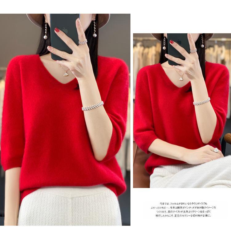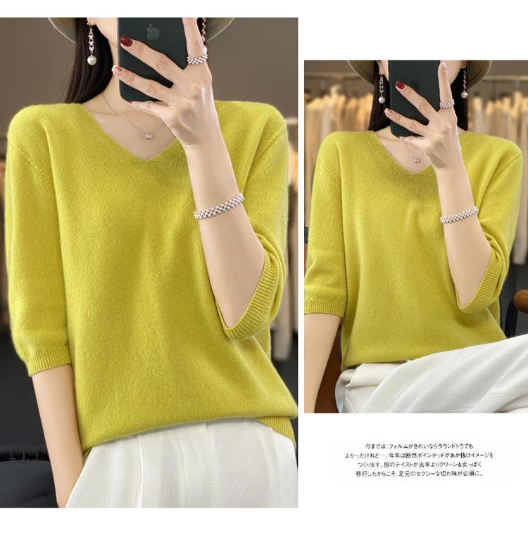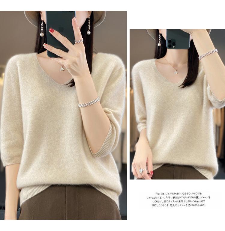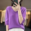 Suéter de punto holgado de manga corta de cinco puntos con cuello en V para mujer, nuevo para otoño e invierno 2023, de primera línea listo para usar, pura lana