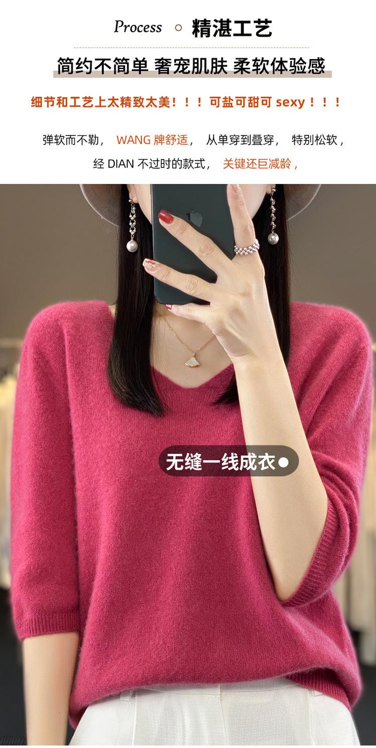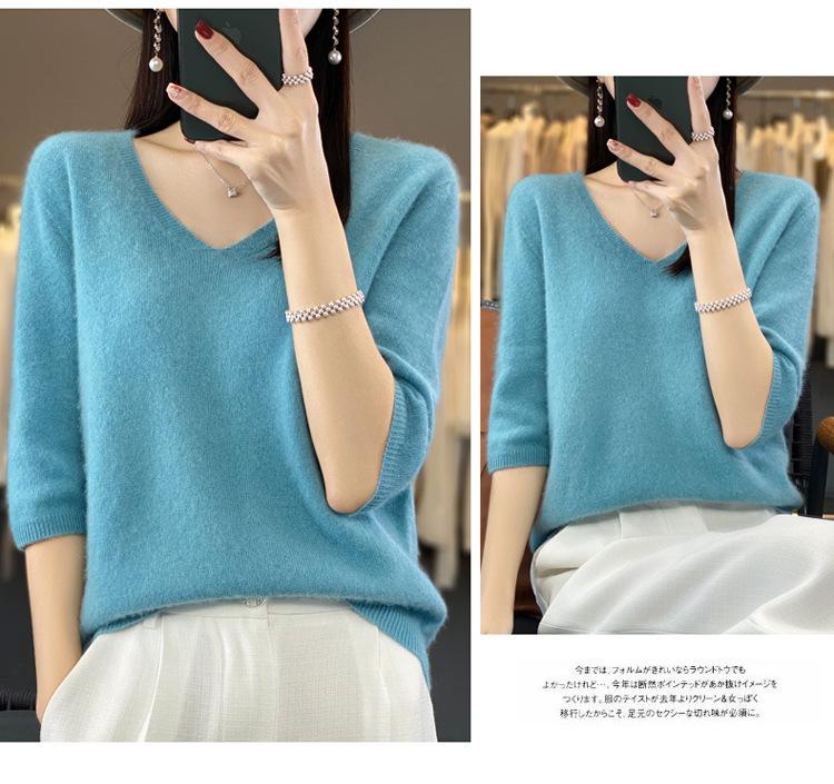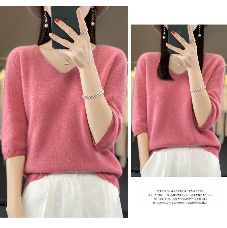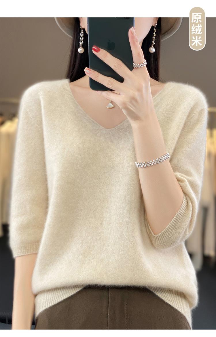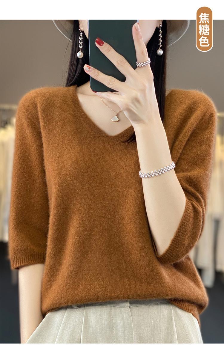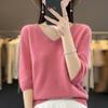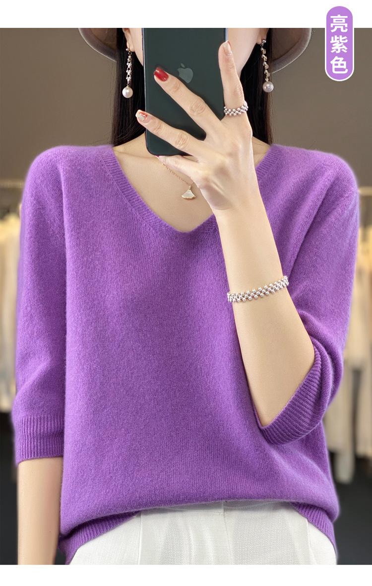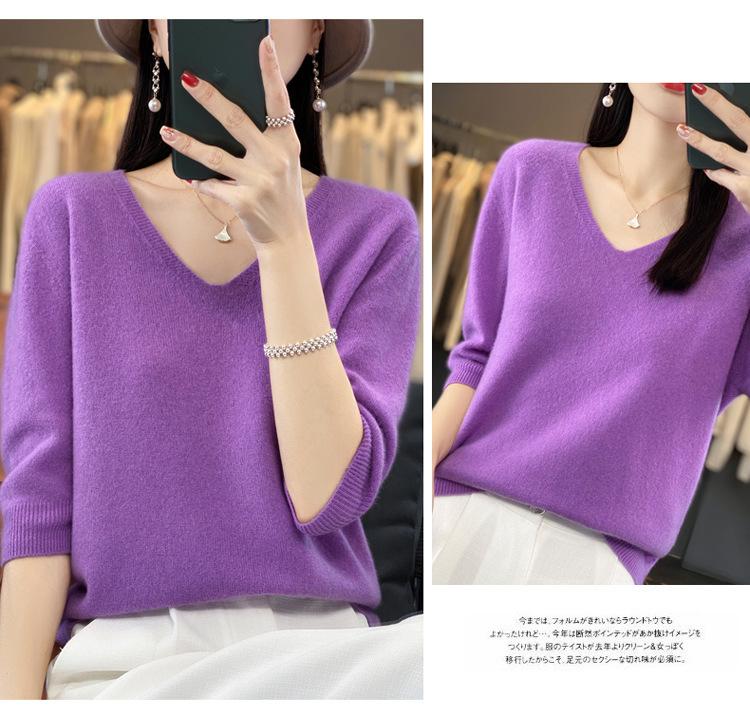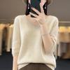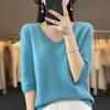 Suéter de punto holgado de manga corta de cinco puntos con cuello en V para mujer, nuevo para otoño e invierno 2023, de primera línea listo para usar, pura lana