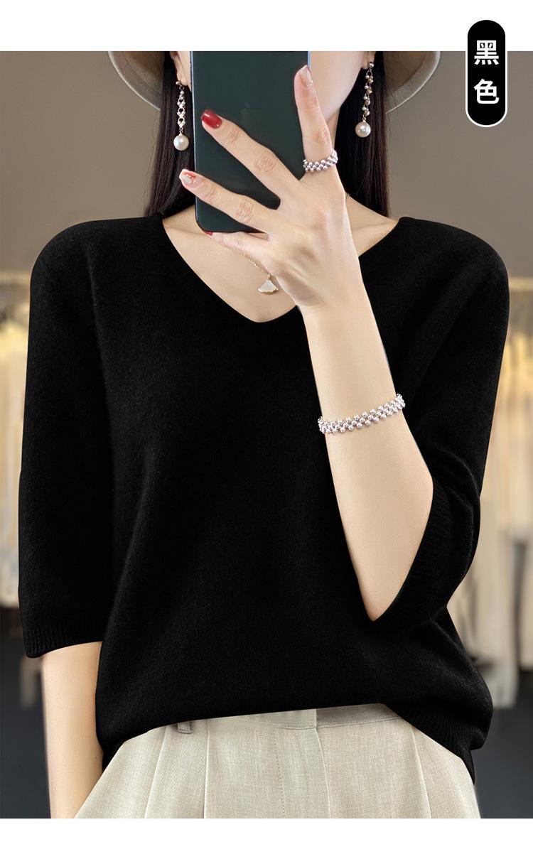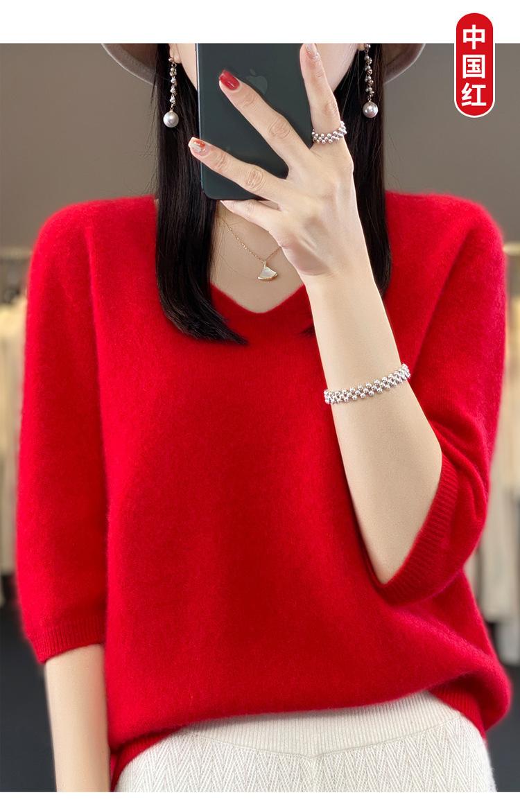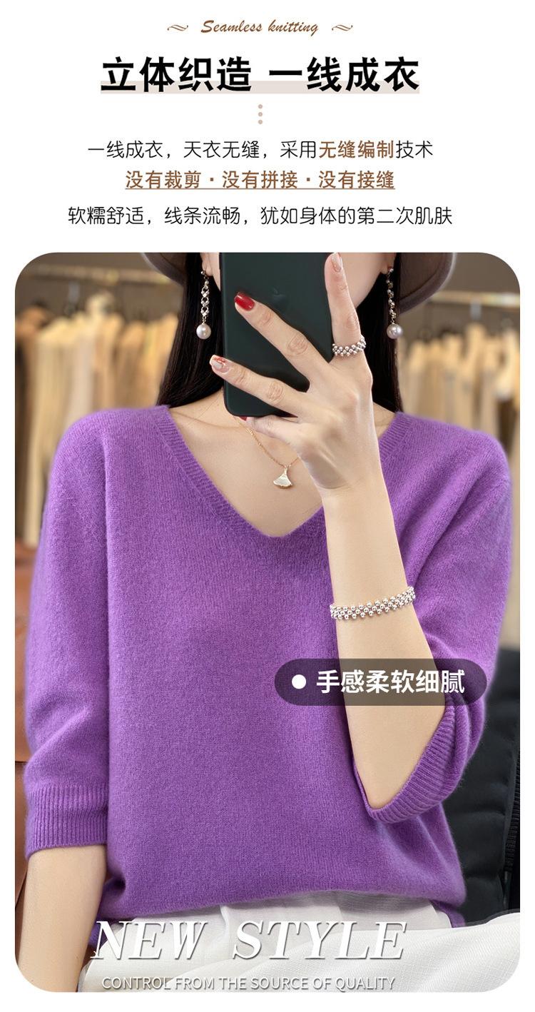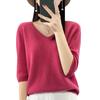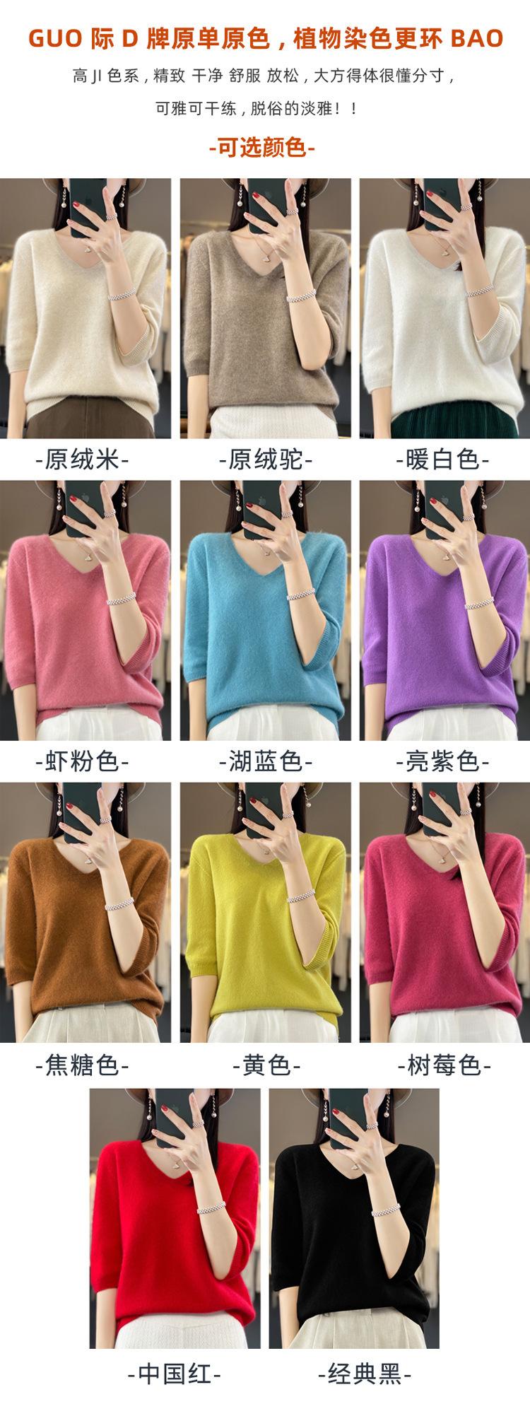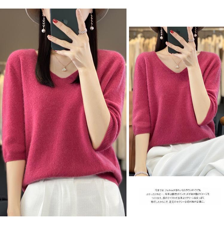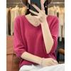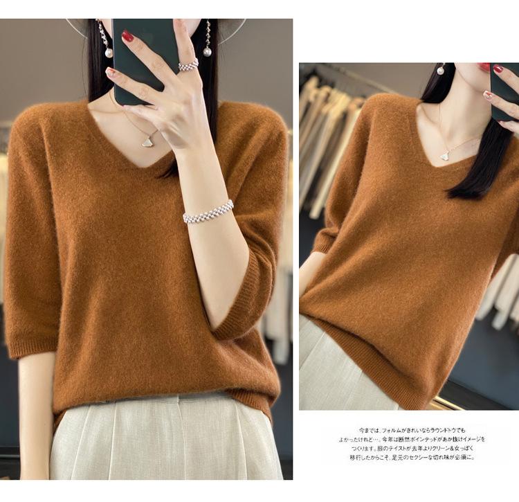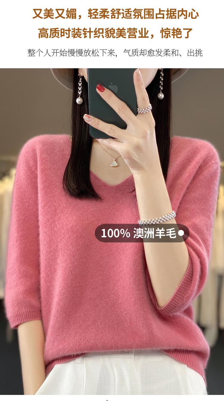 Suéter de punto holgado de manga corta de cinco puntos con cuello en V para mujer, nuevo para otoño e invierno 2023, de primera línea listo para usar, pura lana
