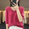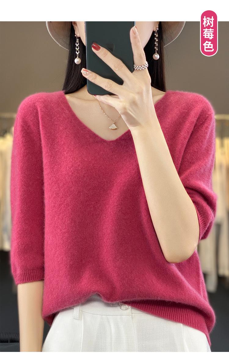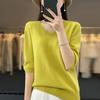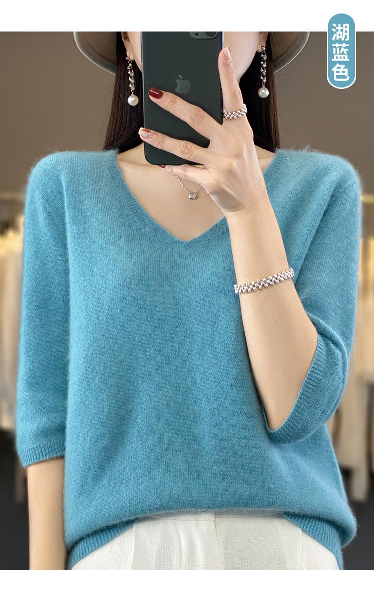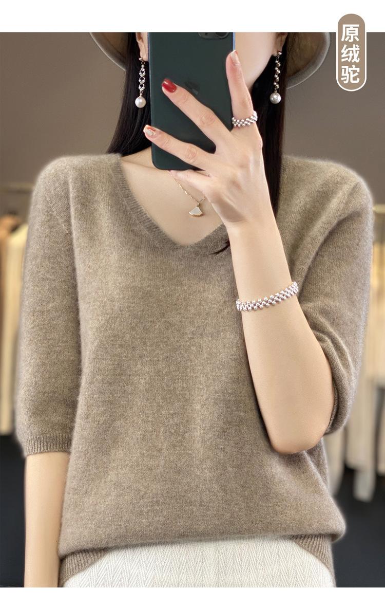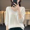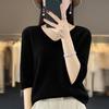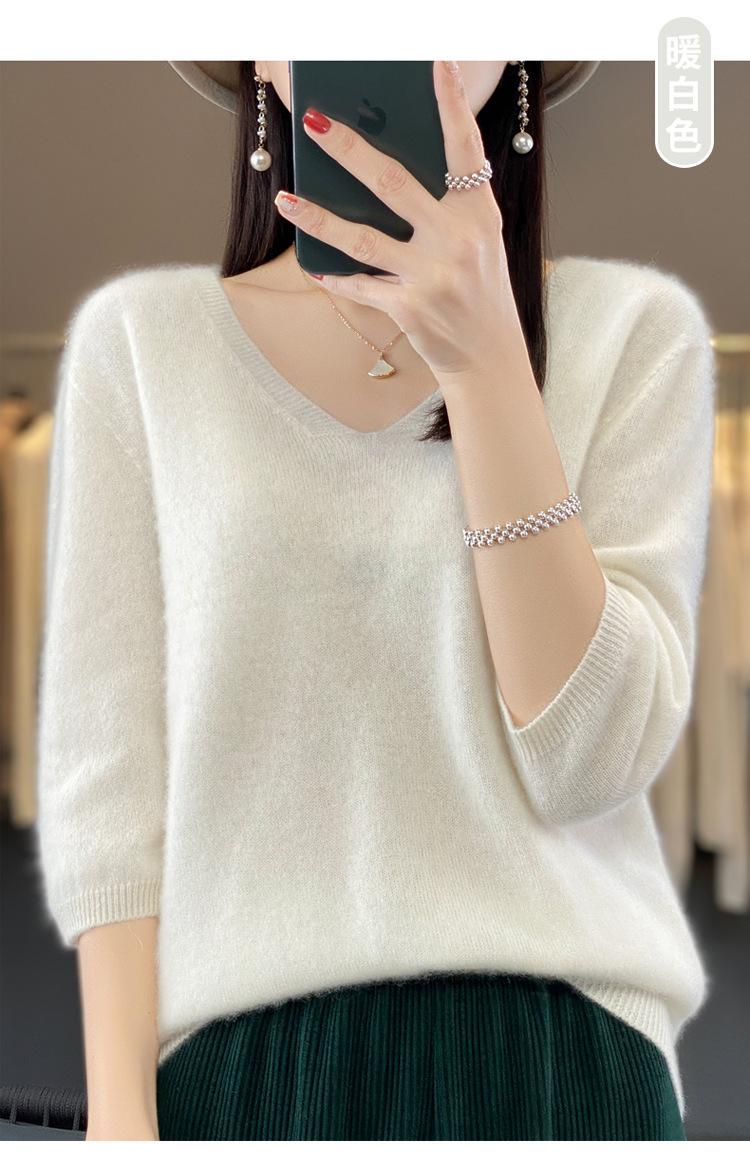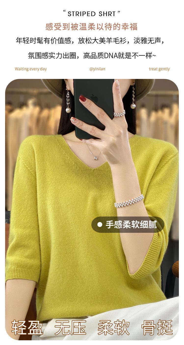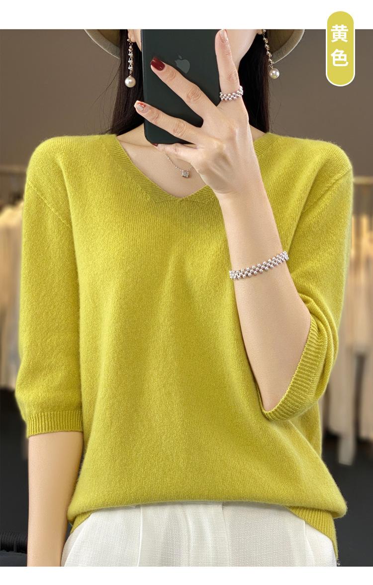 Suéter de punto holgado de manga corta de cinco puntos con cuello en V para mujer, nuevo para otoño e invierno 2023, de primera línea listo para usar, pura lana