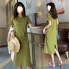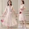 Vestido midi de seda color leche con escote en V y mangas cortas, estampado elegante de primavera y verano, de cintura media y azul marino.