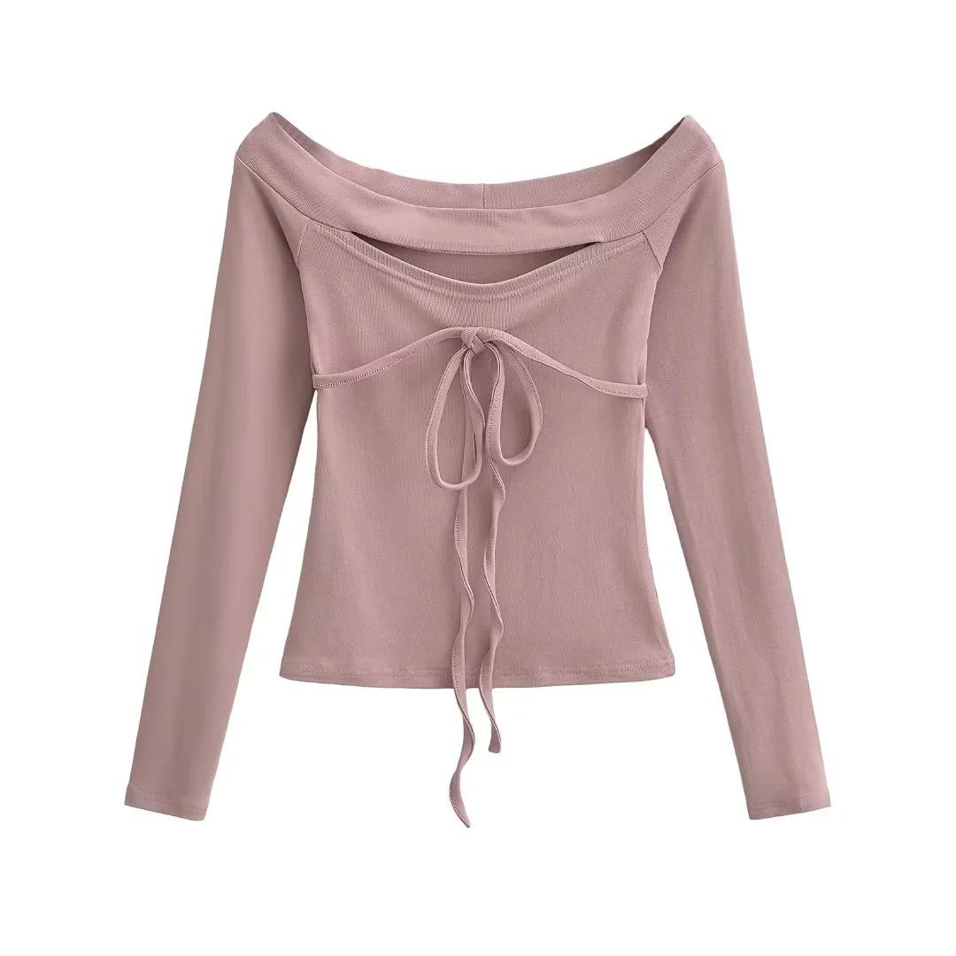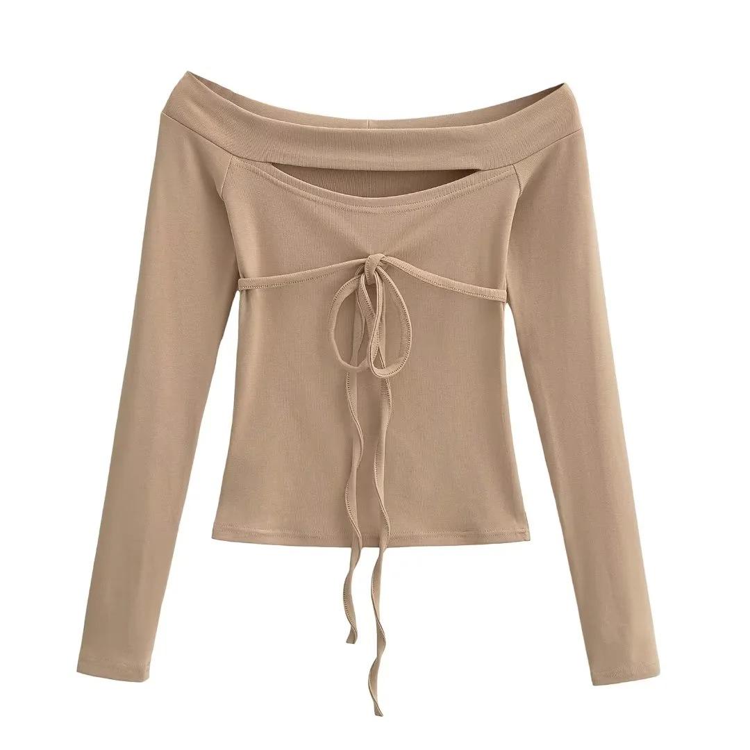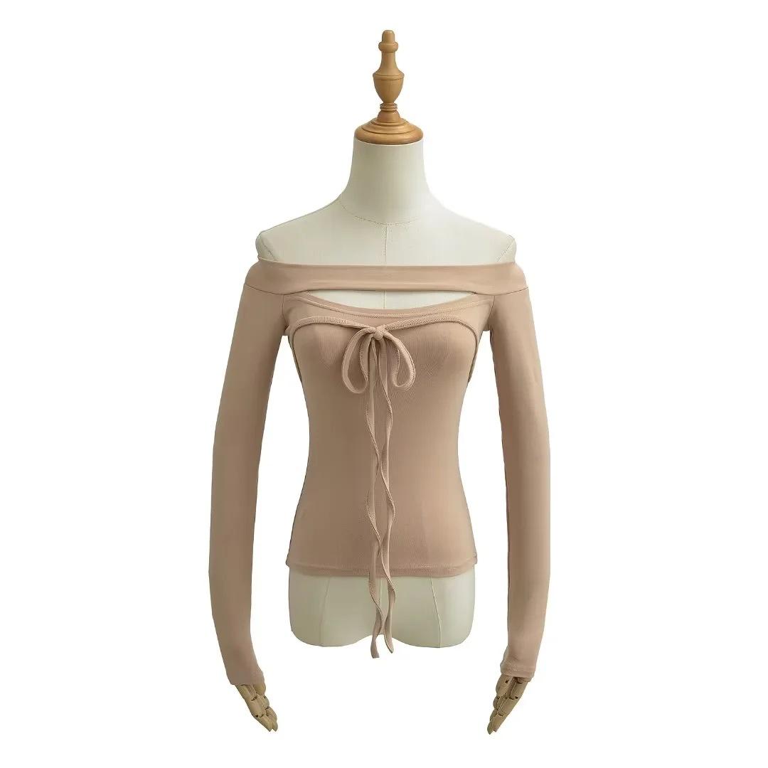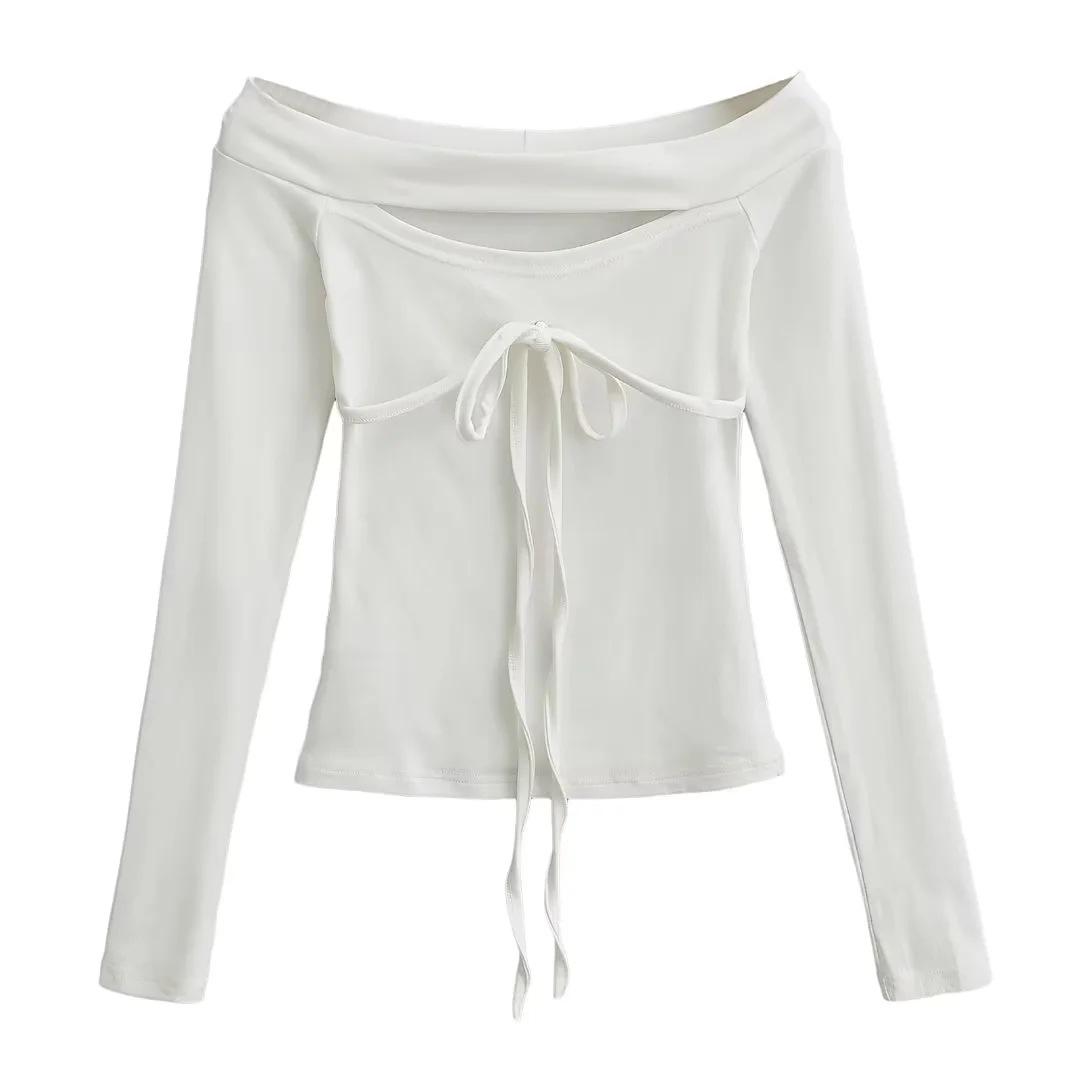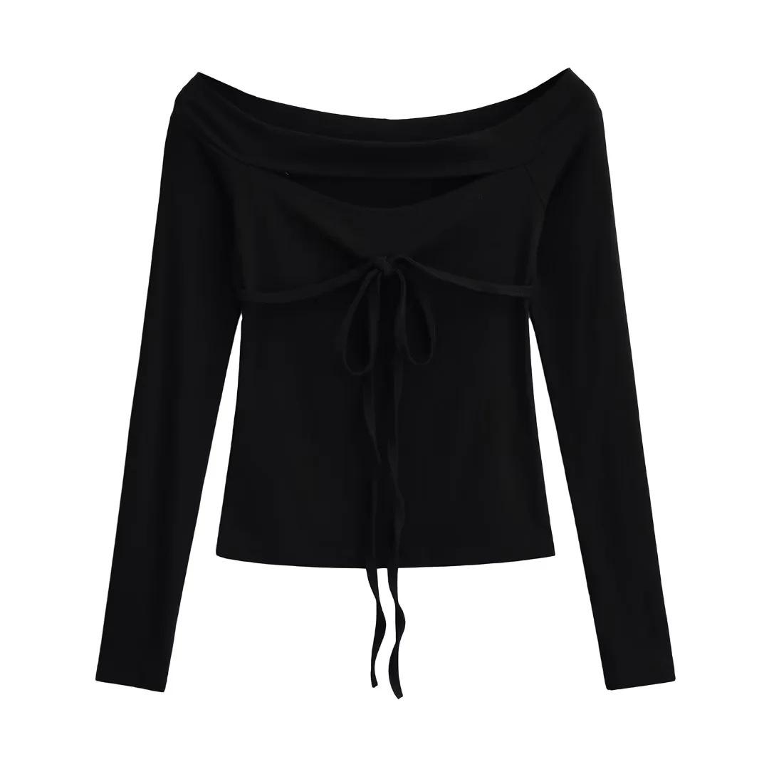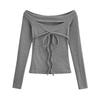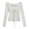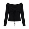 Camiseta corta hueca con lazo en el pecho y cordones, estilo americano, sexy, de manga larga y hombros descubiertos, estilo suave, para mujer