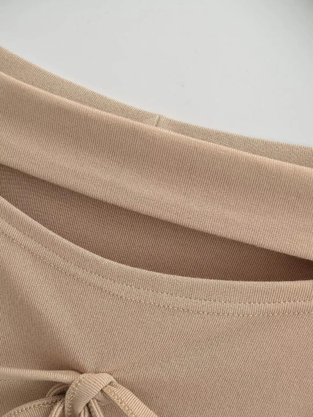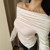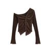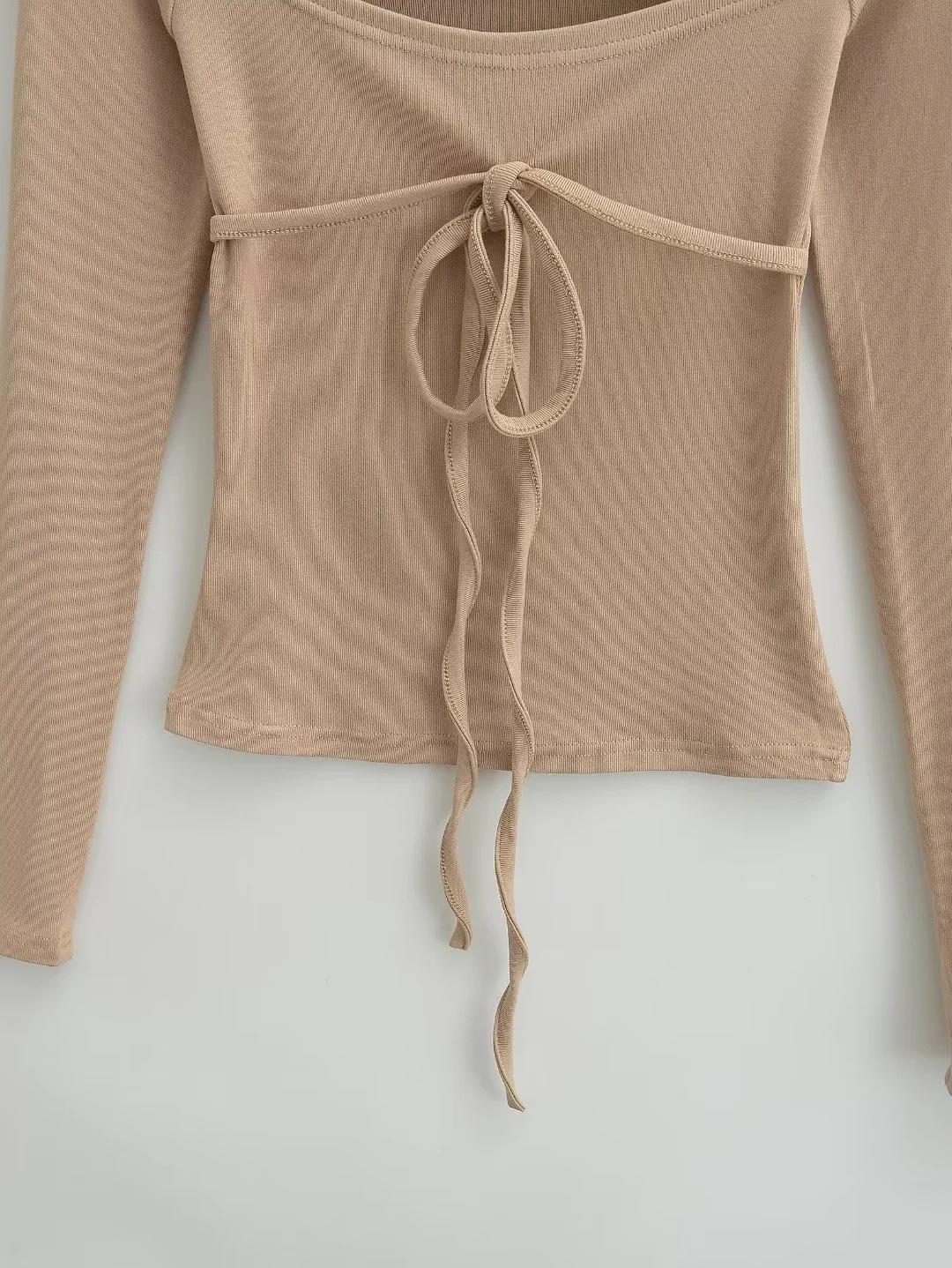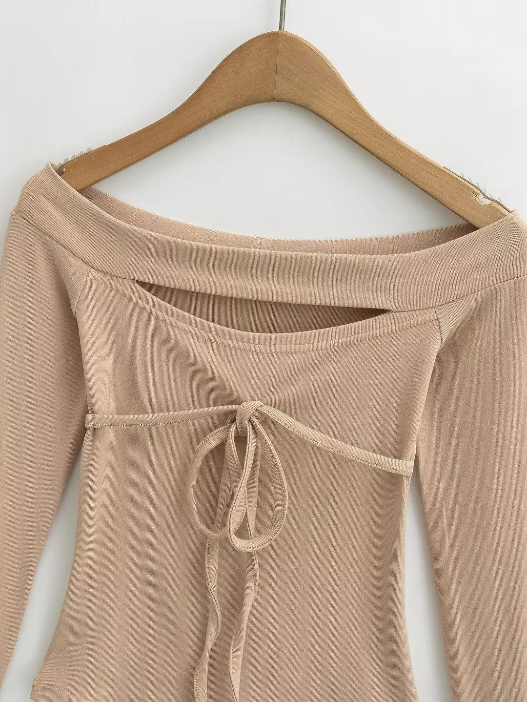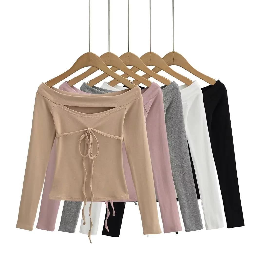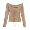 Camiseta corta hueca con lazo en el pecho y cordones, estilo americano, sexy, de manga larga y hombros descubiertos, estilo suave, para mujer