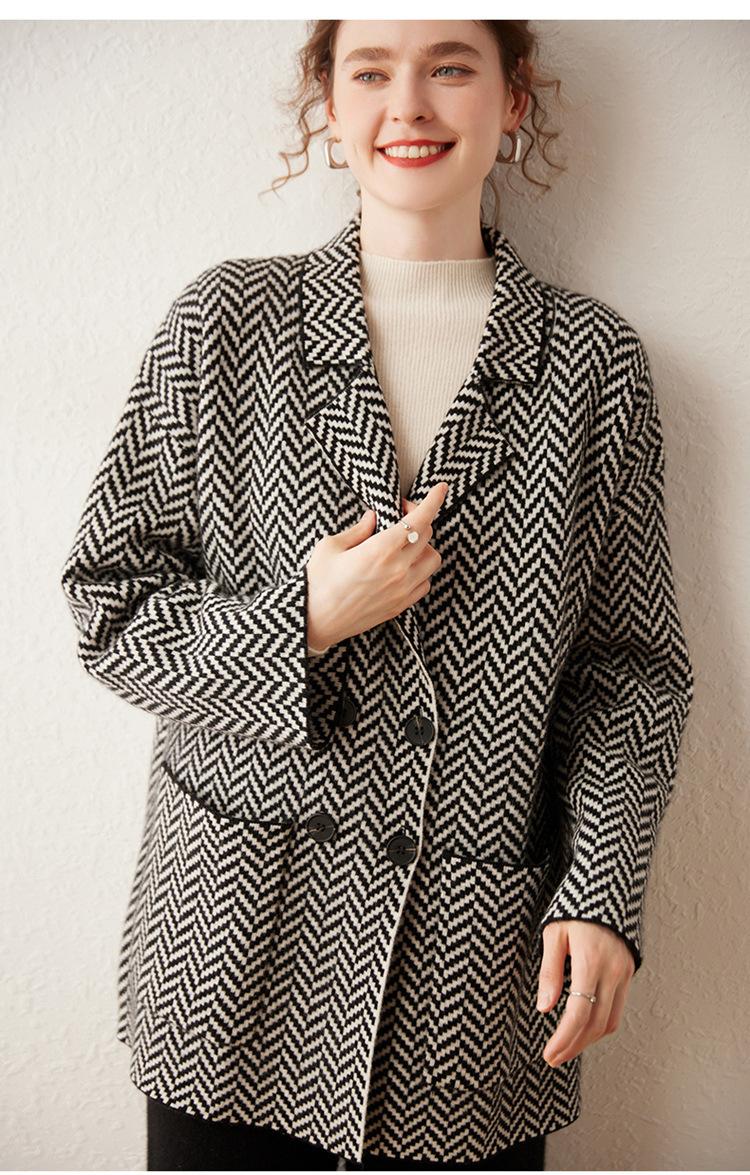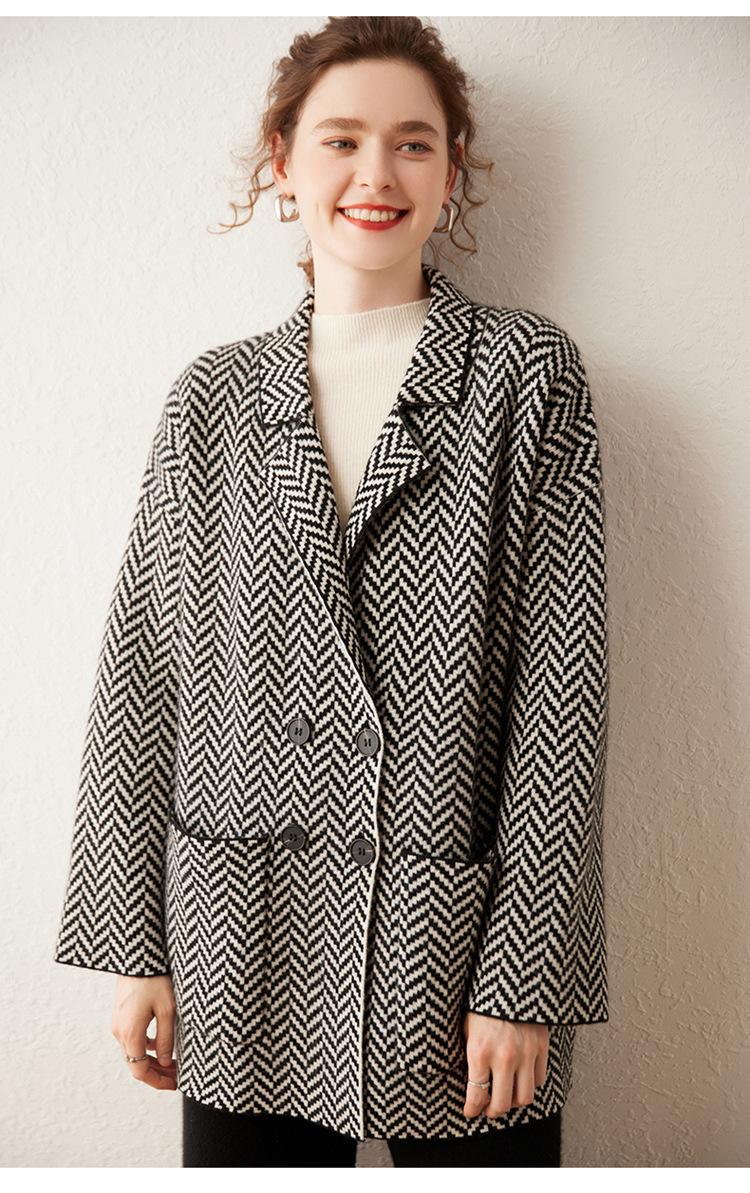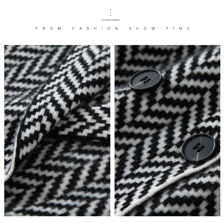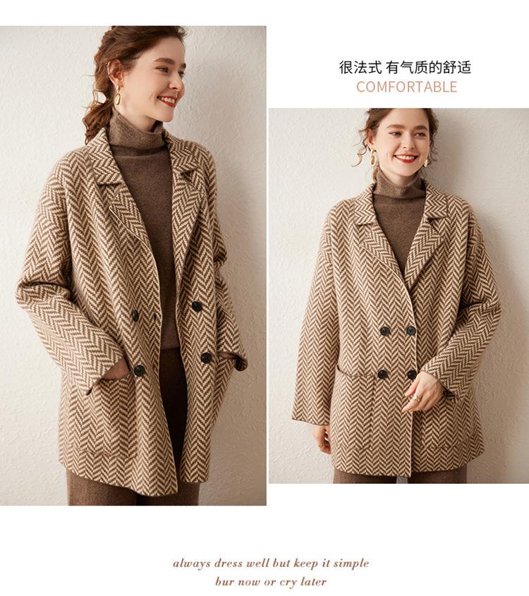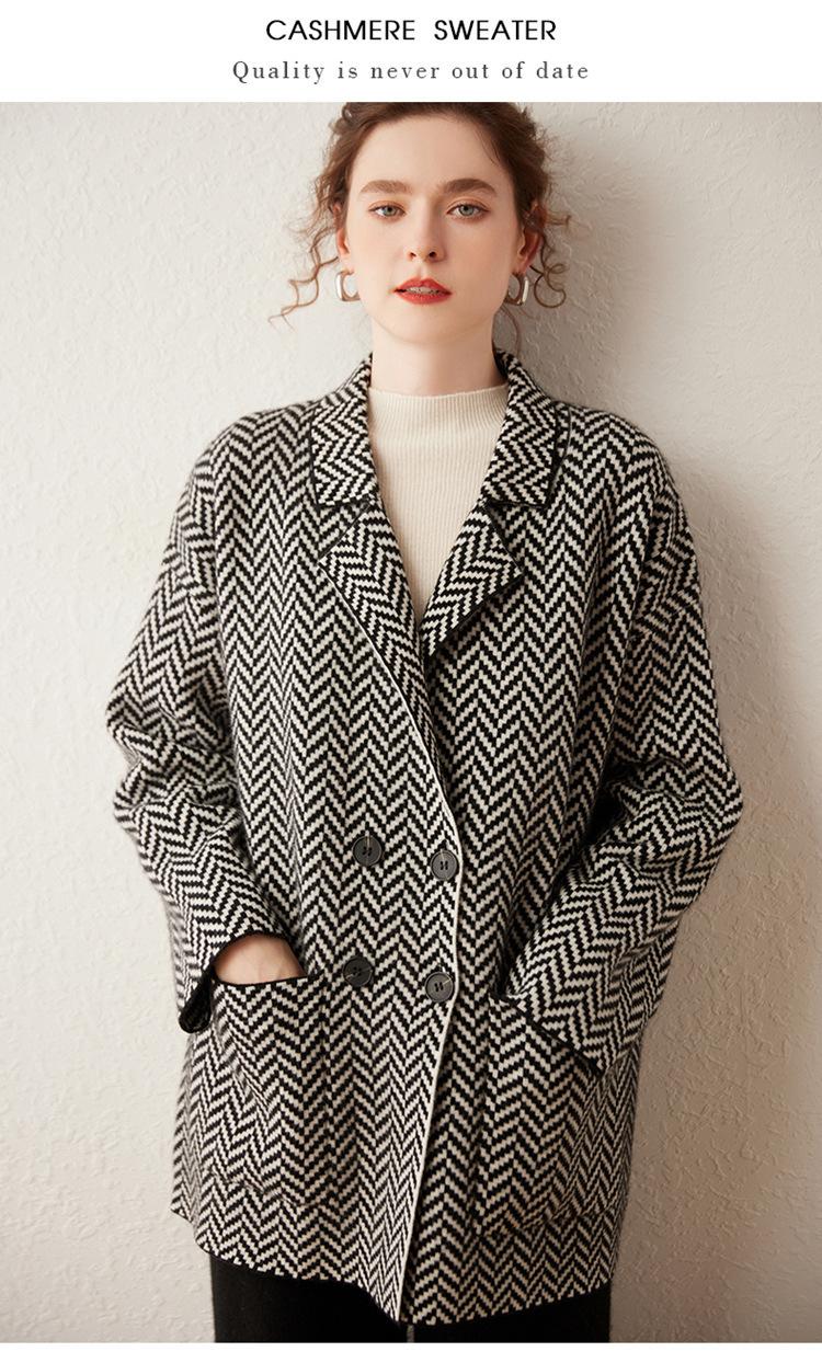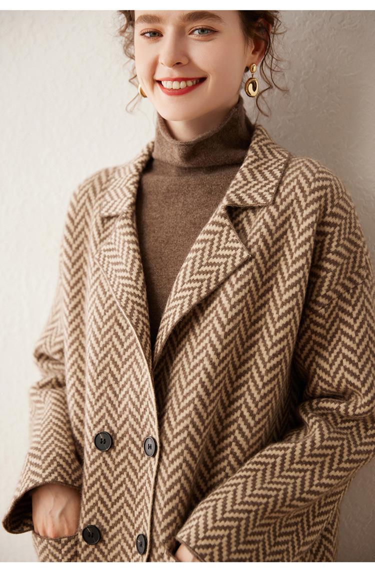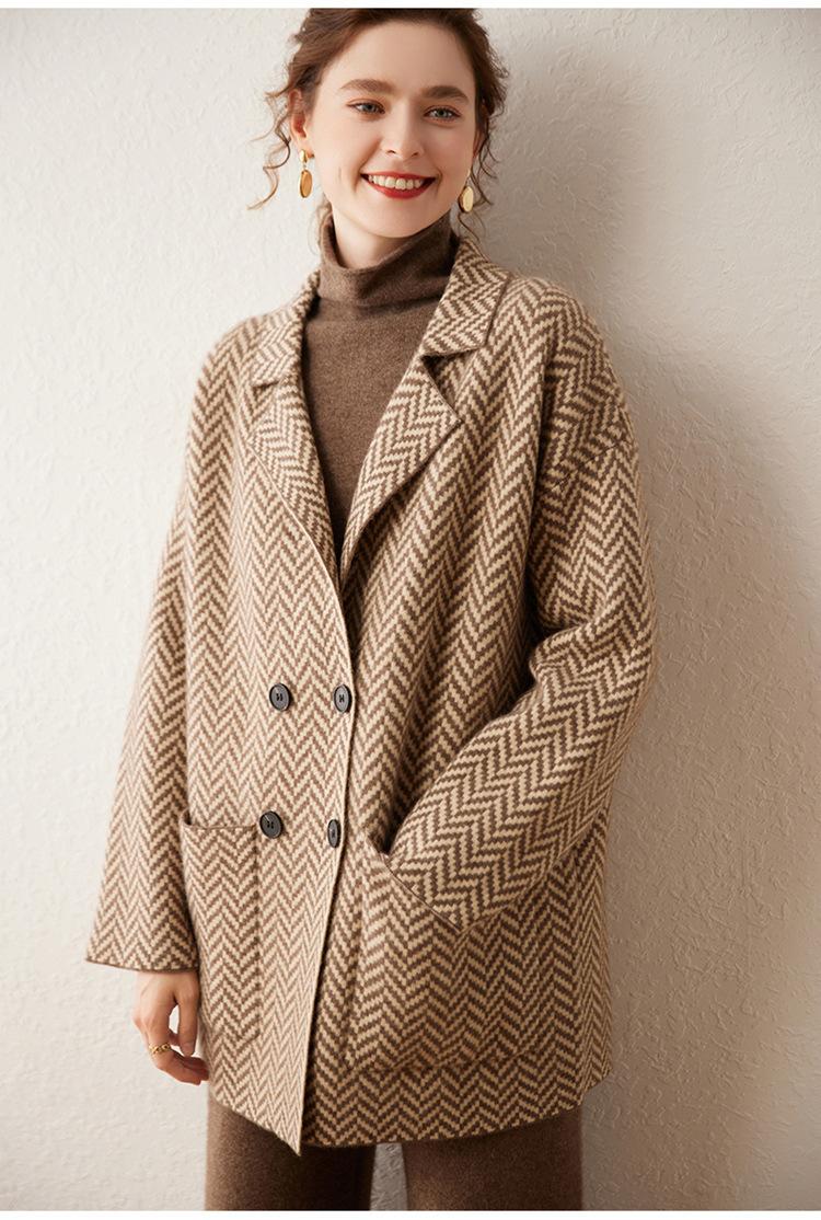 Abrigo de cachemira de otoño e invierno para mujer, cuello de traje, estilo británico, cruzado, largo medio, grueso, con estampado de espiga, cárdigan suelto