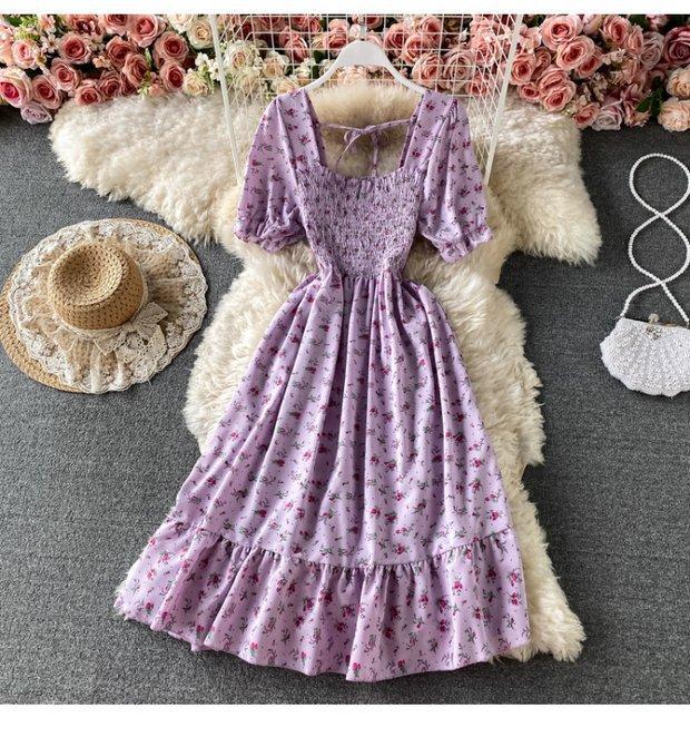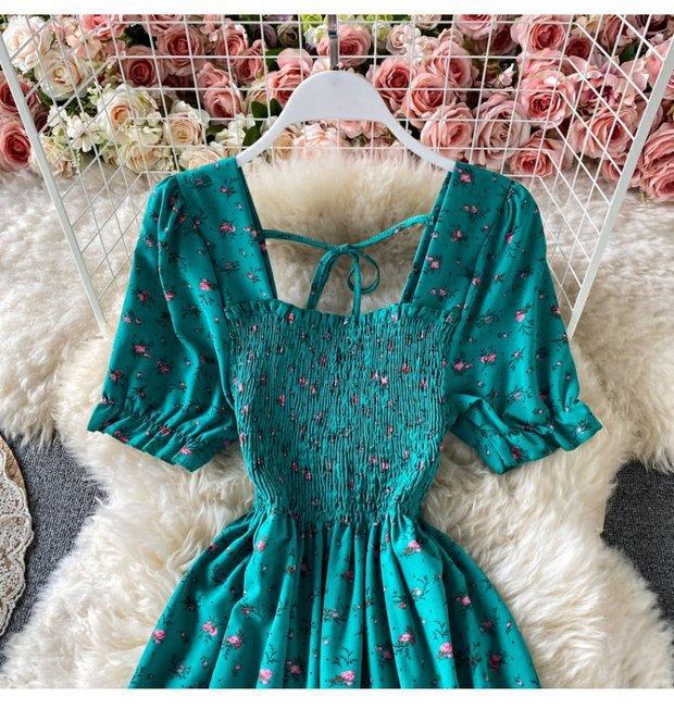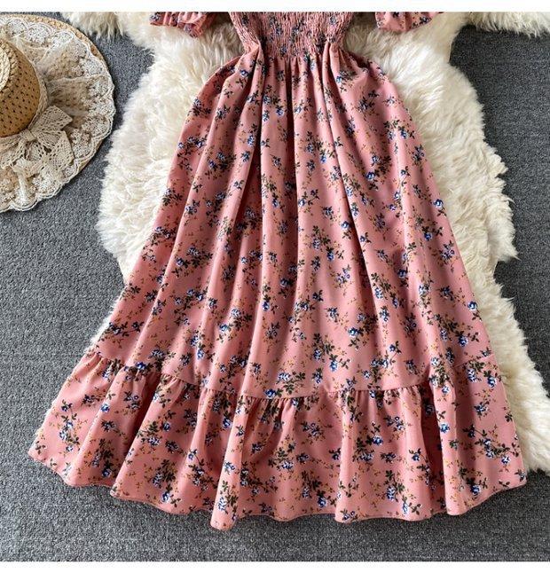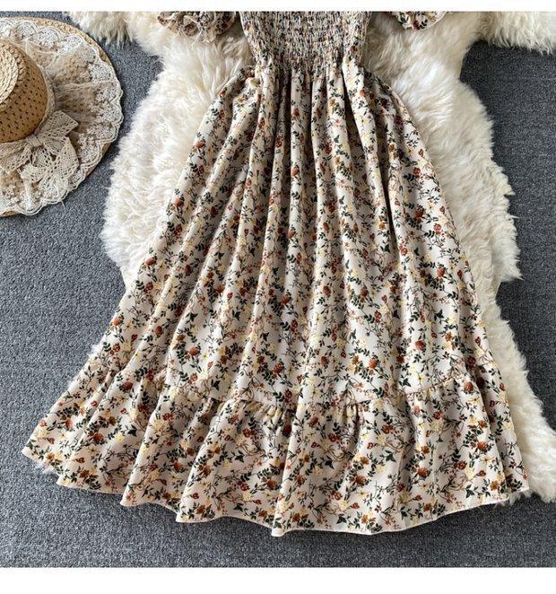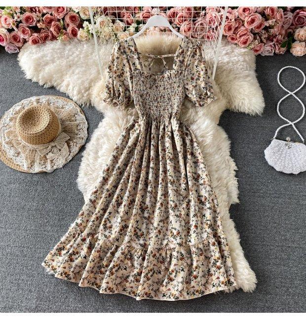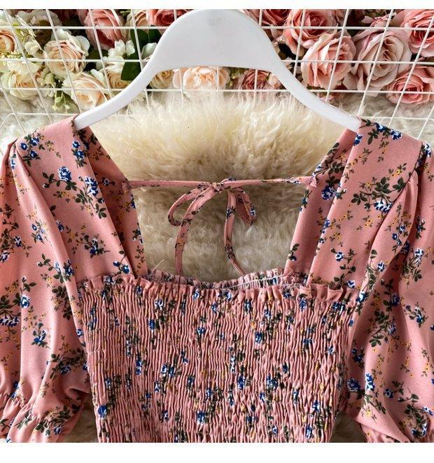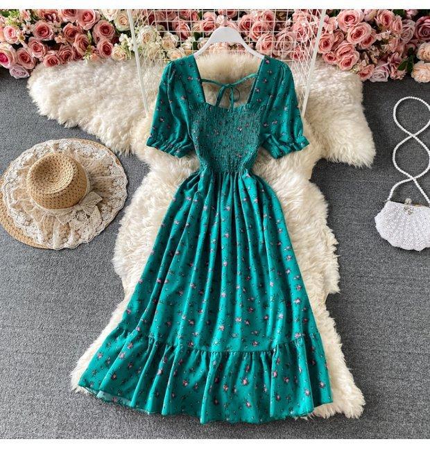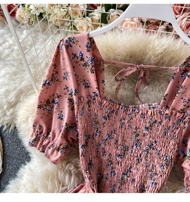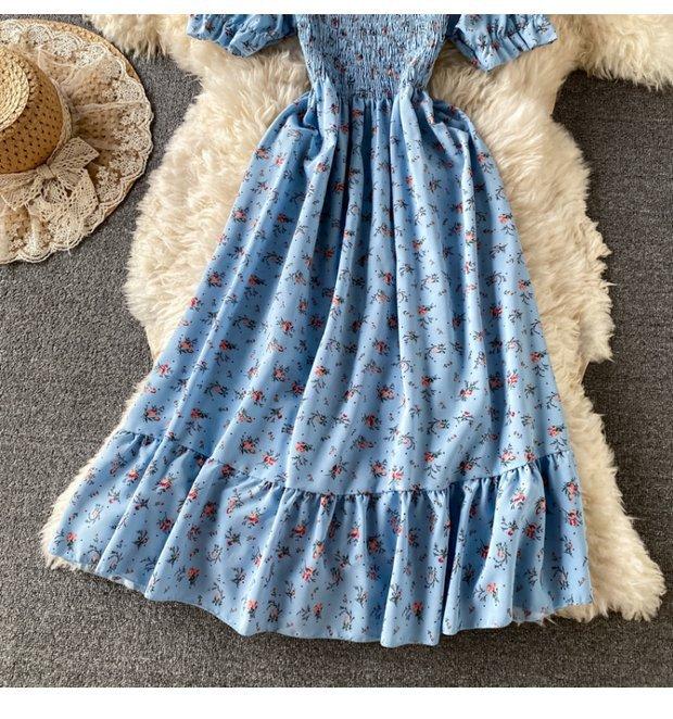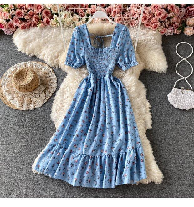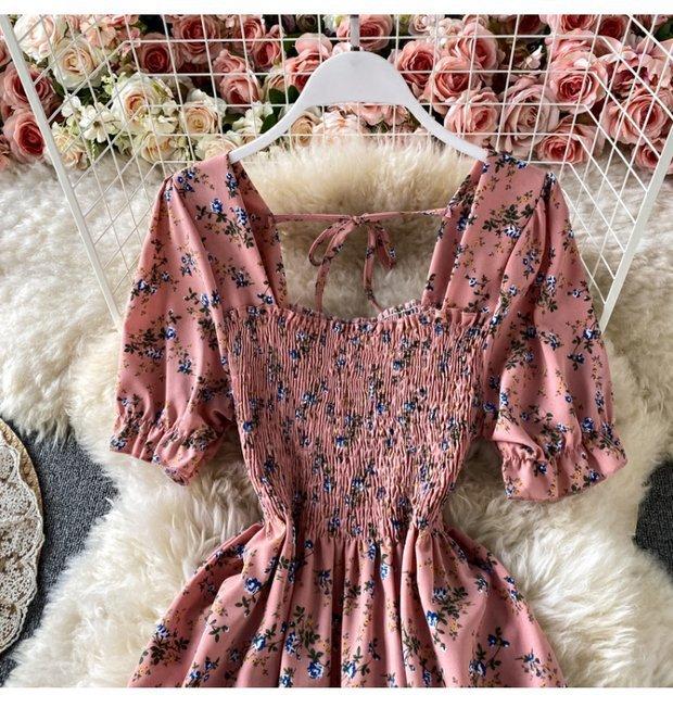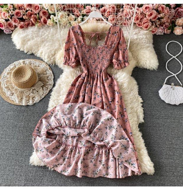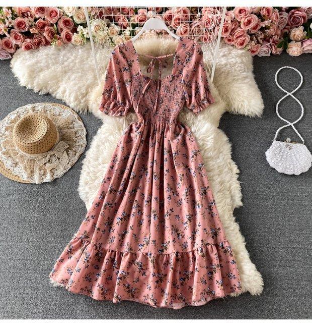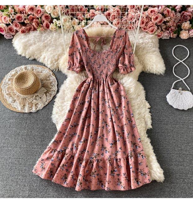 Vestido floral predicador para mujer, dulce vestido de hada con cuello cuadrado francés, plisado, largo medio, adelgazante y cintura alta.