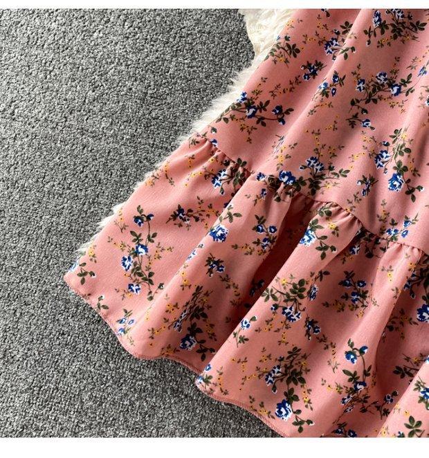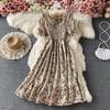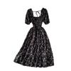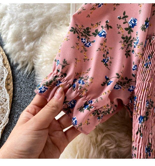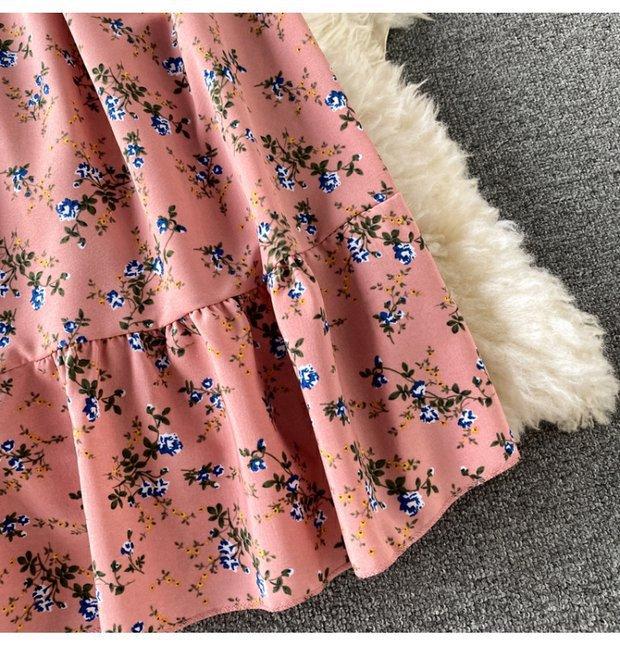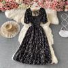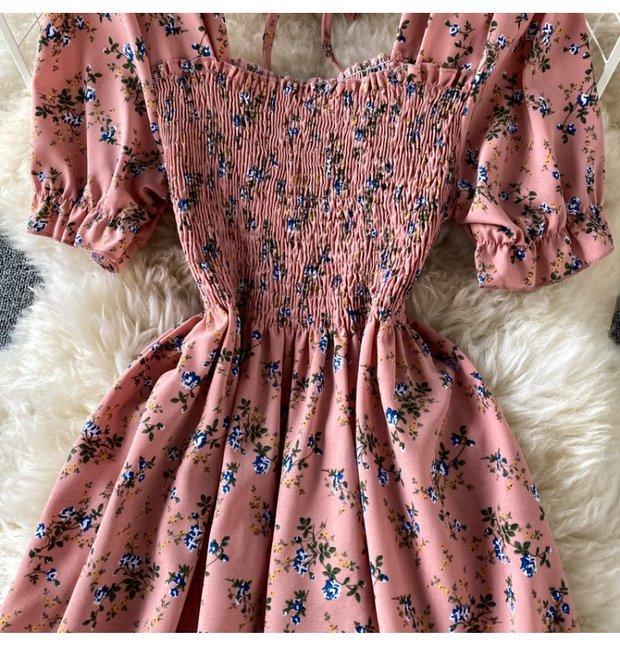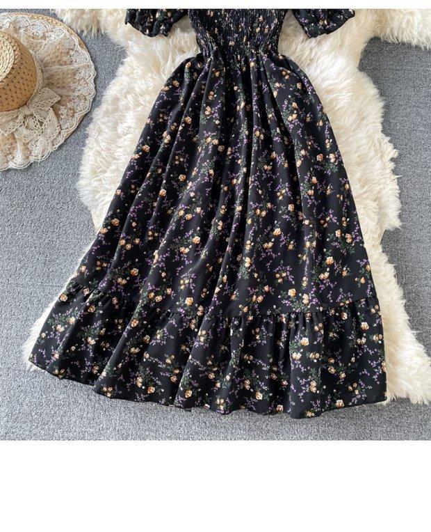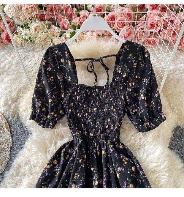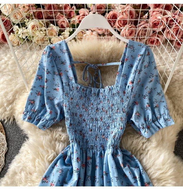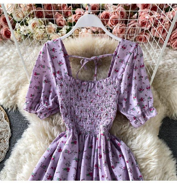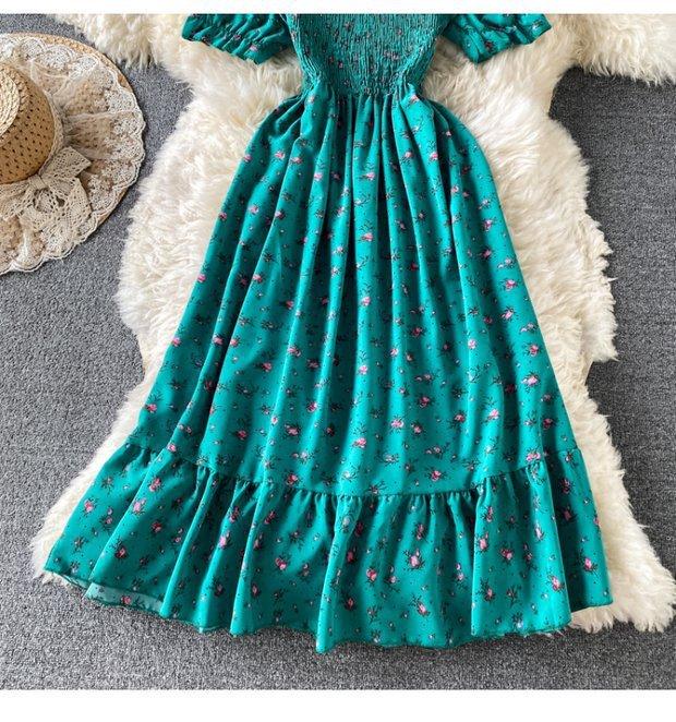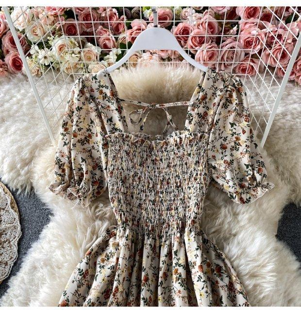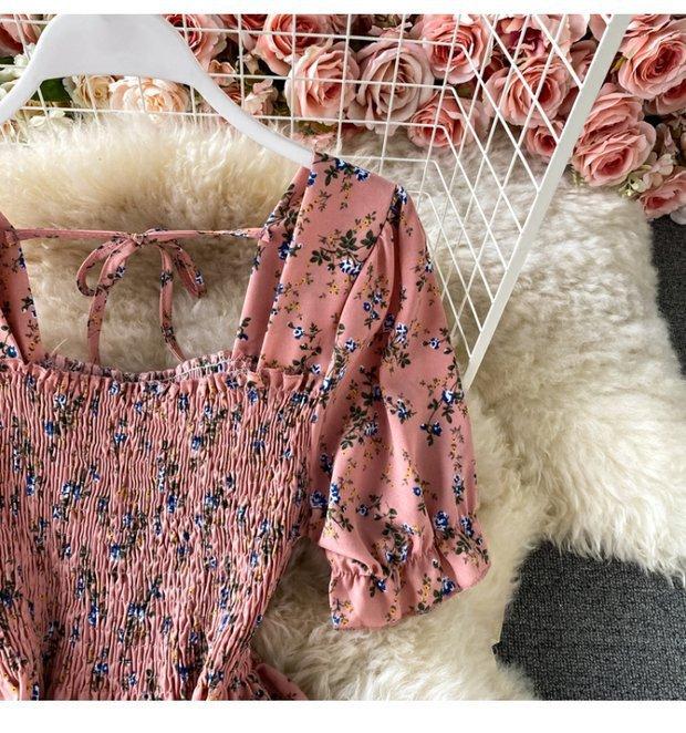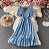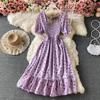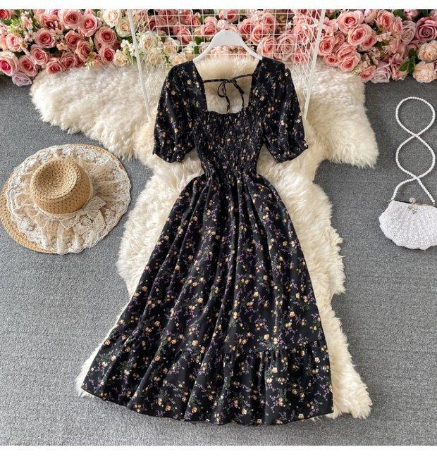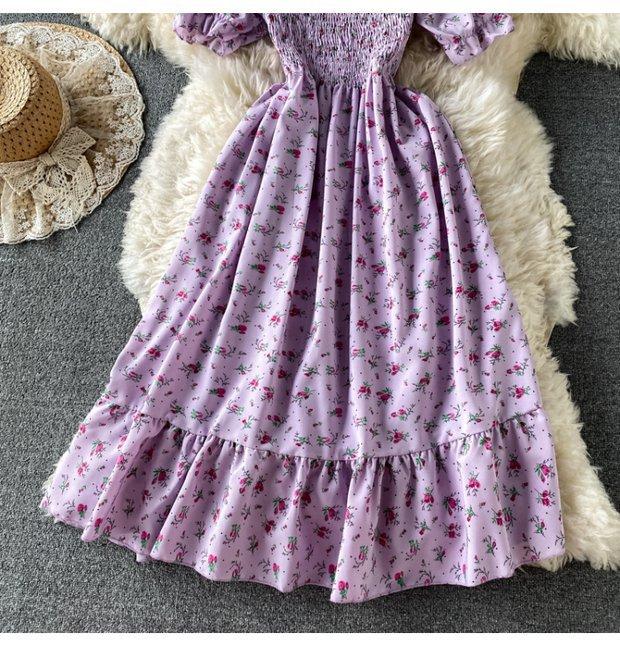 Vestido floral predicador para mujer, dulce vestido de hada con cuello cuadrado francés, plisado, largo medio, adelgazante y cintura alta.