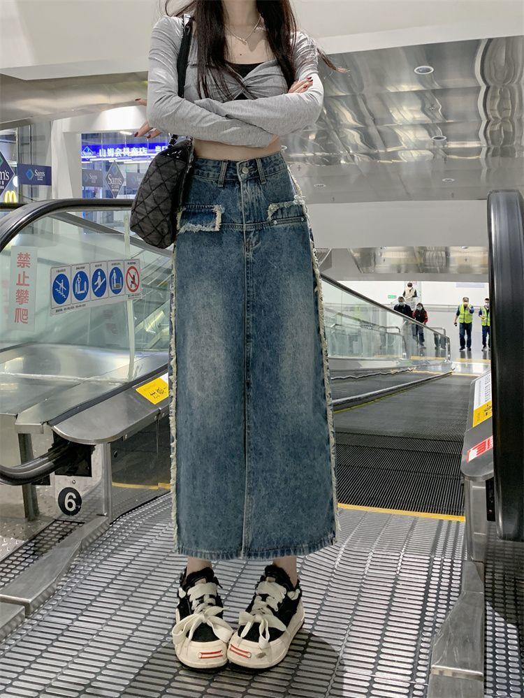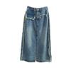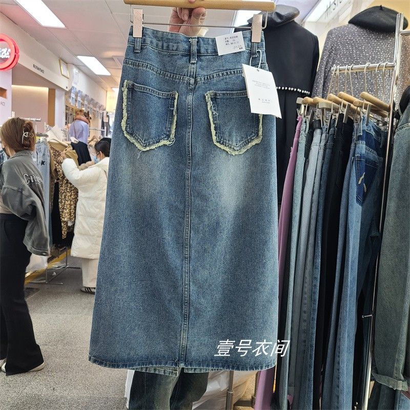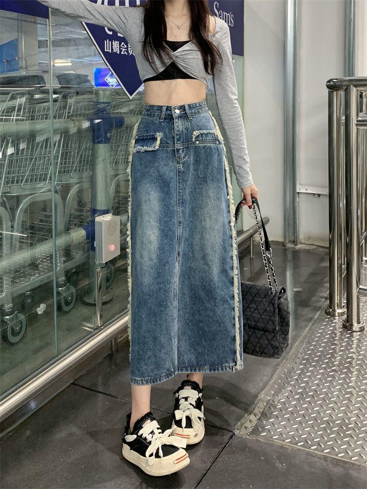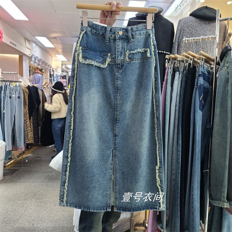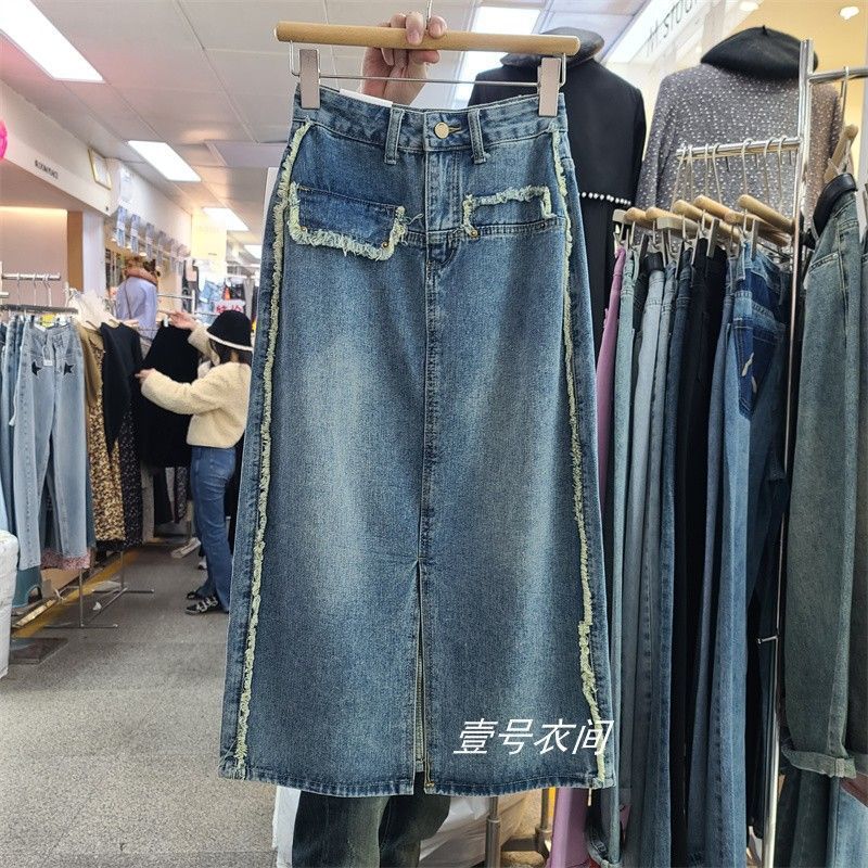 Falda de Mezclilla Retro de Cintura Alta con Abertura para Mujer 2025 Primavera Nuevo Diseño Empalme Orilla Cruda A-Línea Falda de Cadera