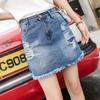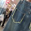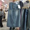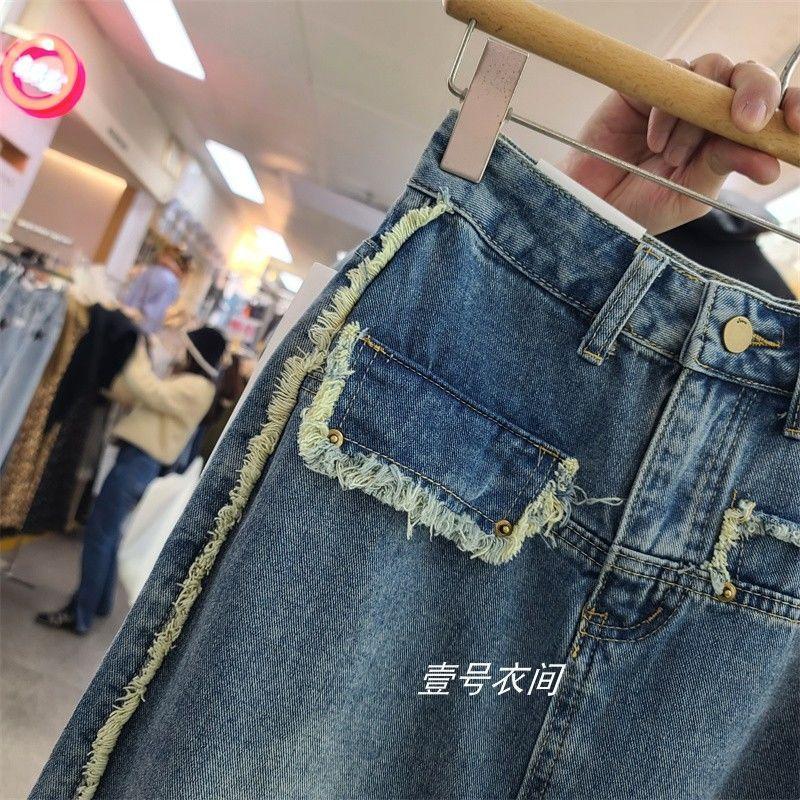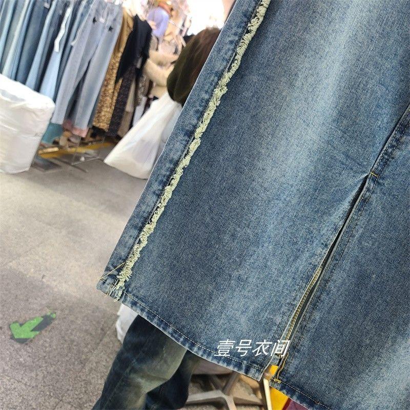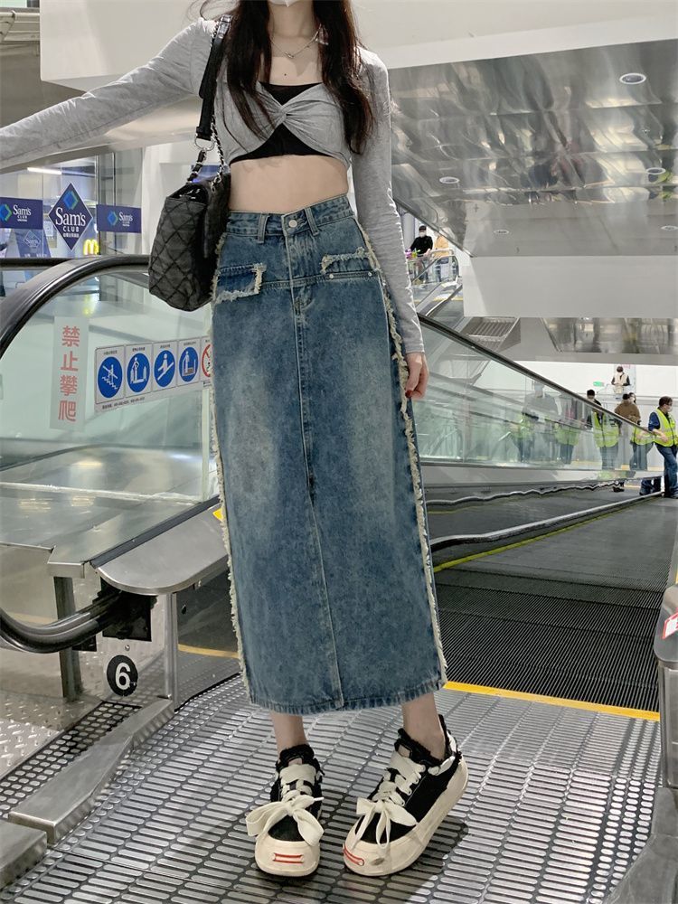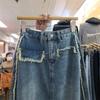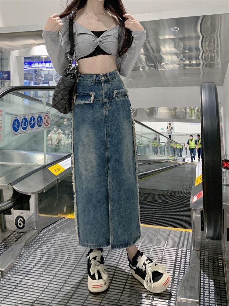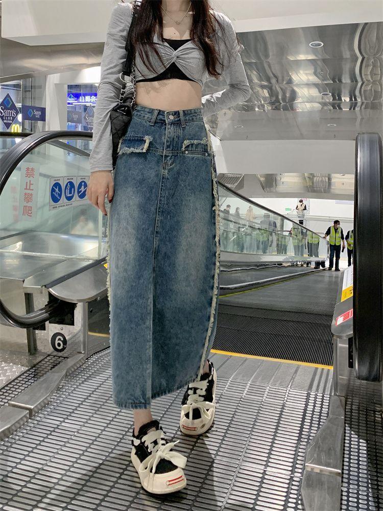 Falda de Mezclilla Retro de Cintura Alta con Abertura para Mujer 2025 Primavera Nuevo Diseño Empalme Orilla Cruda A-Línea Falda de Cadera