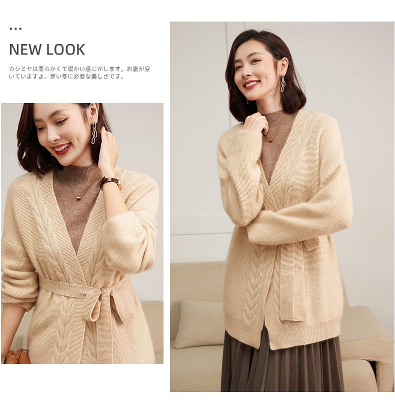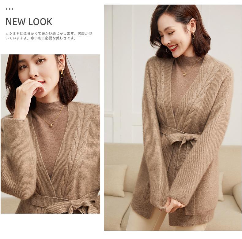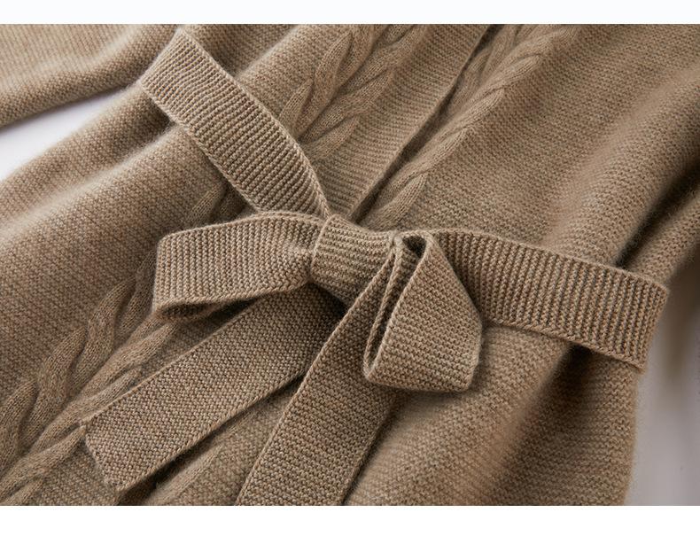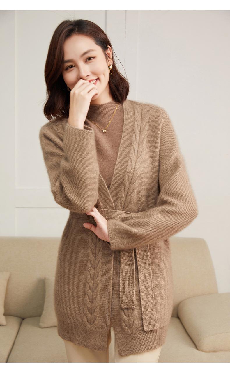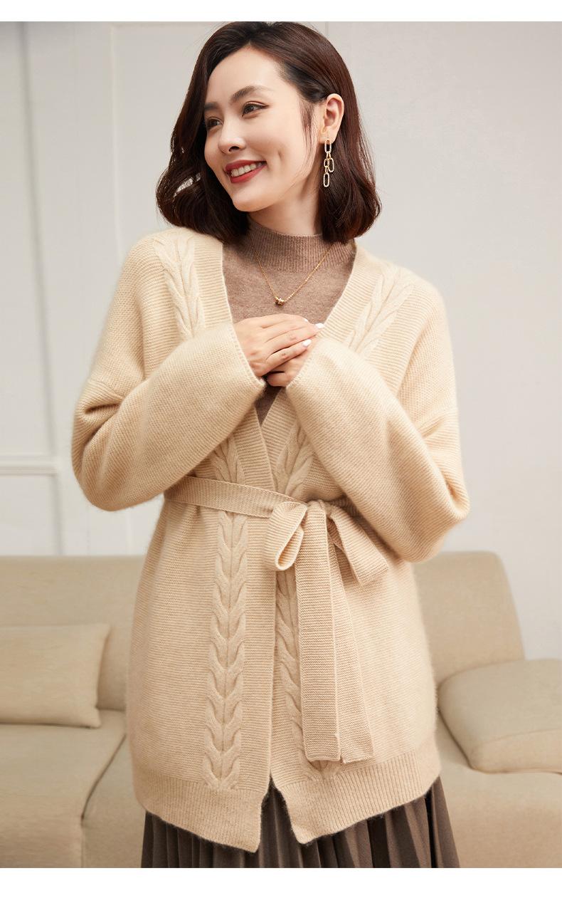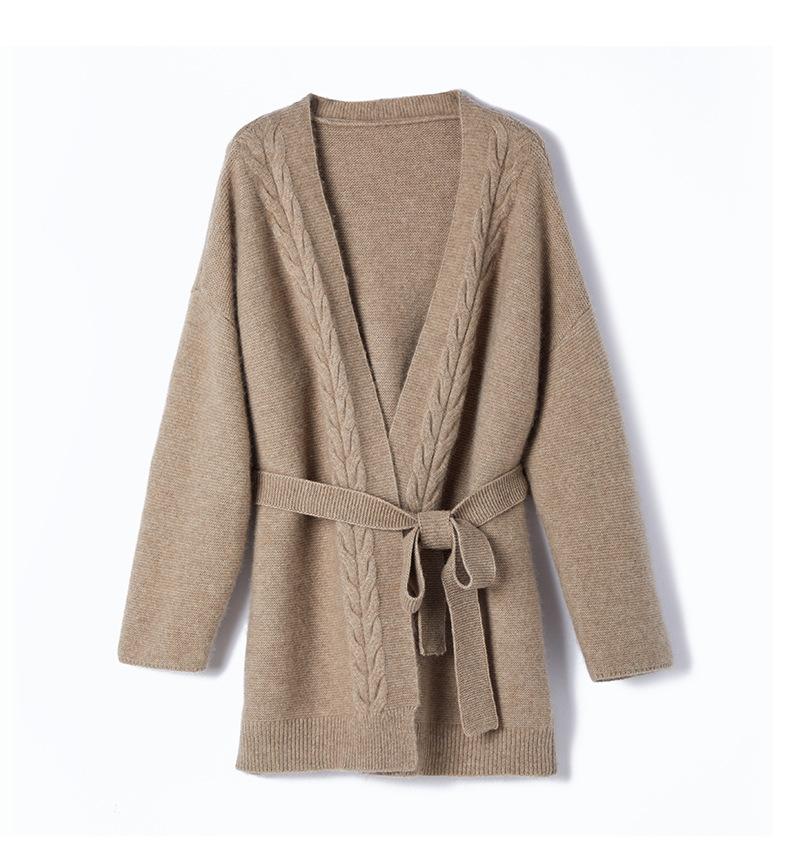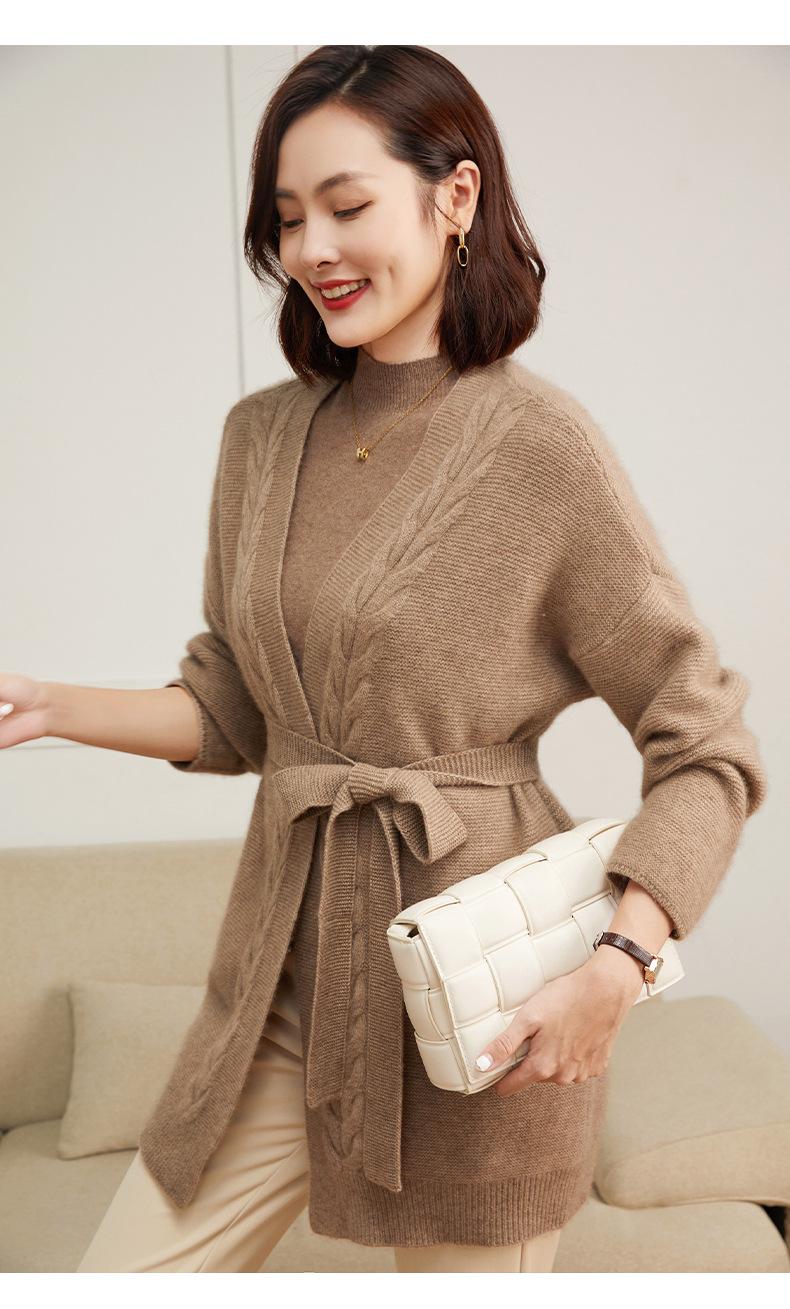 Cárdigan de Cachemira Nuevo de Otoño e Invierno con Temperamento para Mujer, Cárdigan Suelto de Largo Medio, Silueta Holgada, Cinturón, Chaqueta Suéter de Punto