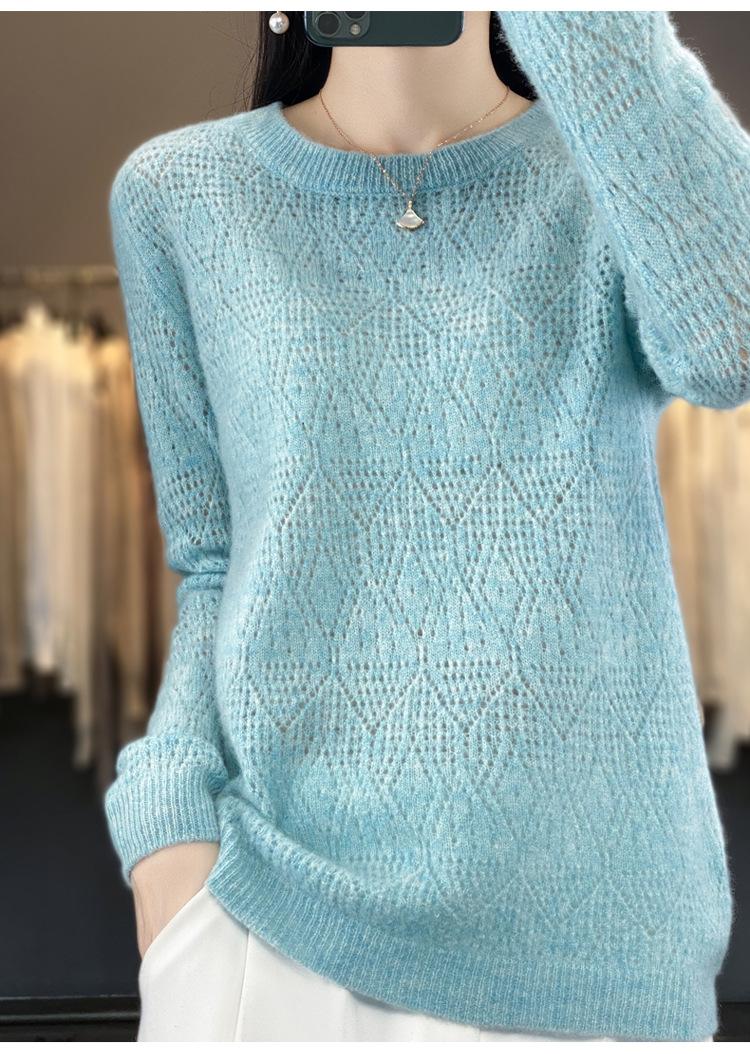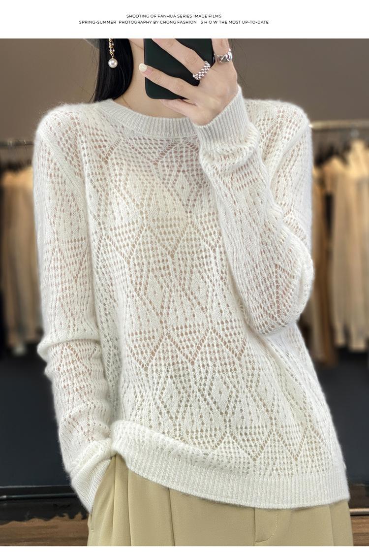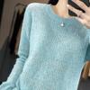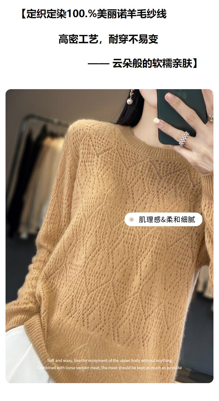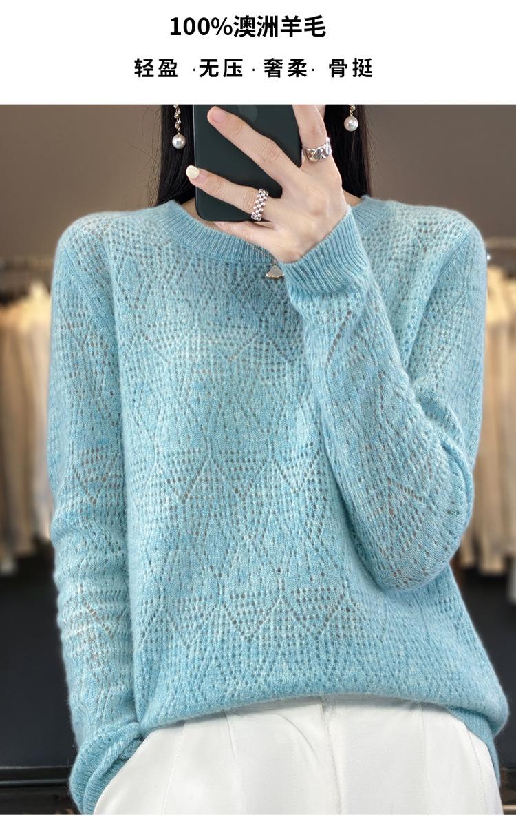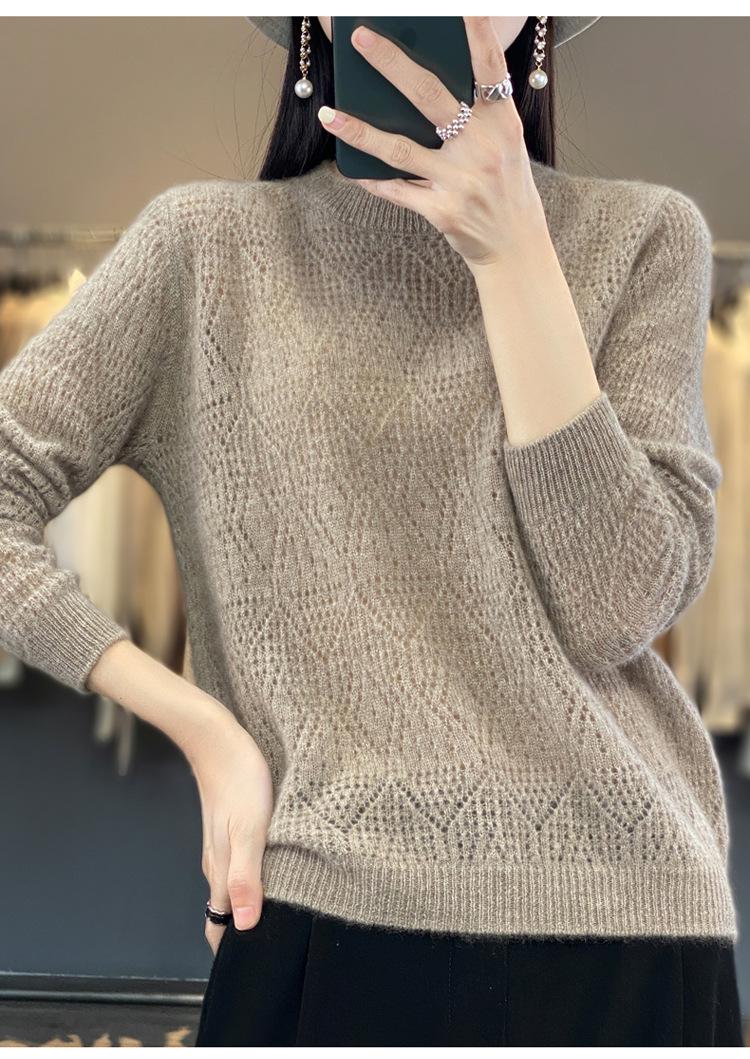Suéter de lana 100% pura para mujer, suéter fino de cuello redondo, camisa de manga larga, top de punto hueco, novedad de primavera