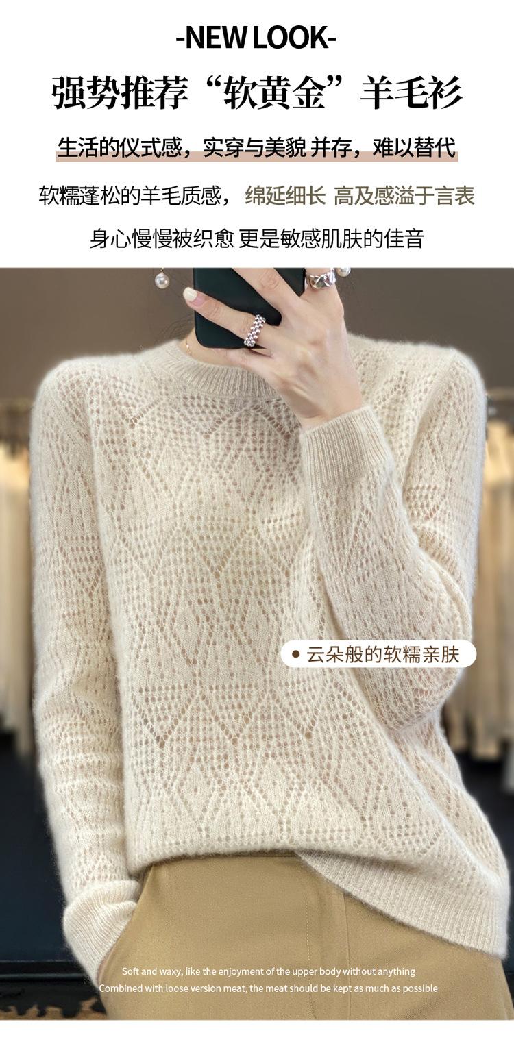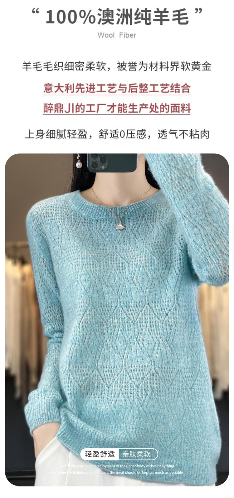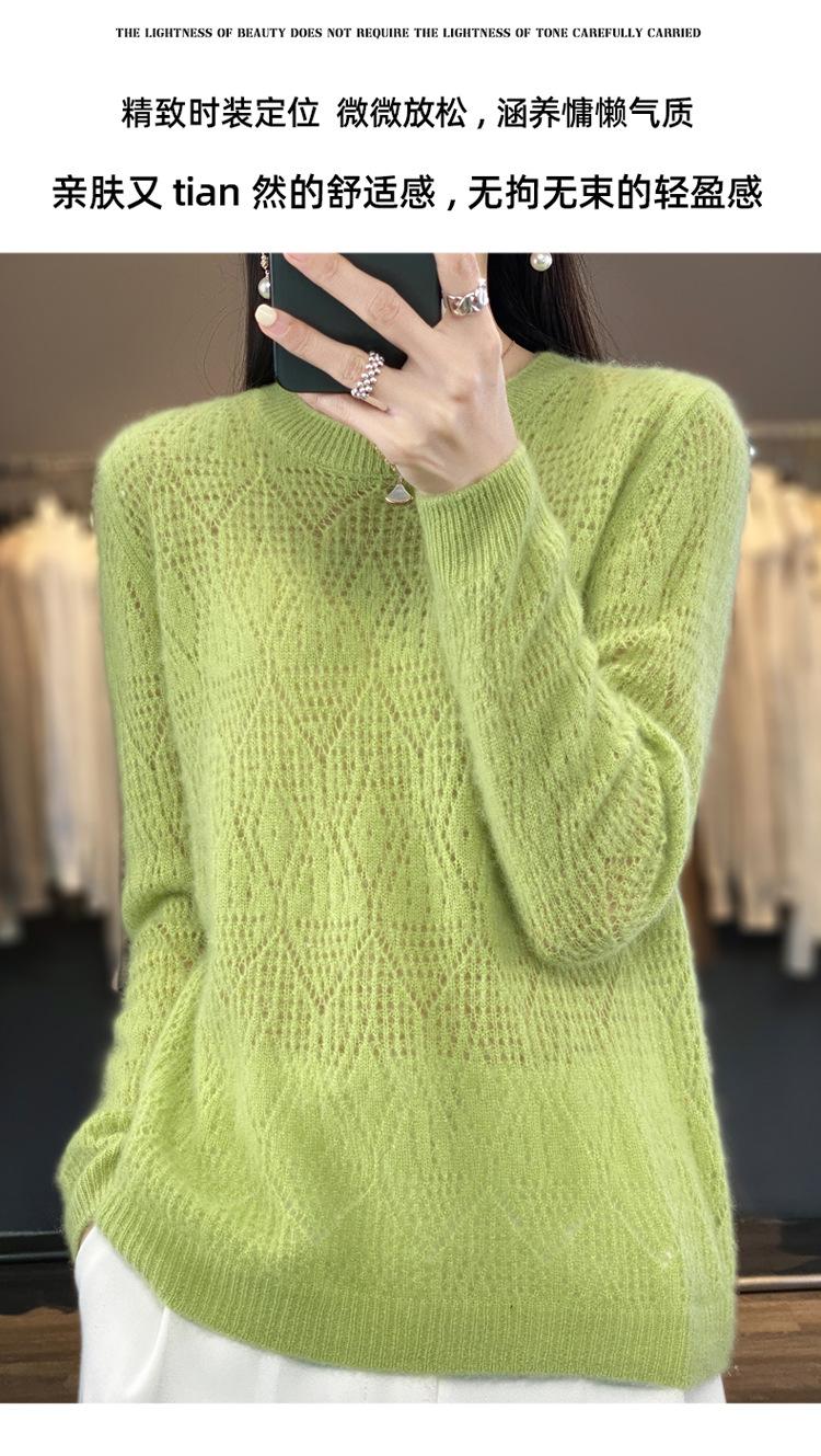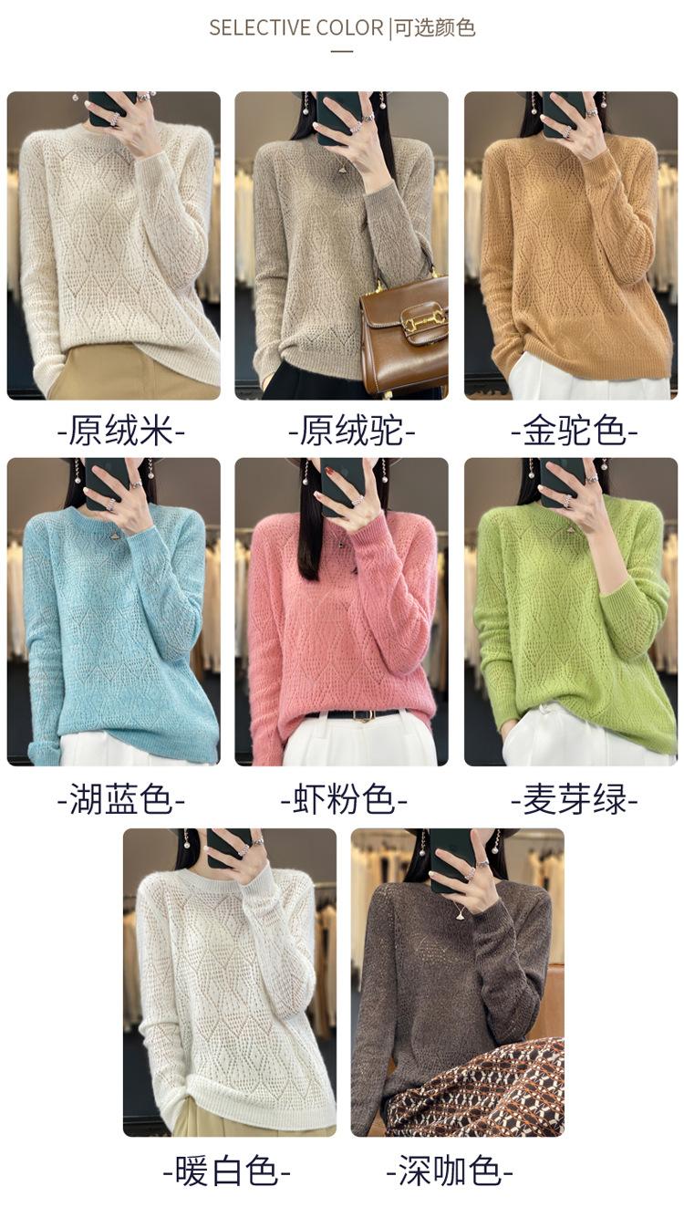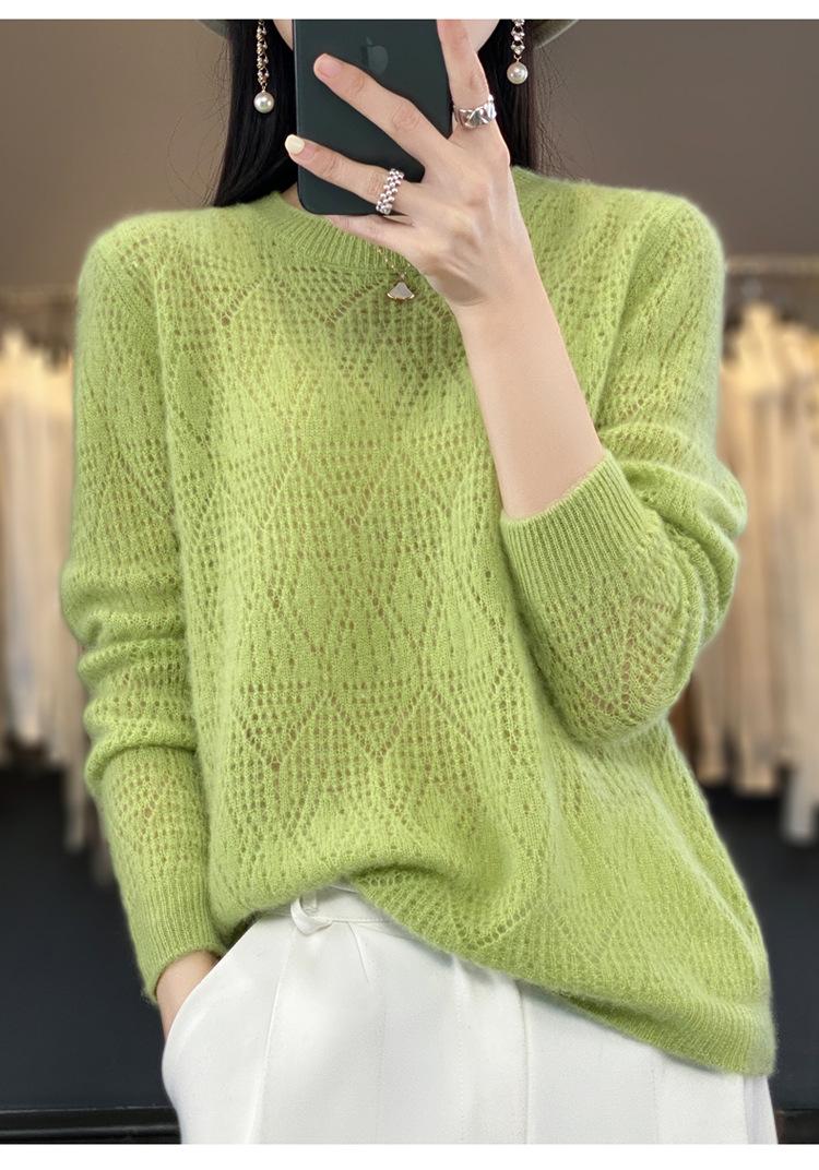 Suéter de lana 100% pura para mujer, suéter fino de cuello redondo, camisa de manga larga, top de punto hueco, novedad de primavera