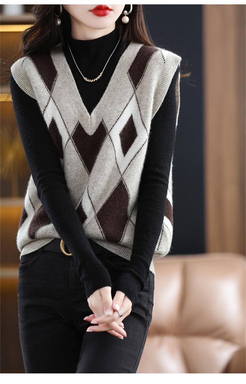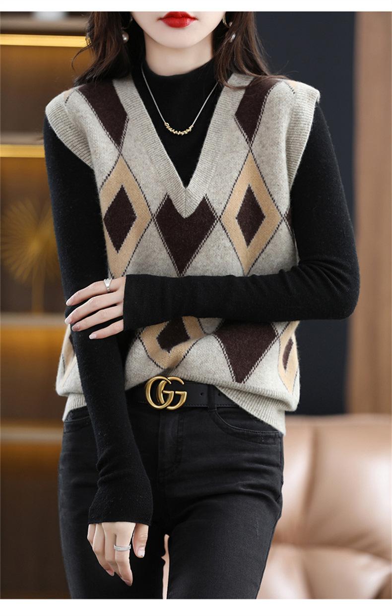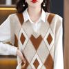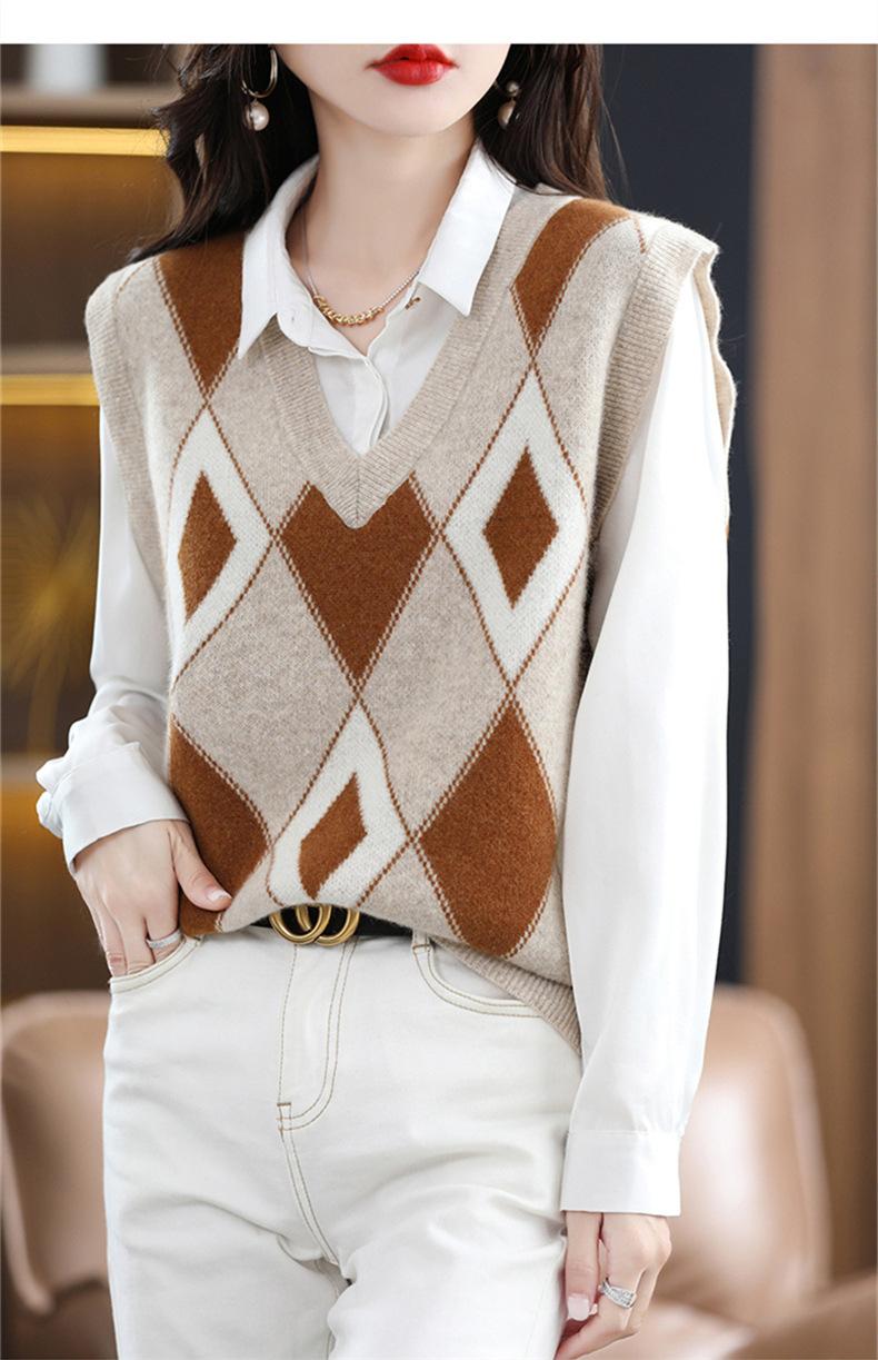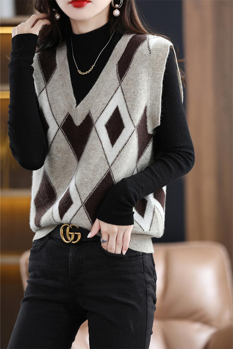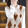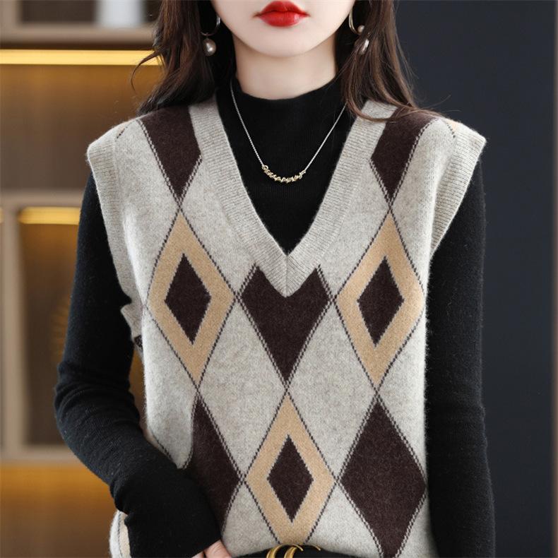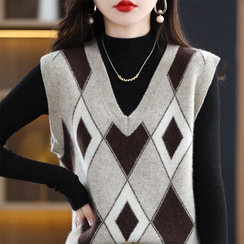 Chaleco Diamante 2025 para Mujer Tejido Otoño e Invierno Ropa Exterior Diseño Nicho Apilado Chaleco Retro Cuello en V Suéter