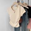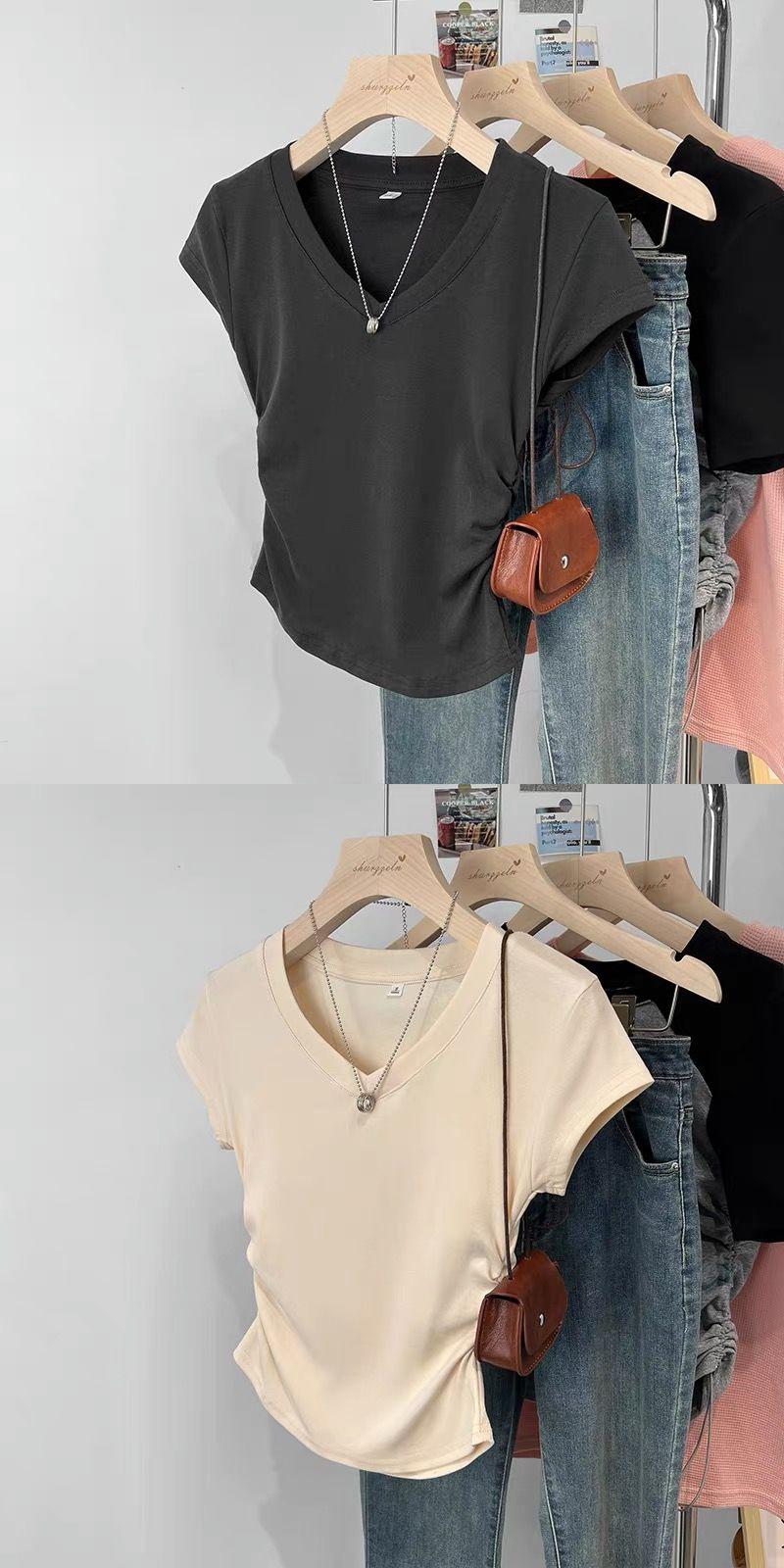 apricot [pleated V-neck short sleeve] [high elasticity]]