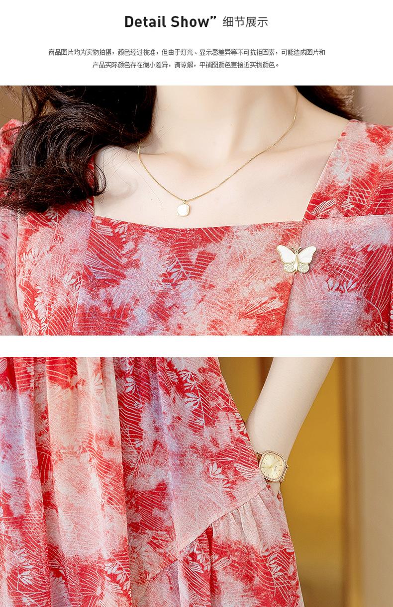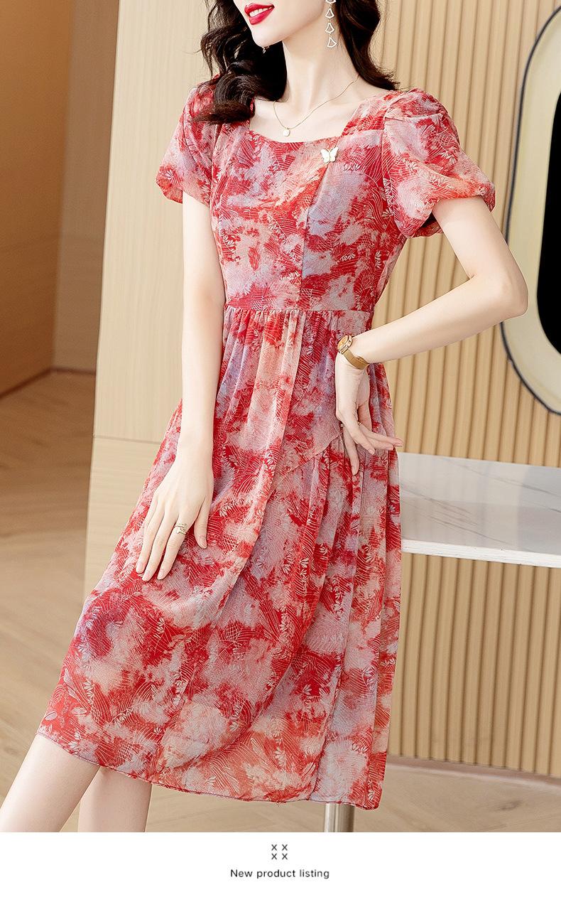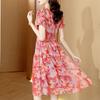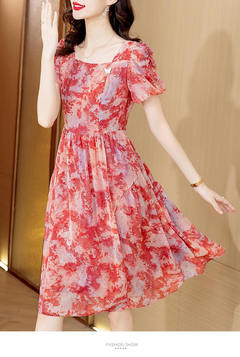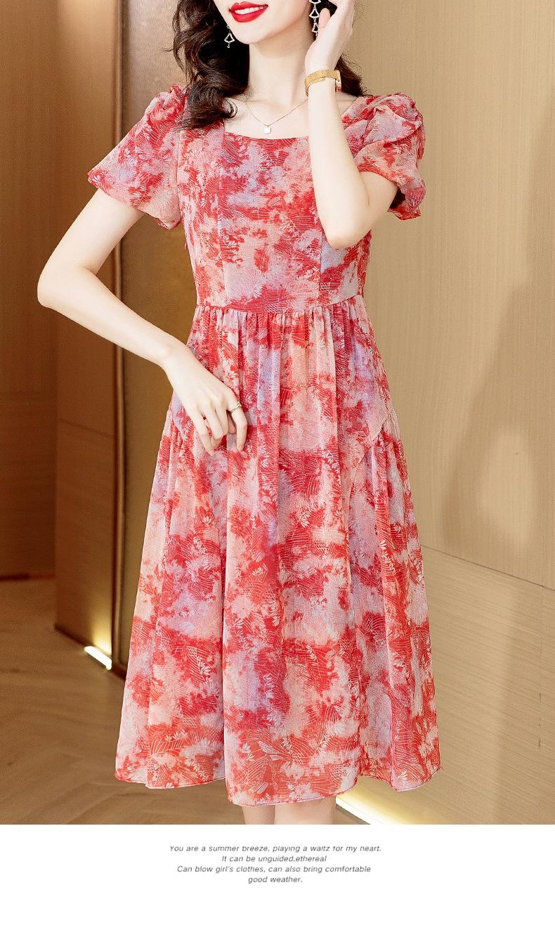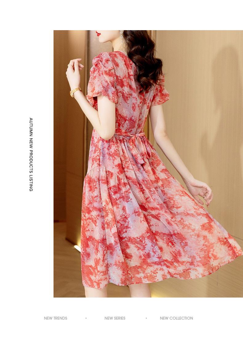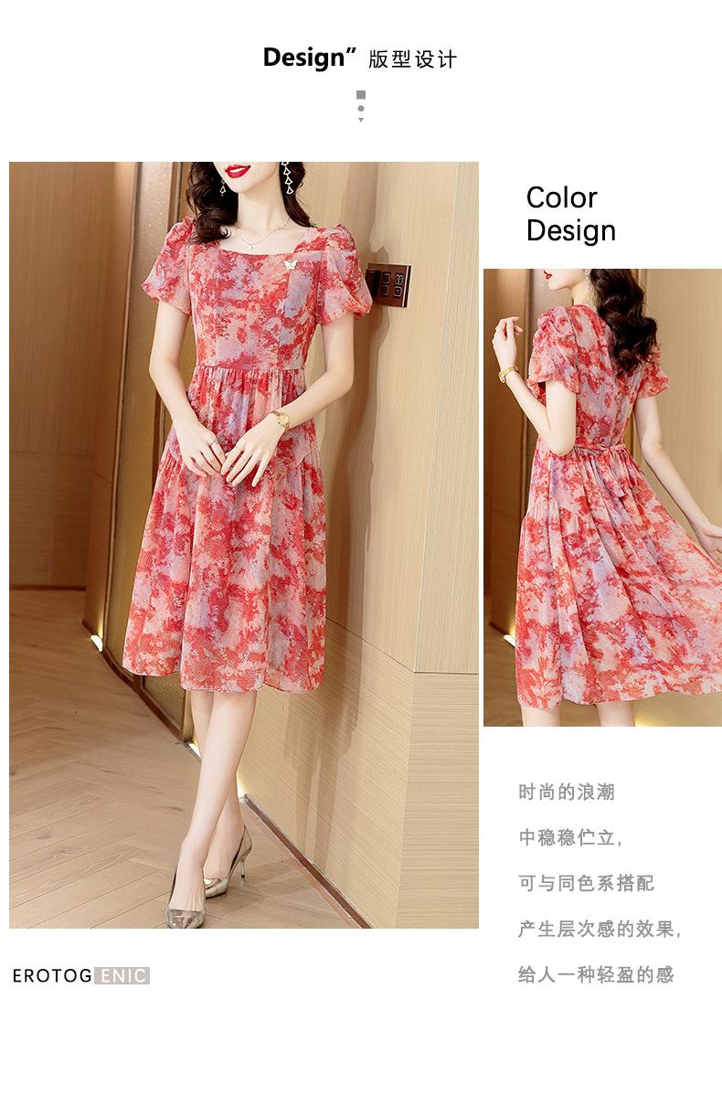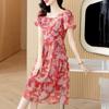 Vestido de gasa con estampado rojo para mujer, novedad de verano 2023, sencillo, a la moda, con cordones en la cintura, cuello cuadrado, largo medio.
