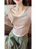 Camiseta de manga larga rosa con costuras entalladas para mujer, de primavera y otoño, de dos piezas falsas con contraste de color, con escote pronunciado, estilo occidental, camiseta interior antiedad