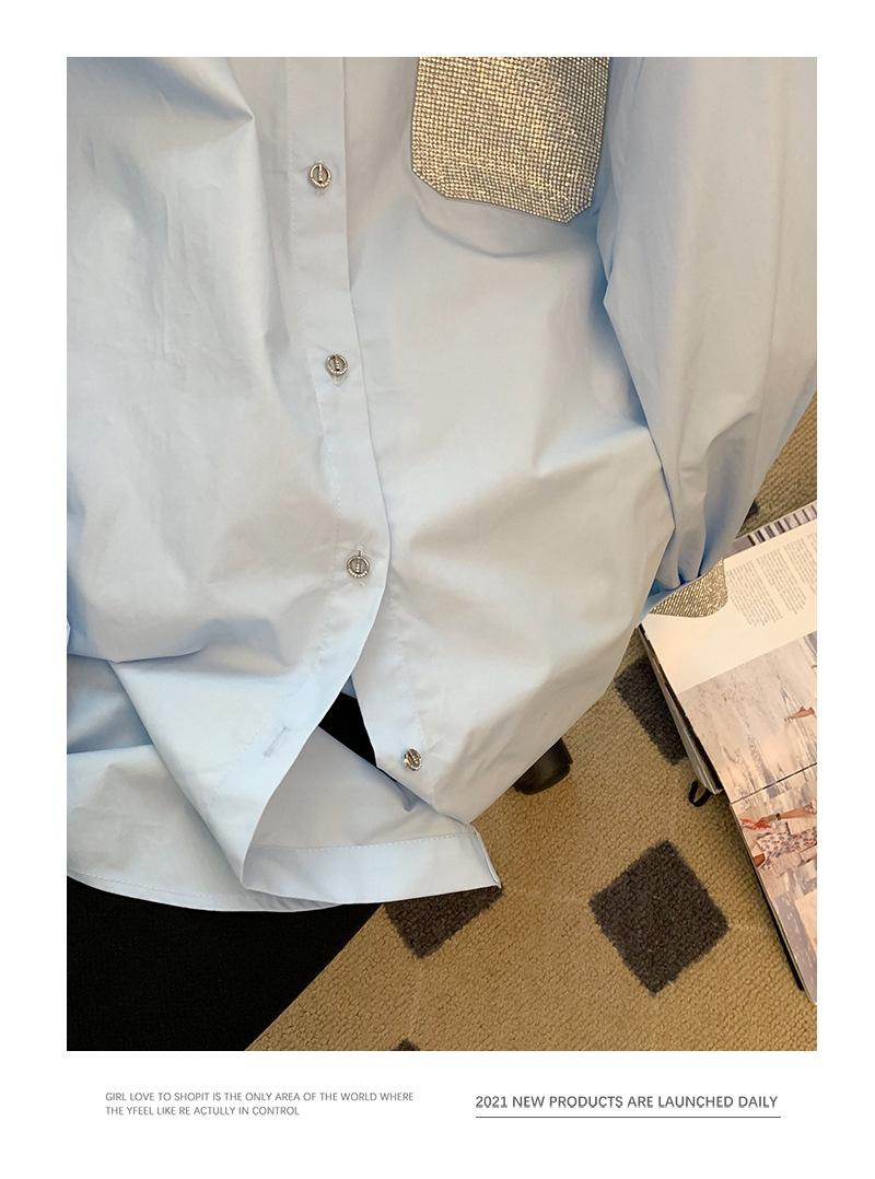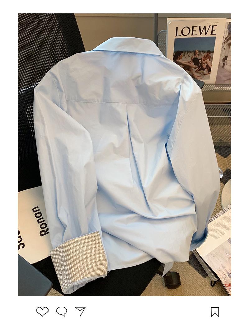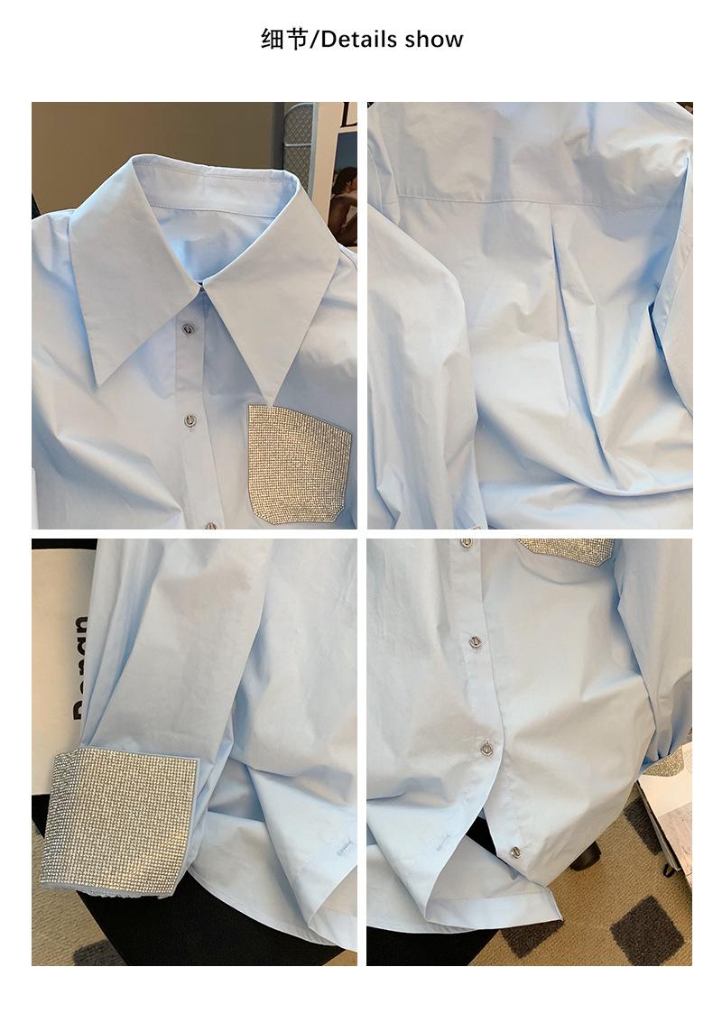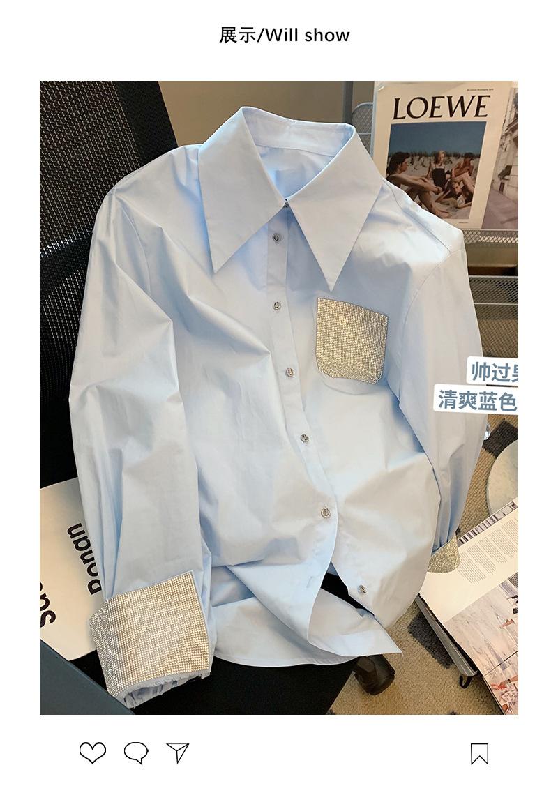 Camisa azul de empalme con diamantes de imitación de manga larga para mujer, primavera 2023, nueva moda, temperamento de alta gama, camisa mediana y larga, tendencia
