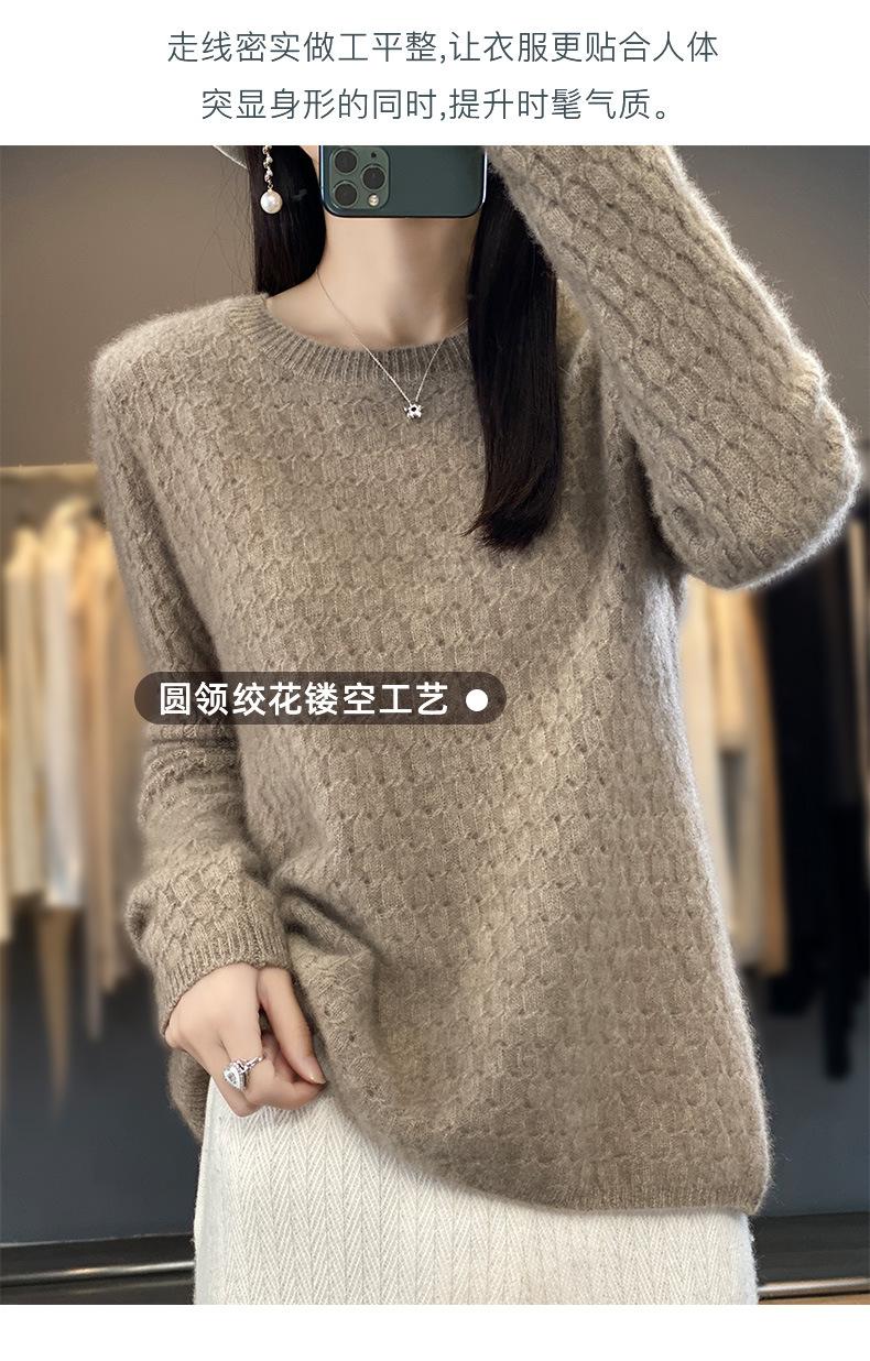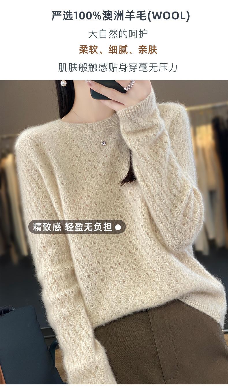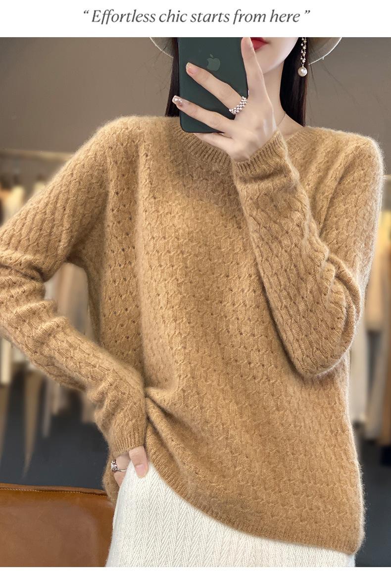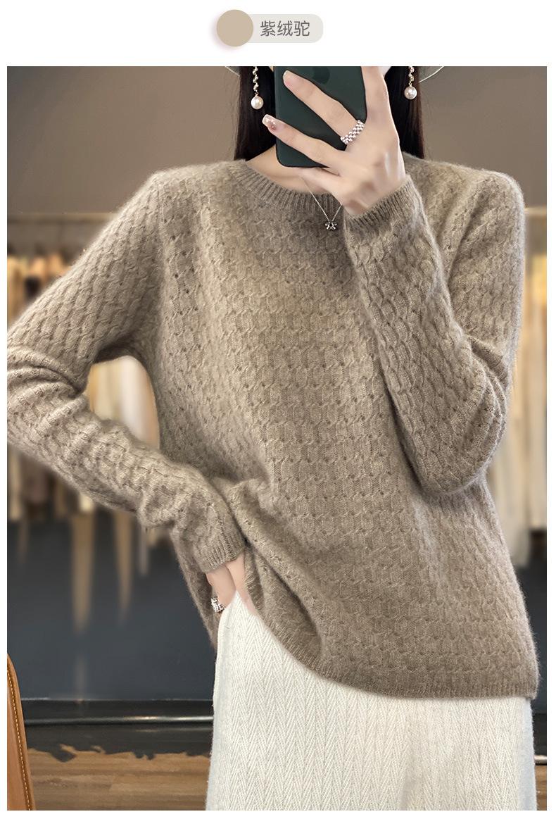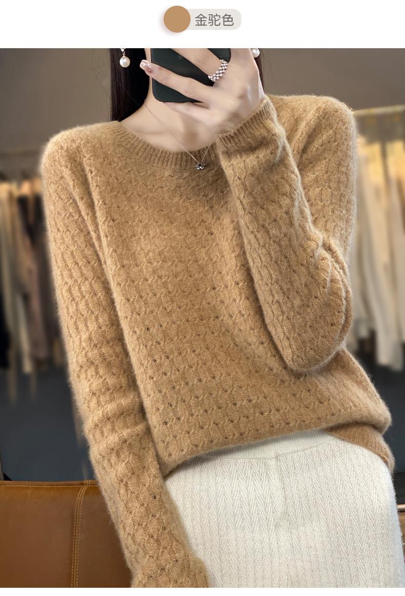 24 Nuevo Otoño 100% Lana Pura Cuello Redondo Suéter Calado para Mujer Suéter Holgado Estilo Occidental Tejido Camiseta Base