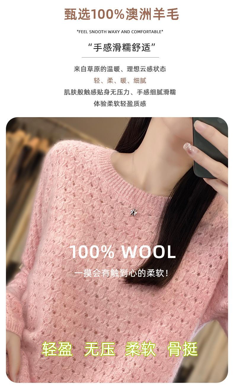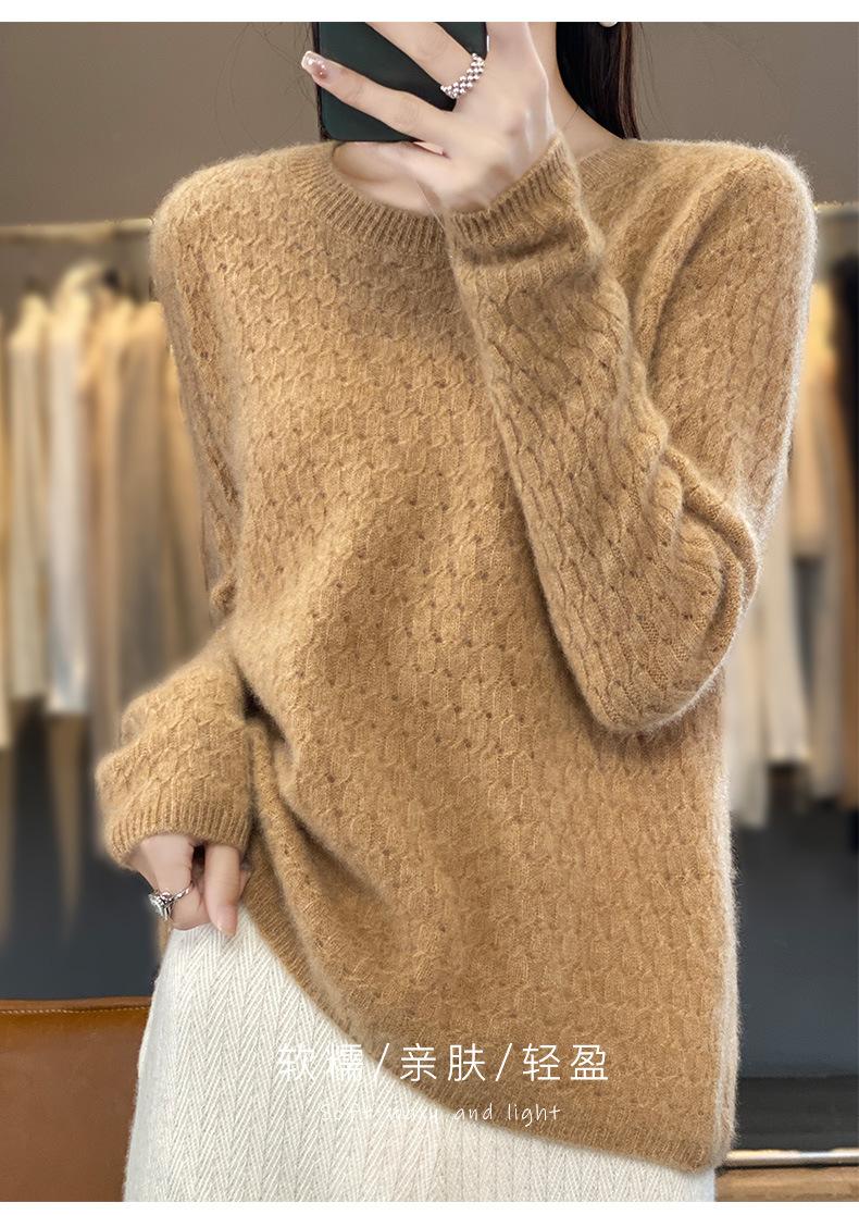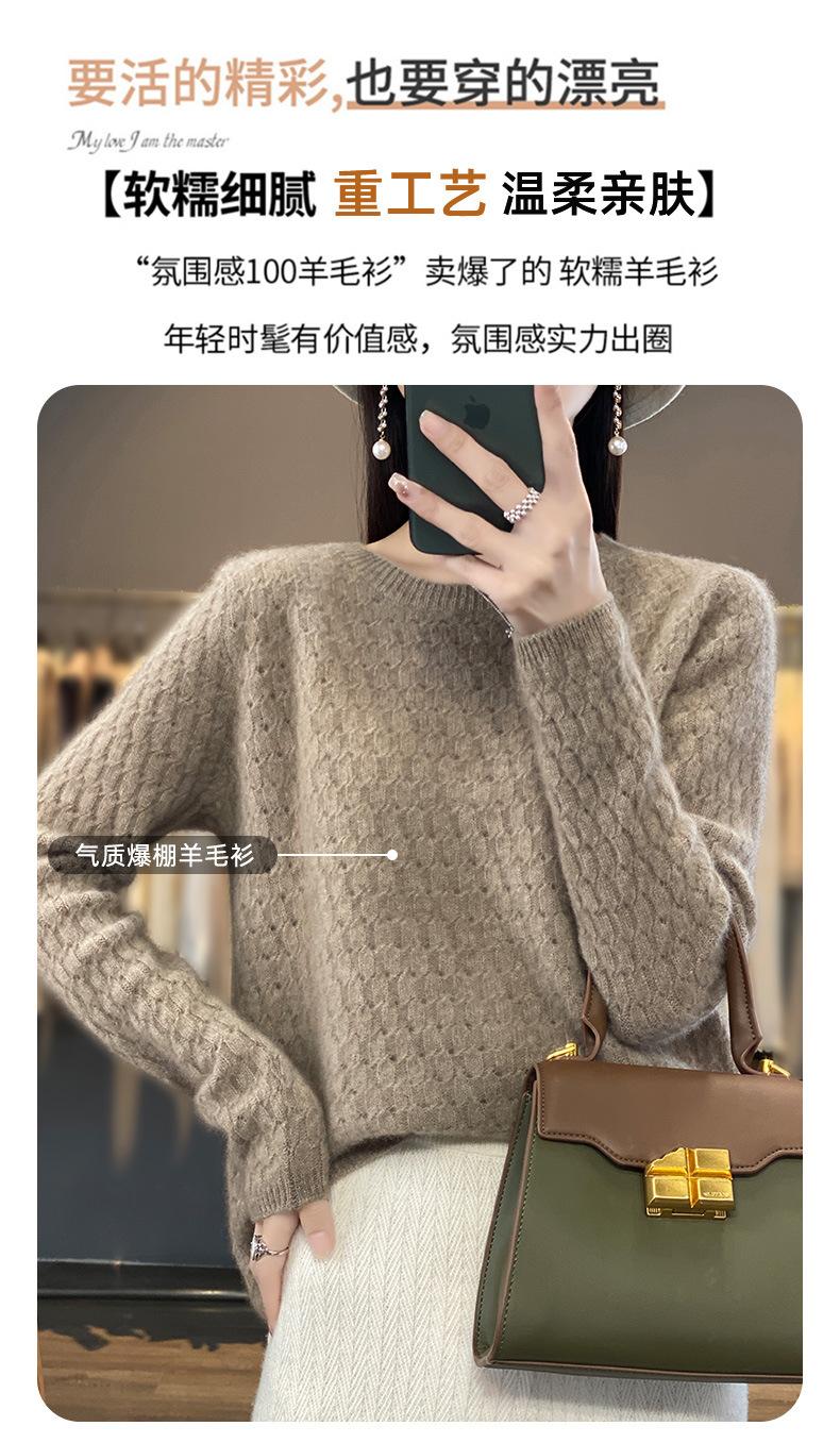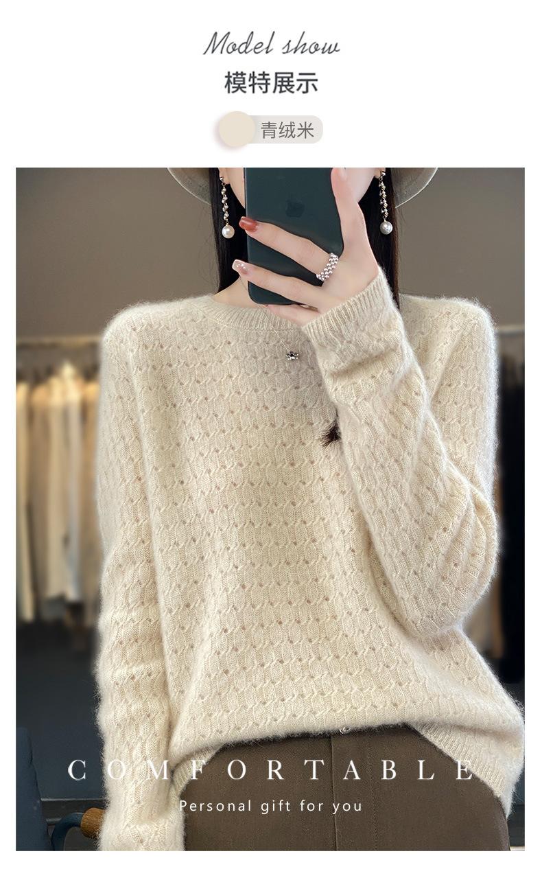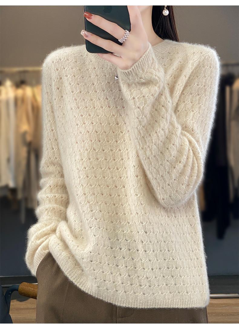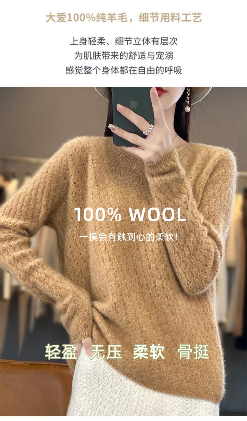 24 Nuevo Otoño 100% Lana Pura Cuello Redondo Suéter Calado para Mujer Suéter Holgado Estilo Occidental Tejido Camiseta Base