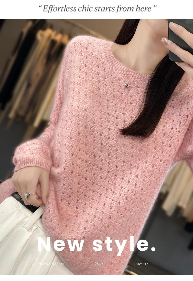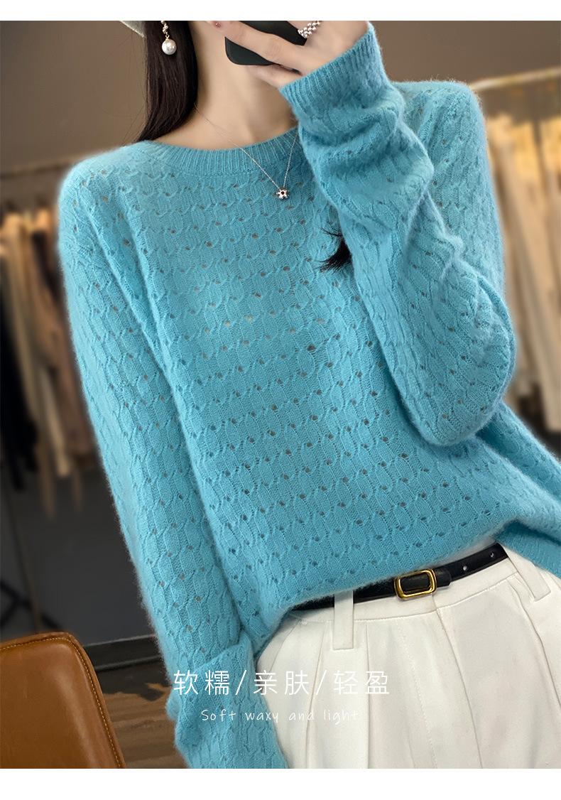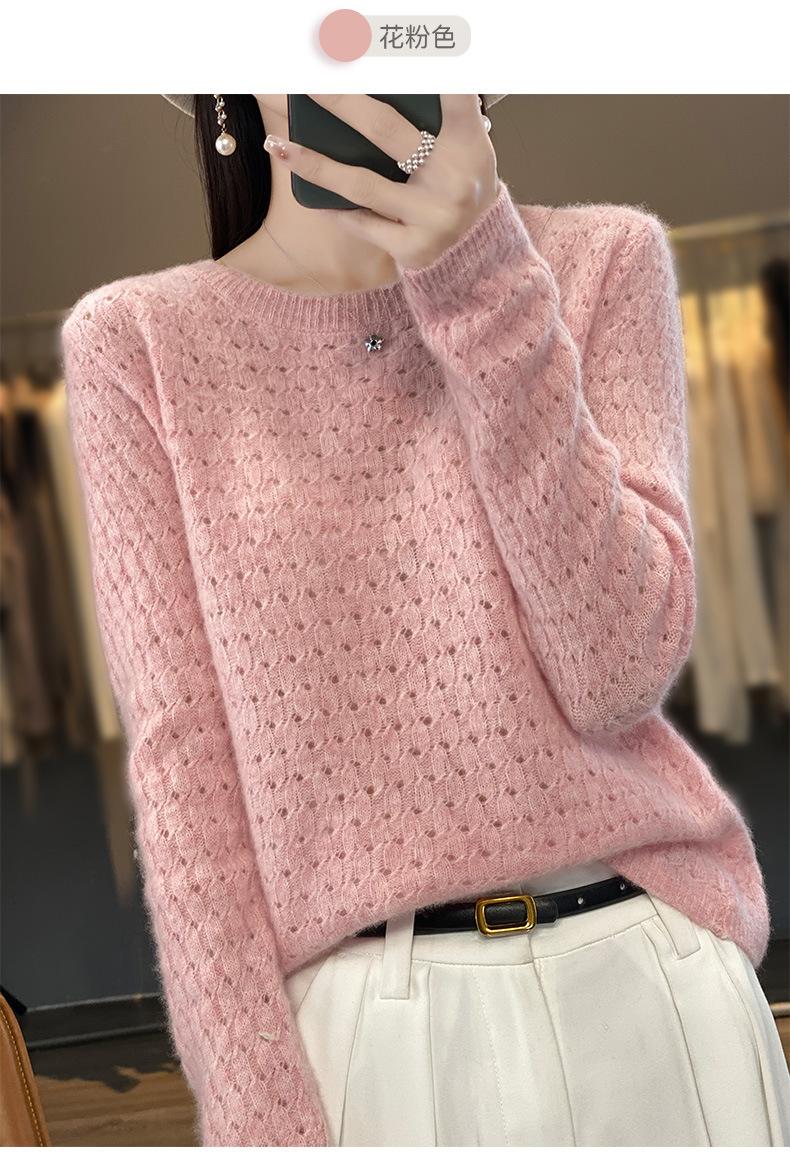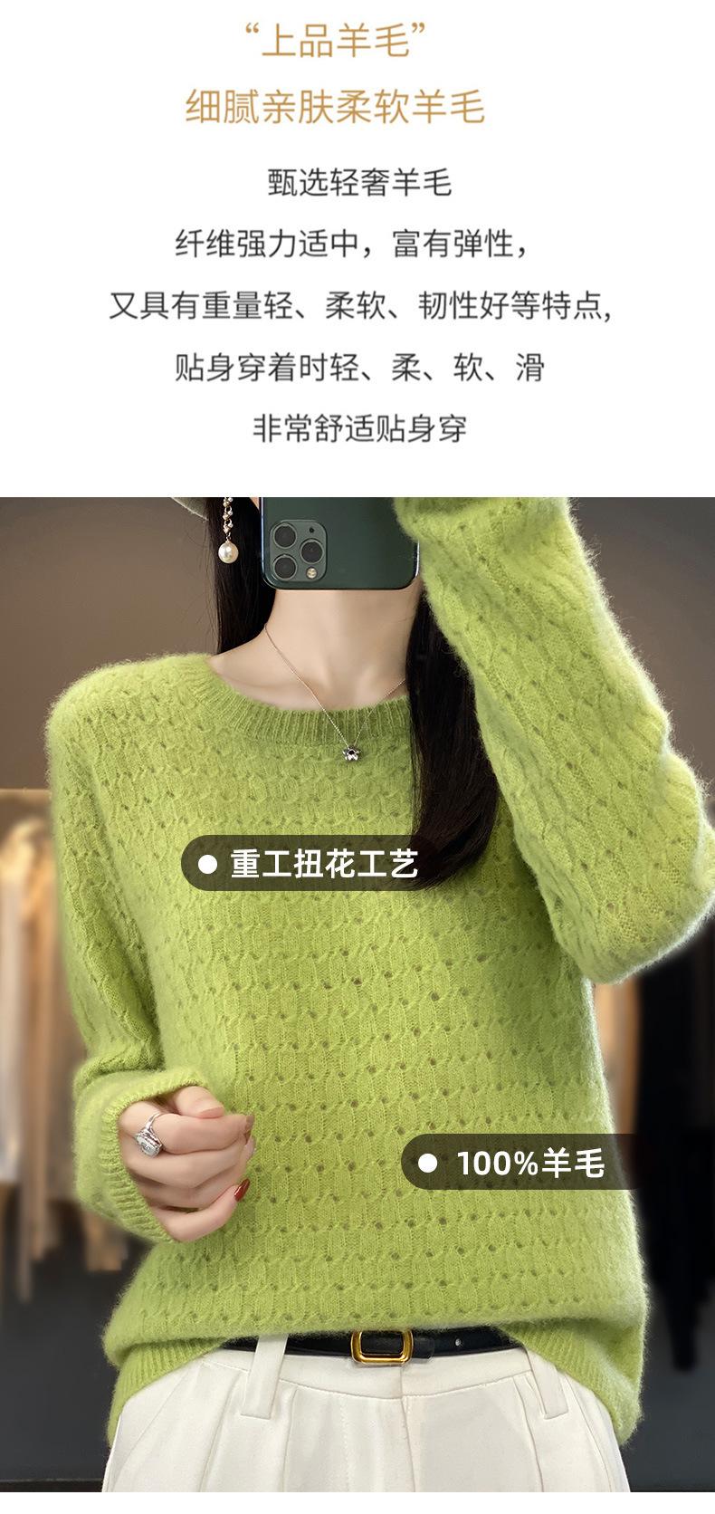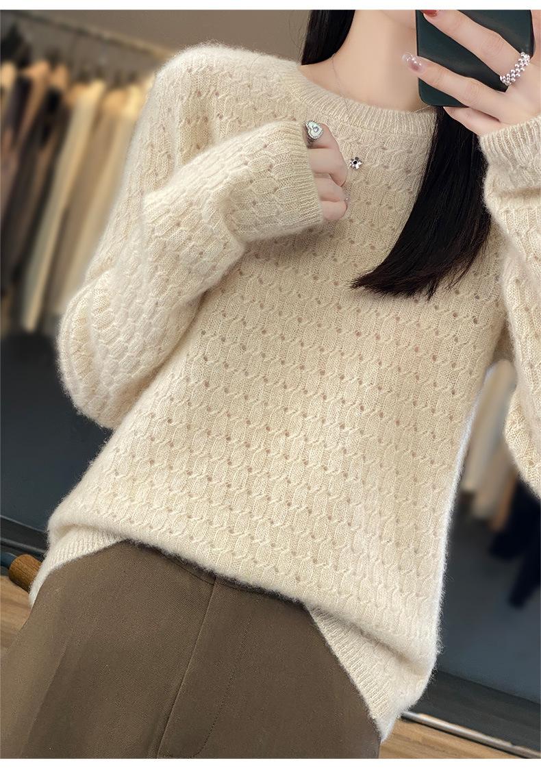 24 Nuevo Otoño 100% Lana Pura Cuello Redondo Suéter Calado para Mujer Suéter Holgado Estilo Occidental Tejido Camiseta Base