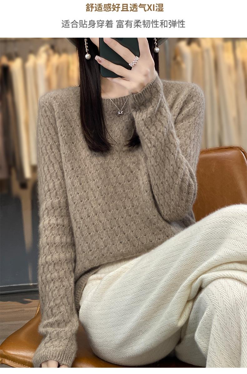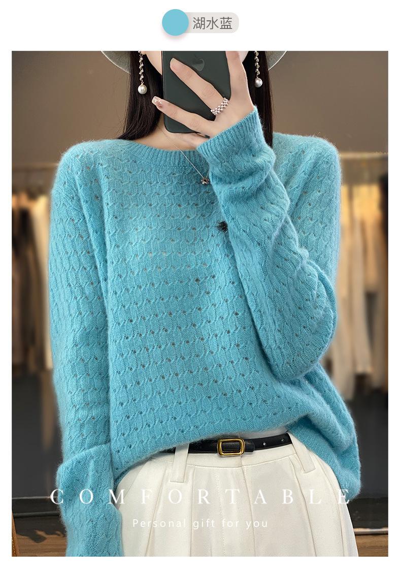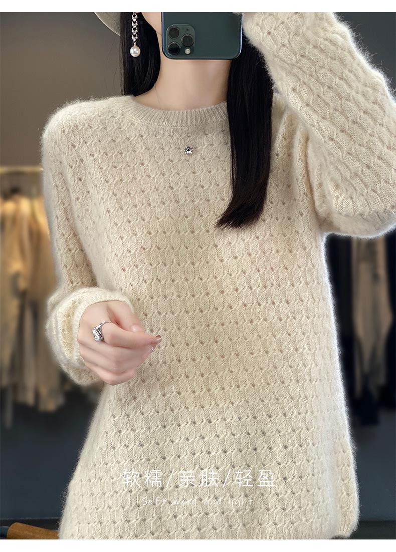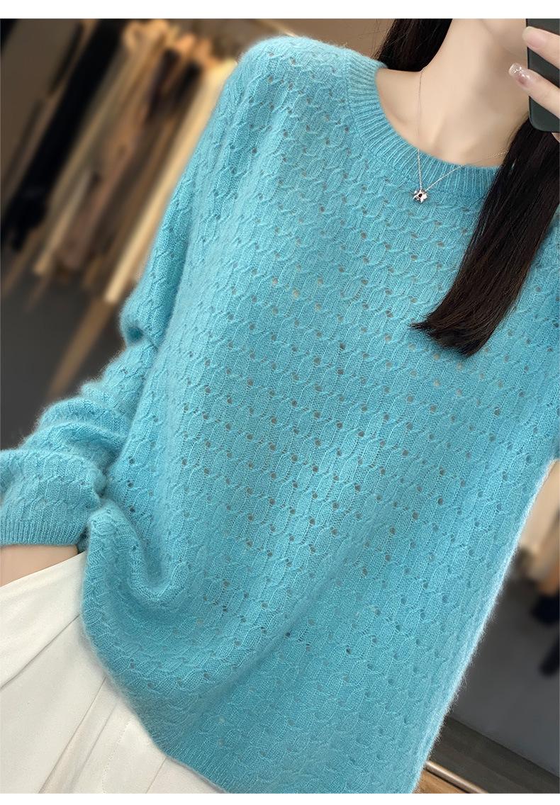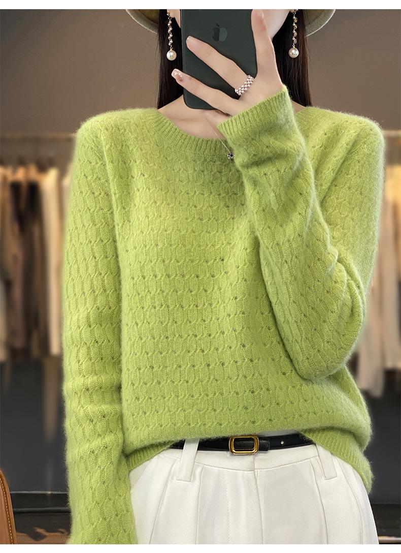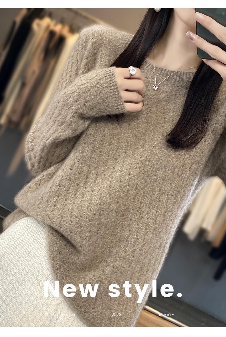 24 Nuevo Otoño 100% Lana Pura Cuello Redondo Suéter Calado para Mujer Suéter Holgado Estilo Occidental Tejido Camiseta Base