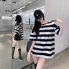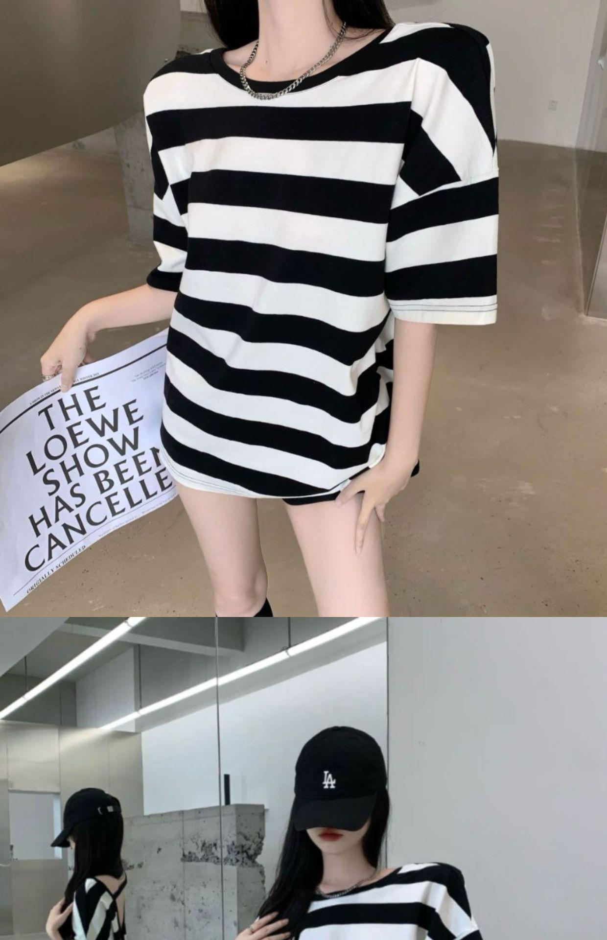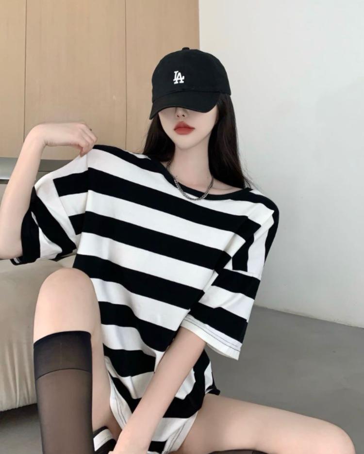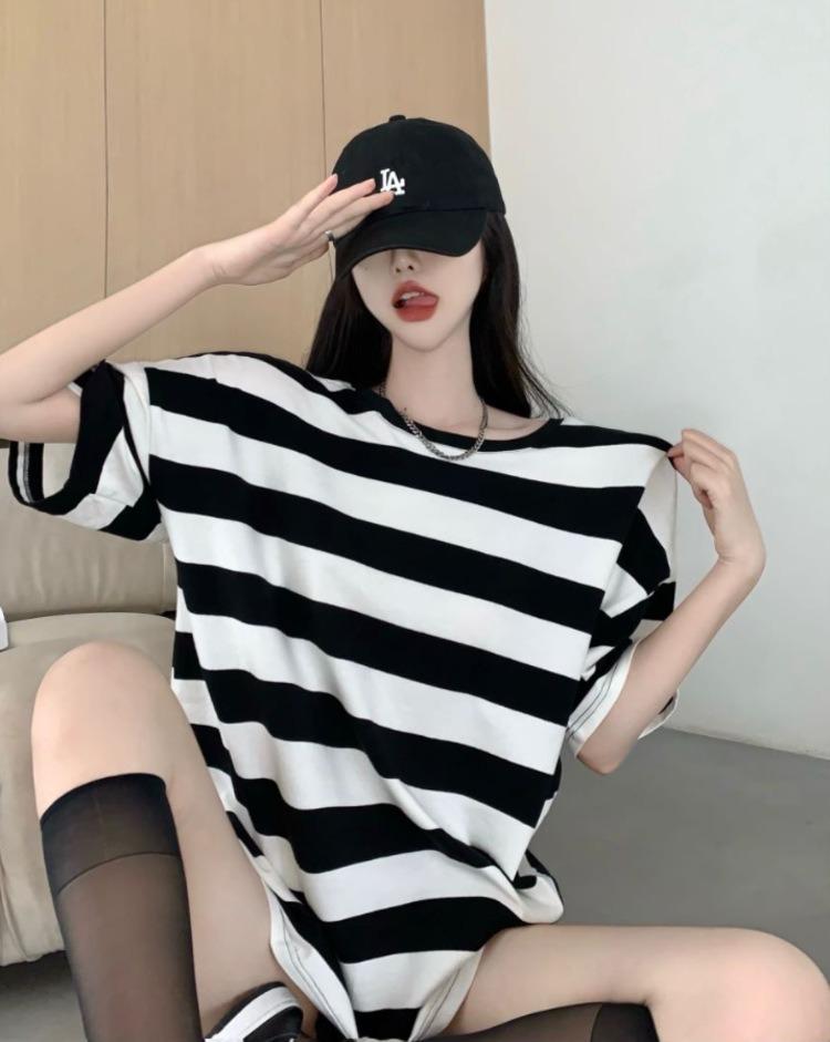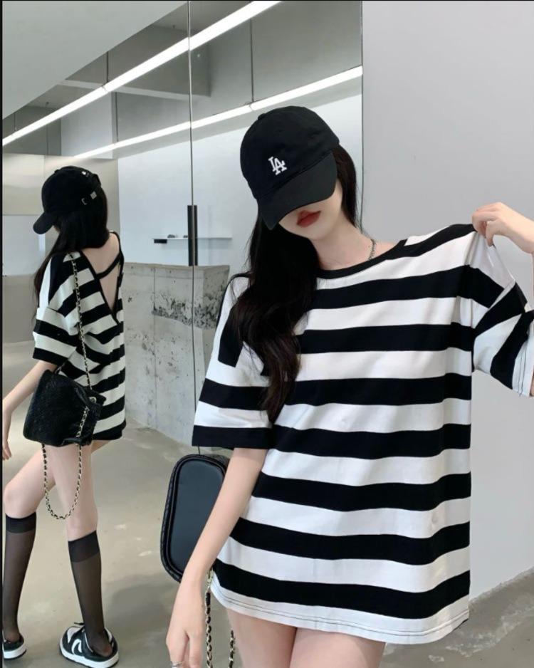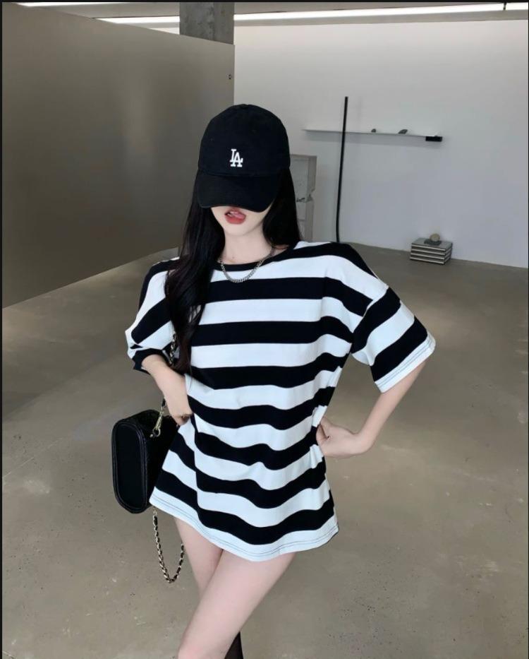 Camiseta holgada de manga corta a rayas de estilo perezoso para mujer, verano 2025, nueva ropa de nicho, de moda, transpirable y cómoda.