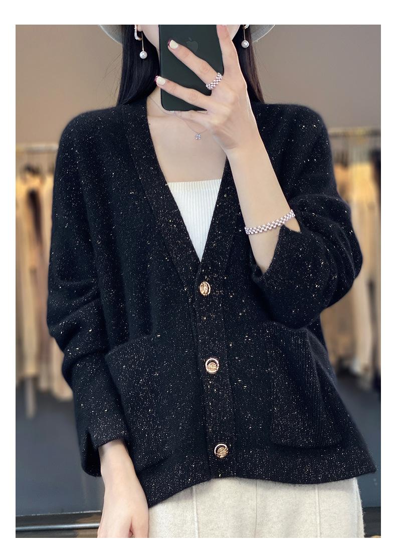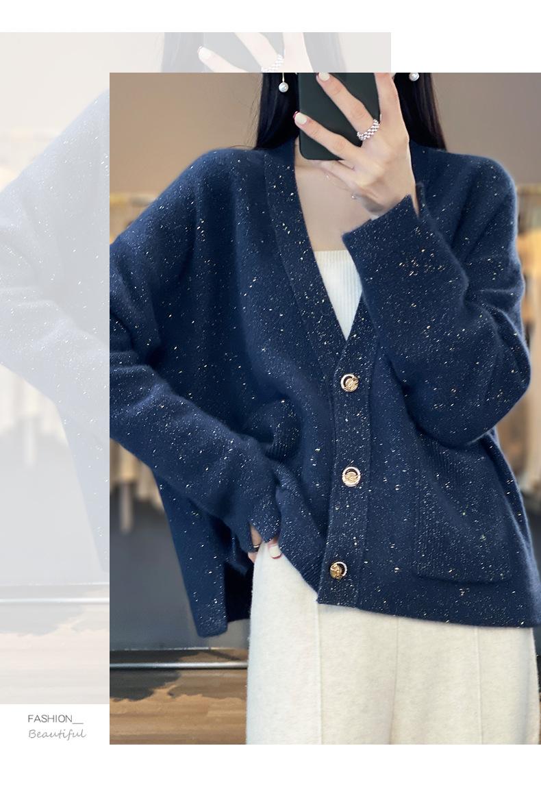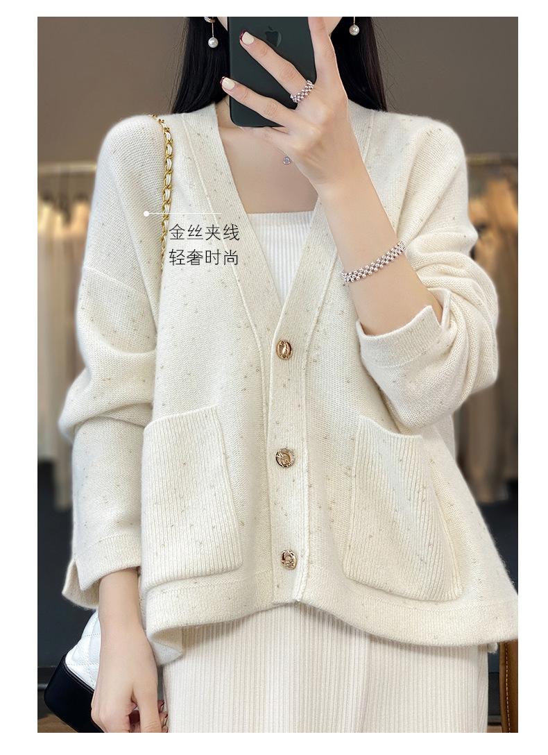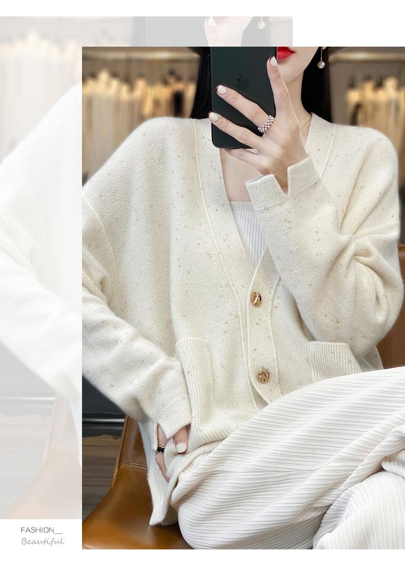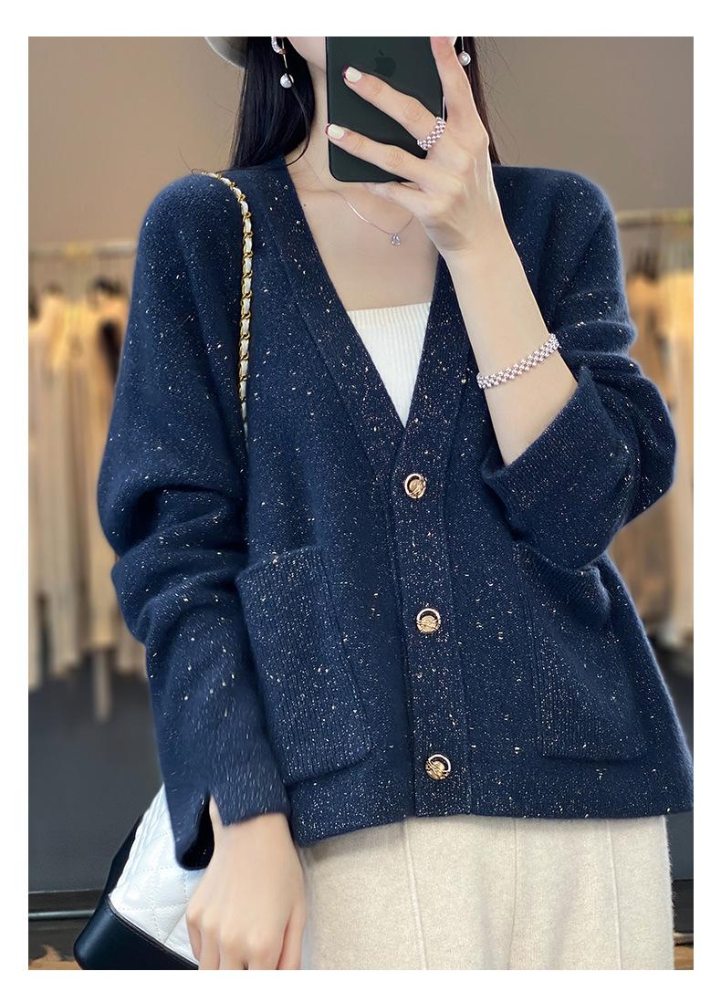24 Otoño e Invierno Nuevo Estilo Suéter 100 Lana Pura para Mujer Cuello en V Lazo Bolsillo Cárdigan Chaqueta Tejida Suéter Color Puro Top Casual