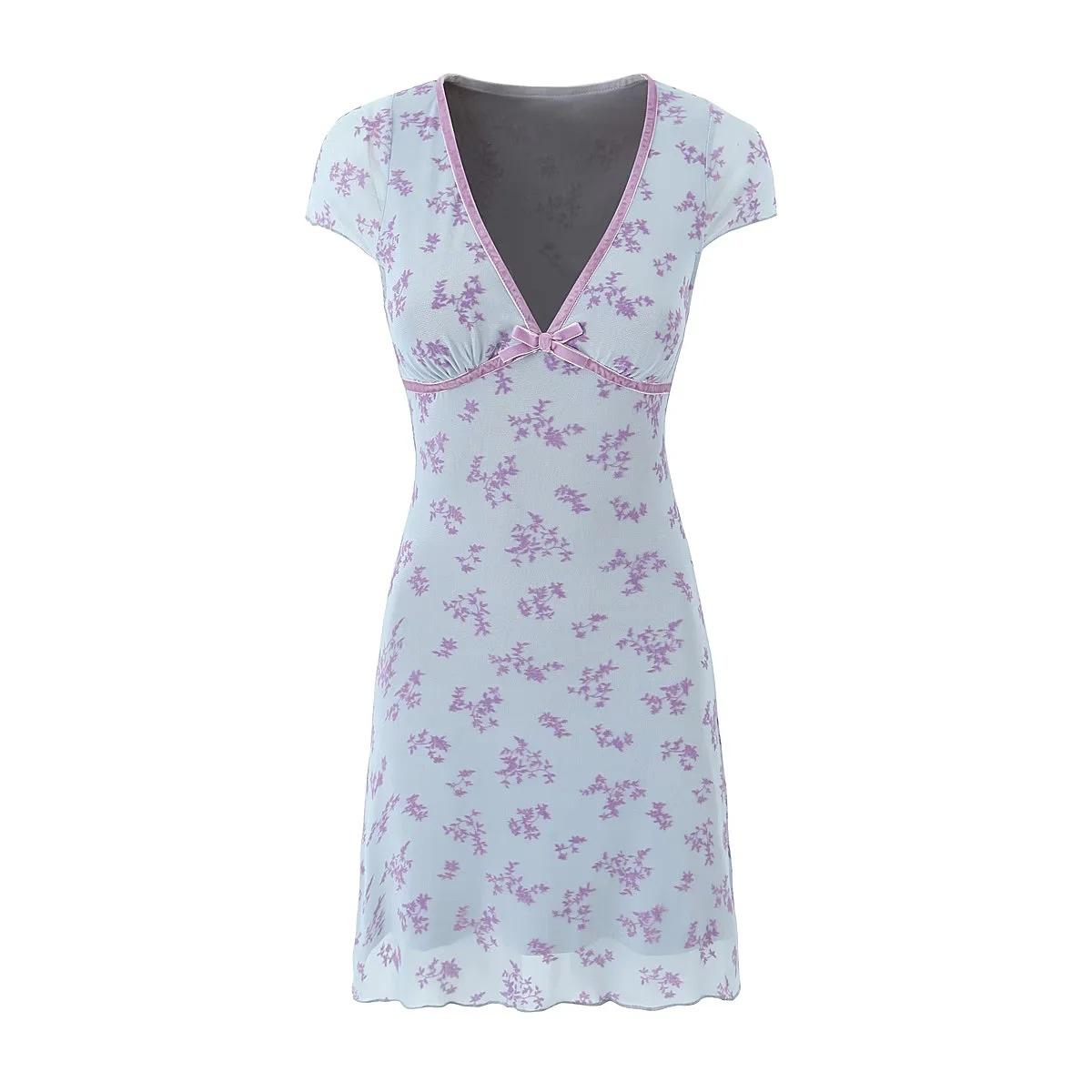 Vestido de verano 2024 con falda ajustada estampada de malla de estilo europeo y americano, vestido de manga corta con escote en V y cintura alta para chica sexy
